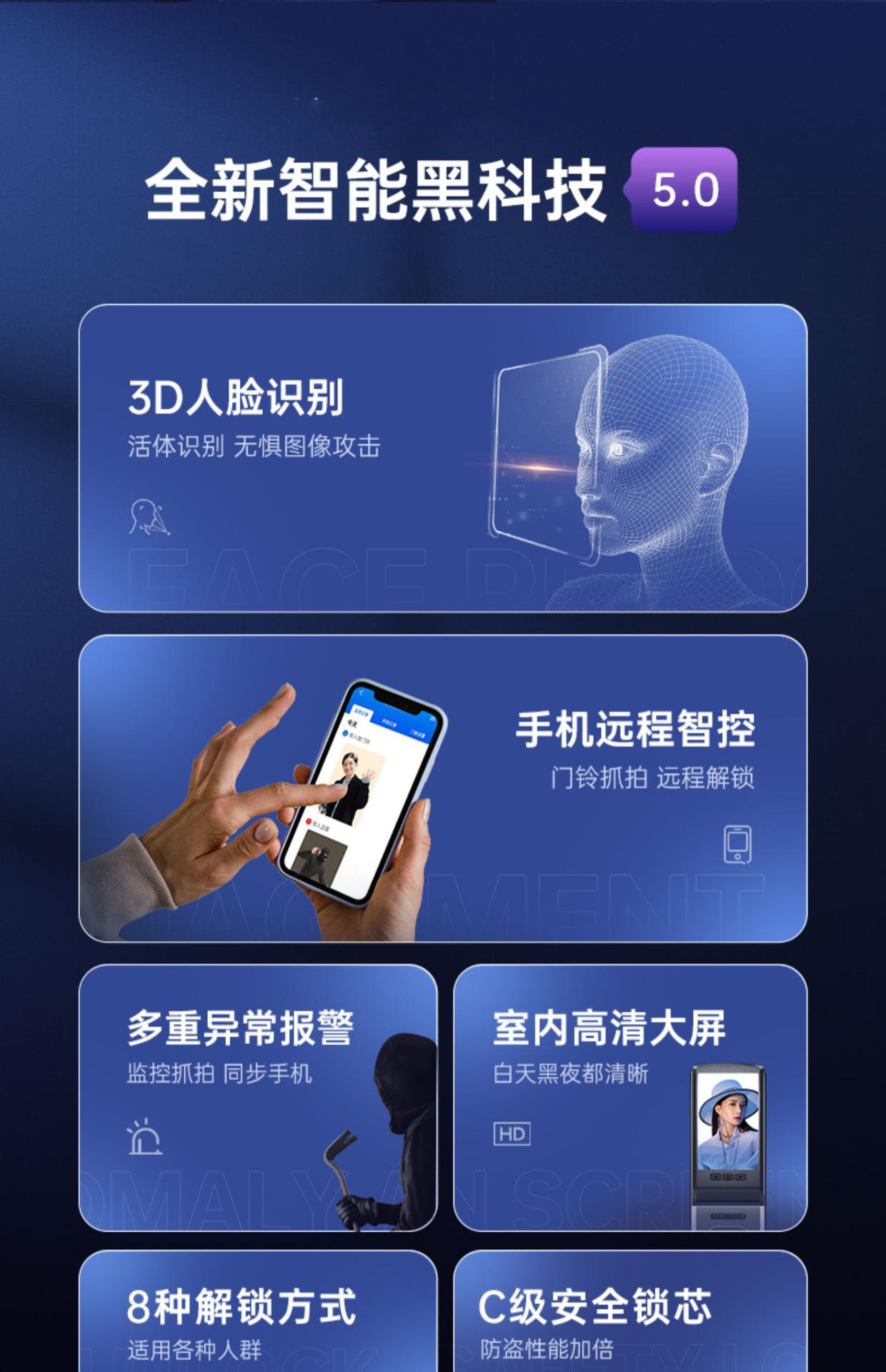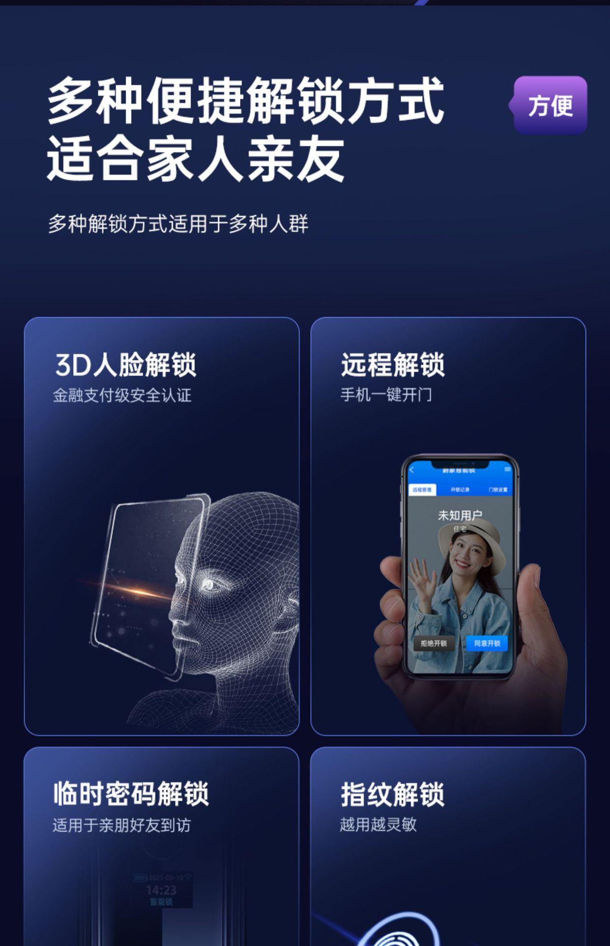 Fingerprint, Password, With key, visible cat's eye, face recognition, Remote Unlock