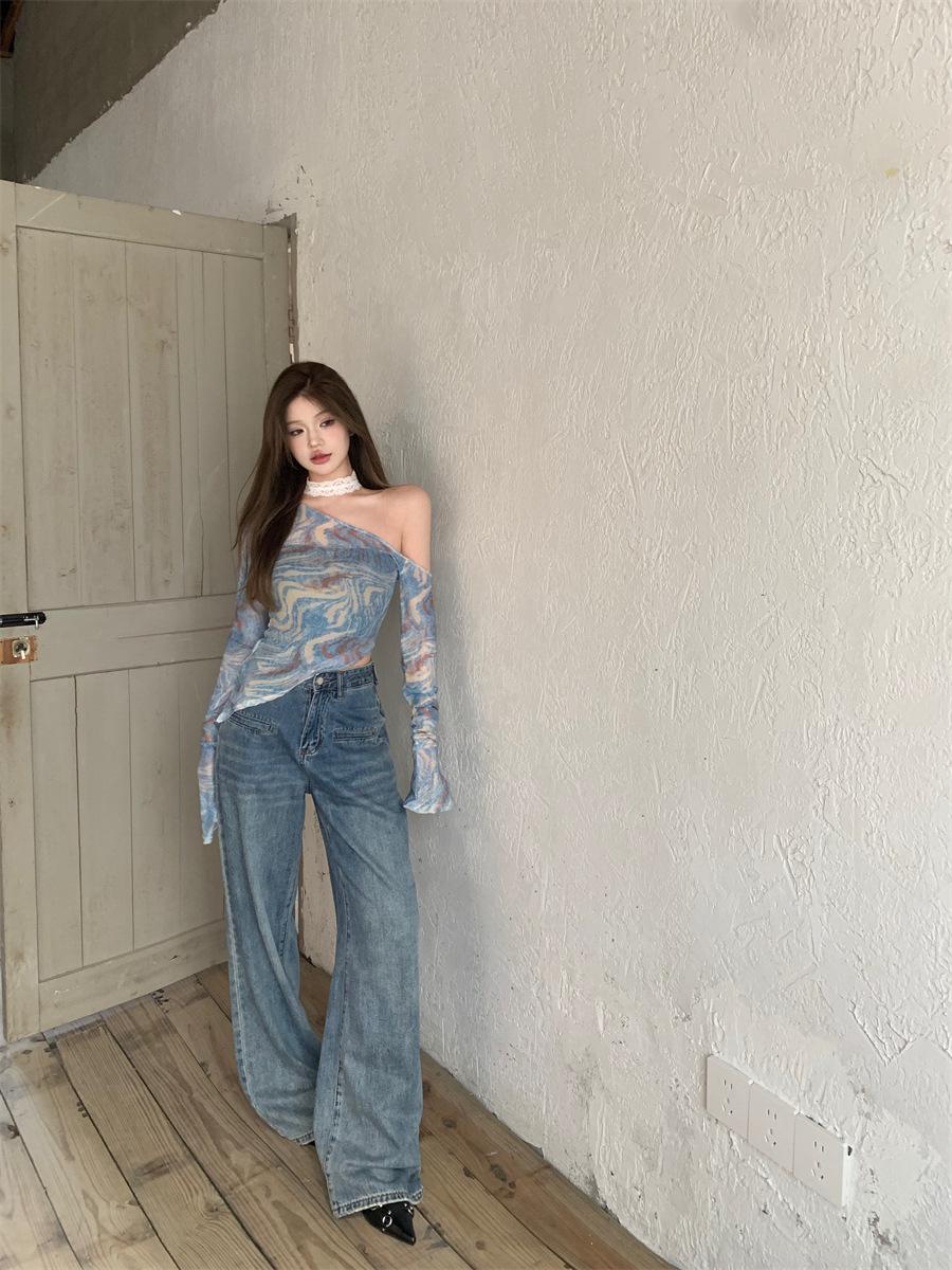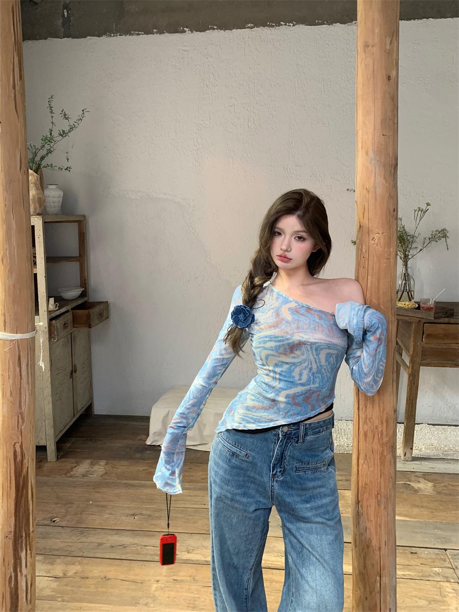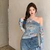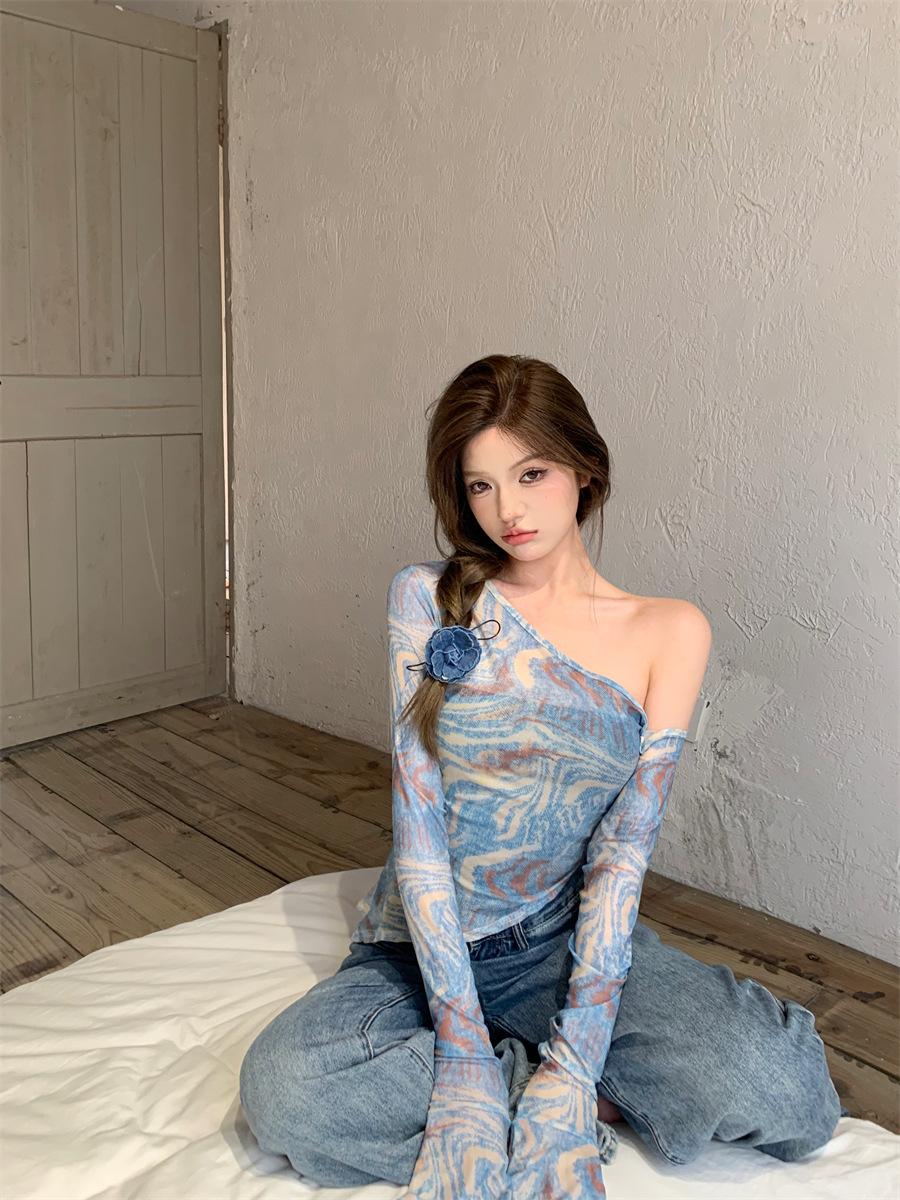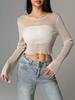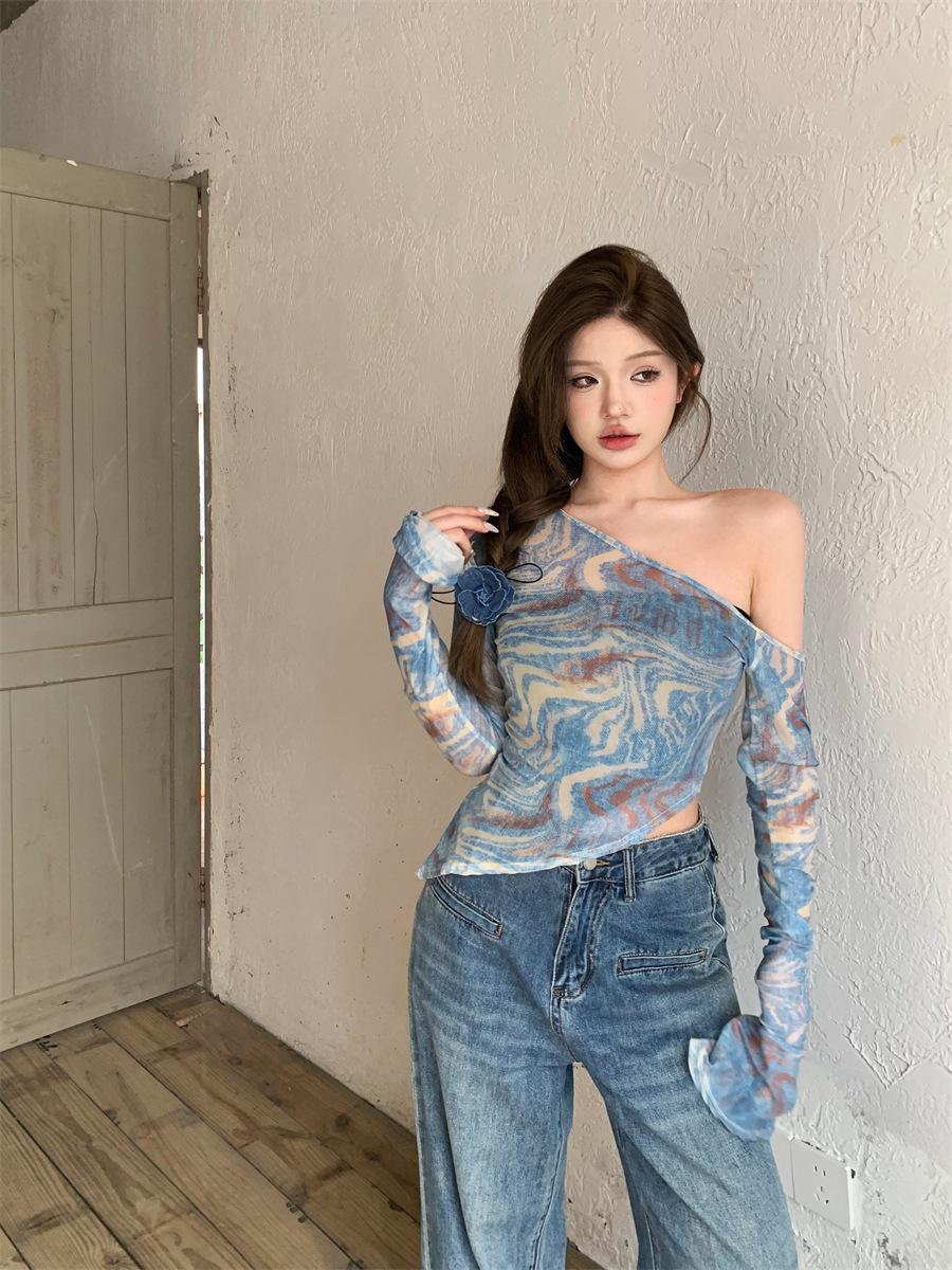 Spice Girls American Retro Off-shoulder Camiseta de manga comprida feminina Verão Irregular Slim-fit Sexy Sun-screen Mesh Blusa Top