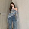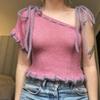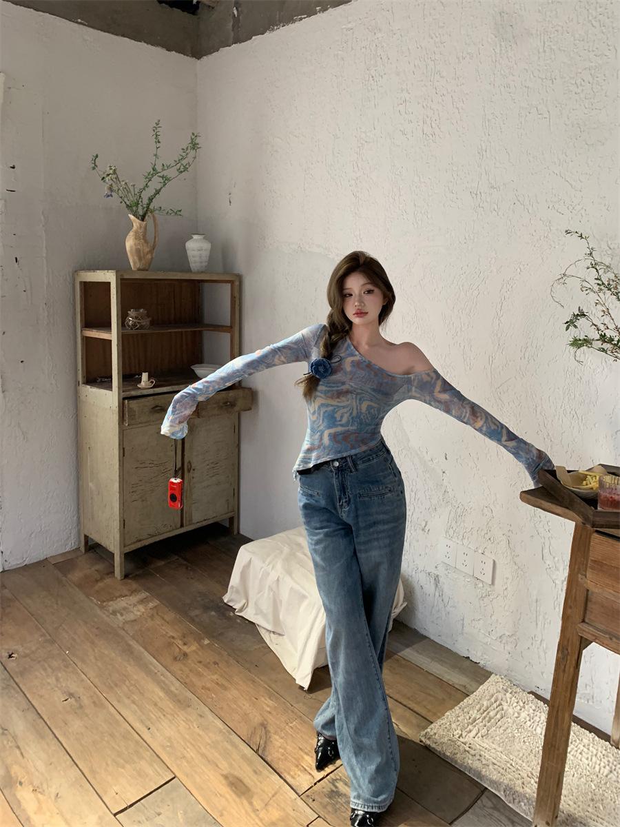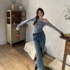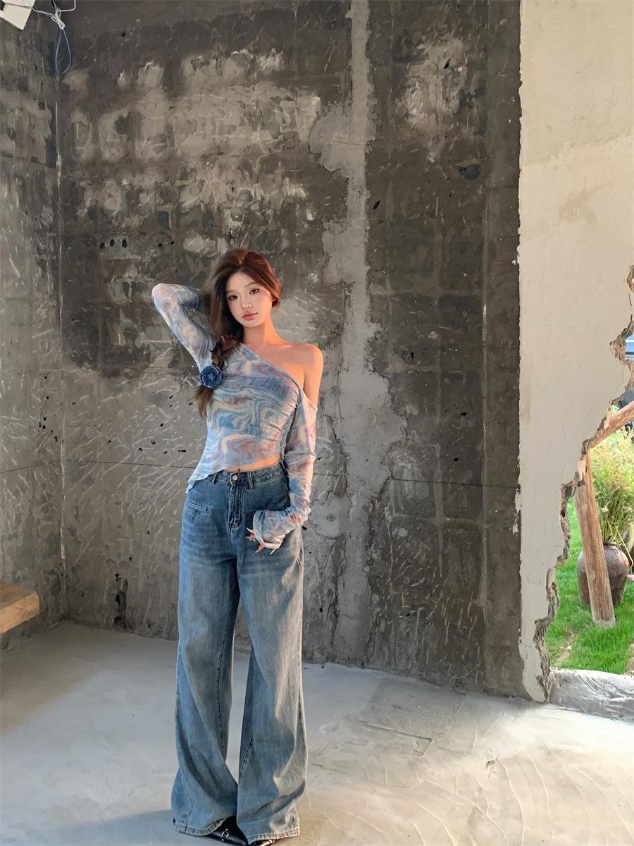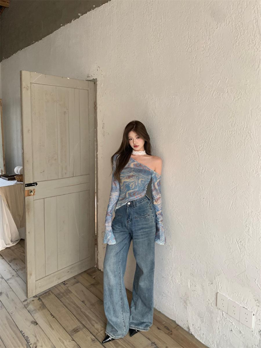 Spice Girls American Retro Off-shoulder Camiseta de manga comprida feminina Verão Irregular Slim-fit Sexy Sun-screen Mesh Blusa Top