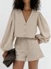 Algodão cáqui e linho bolha com decote em V terno de calças quentes de mangas compridas 2024 moda primavera europeia e americana novo conjunto de duas peças transfronteiriças