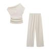 Conjunto de duas peças de moda outono europeia e americana, de algodão e linho branco, decote em V, manga curta, umbigo, top e calças quentes, 2024