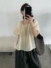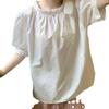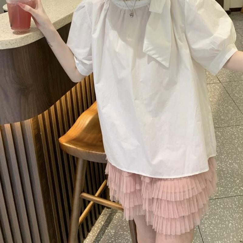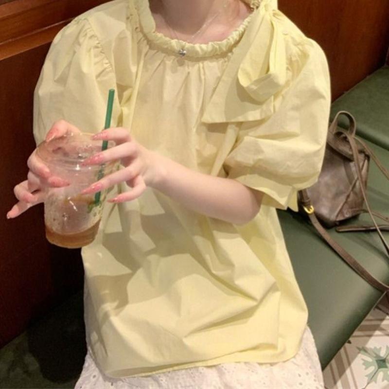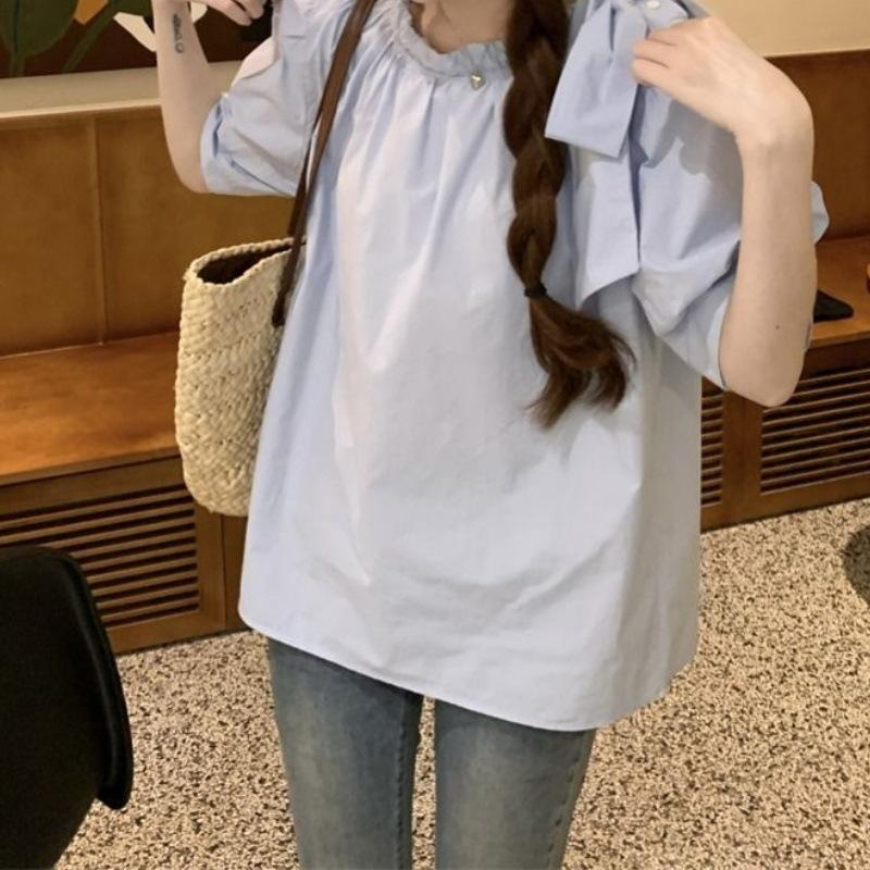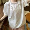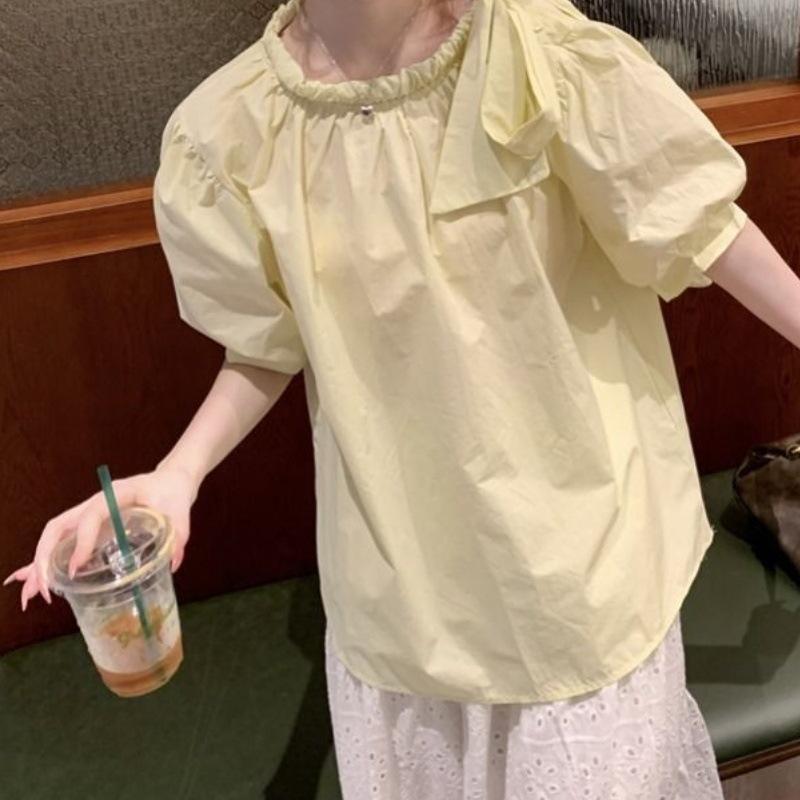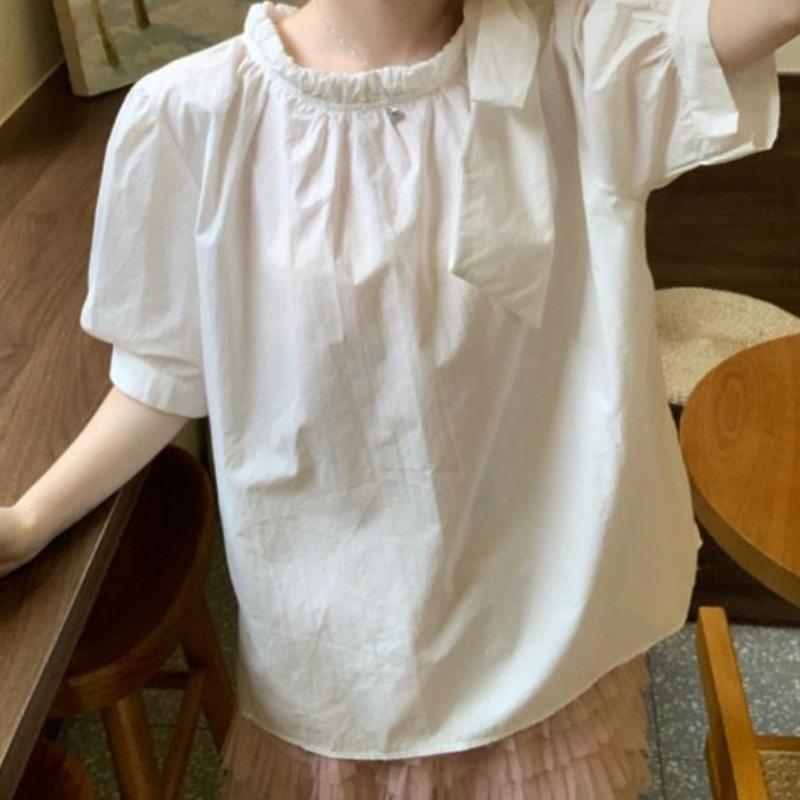 Verão Estilo Doce Laço de Amarrar Chique Manga Bufante Camisa 2025 Novo Top Feminino Solto de Manga Curta Cor Pura