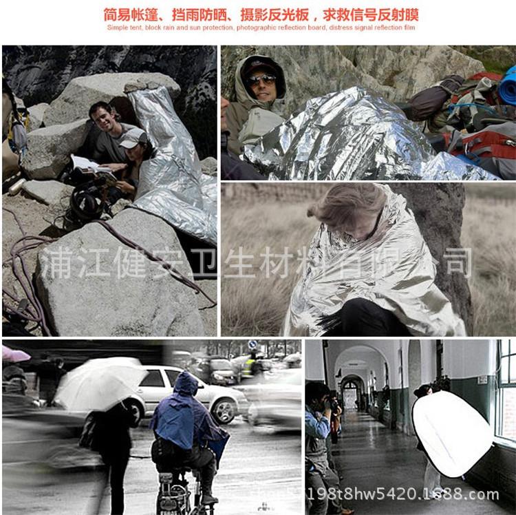 Cobertores de emergência são geralmente feitos de papel alumínio ou filme de alumínio, e são divididos em três tipos: ouro dupla face, prata dupla face e ouro e prata. Eles têm as funções de manter aquecido, à prova de frio e à prova de sol. Outro nome é cobertor à prova de sol ou cobertor à prova de frio