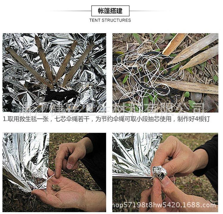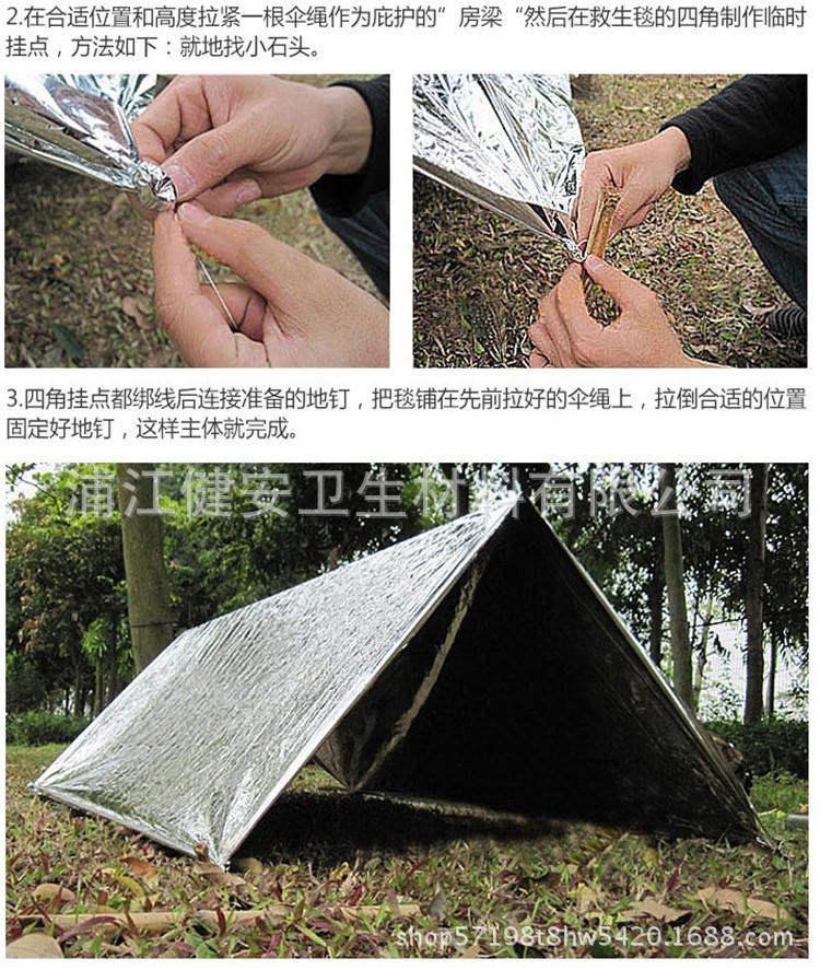 Este cobertor salva-vidas tem apenas o tamanho de uma palma quando dobrado, mas pode envolver todo o seu corpo quando desdobrado. A cor prateada do cobertor salva-vidas tem boa preservação de calor e efeitos refletivos (a reflexão pode ajudar o pessoal de emergência a encontrá-lo rapidamente na natureza). Além disso, é muito forte e à prova d'água, e é muito eficaz quando retirado para uso emergencial em dias chuvosos.