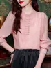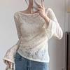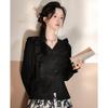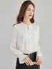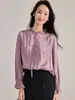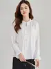 Design de gola redonda pequena com babados, revelando o decote, simples e elegante