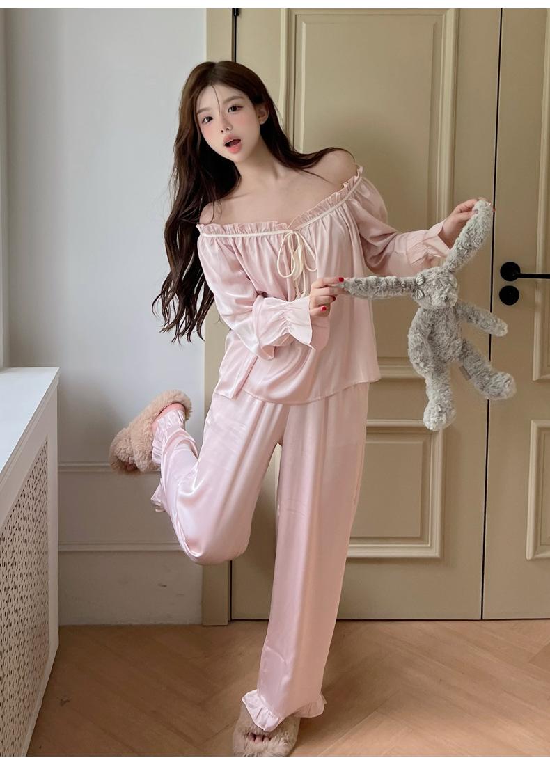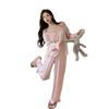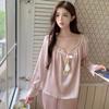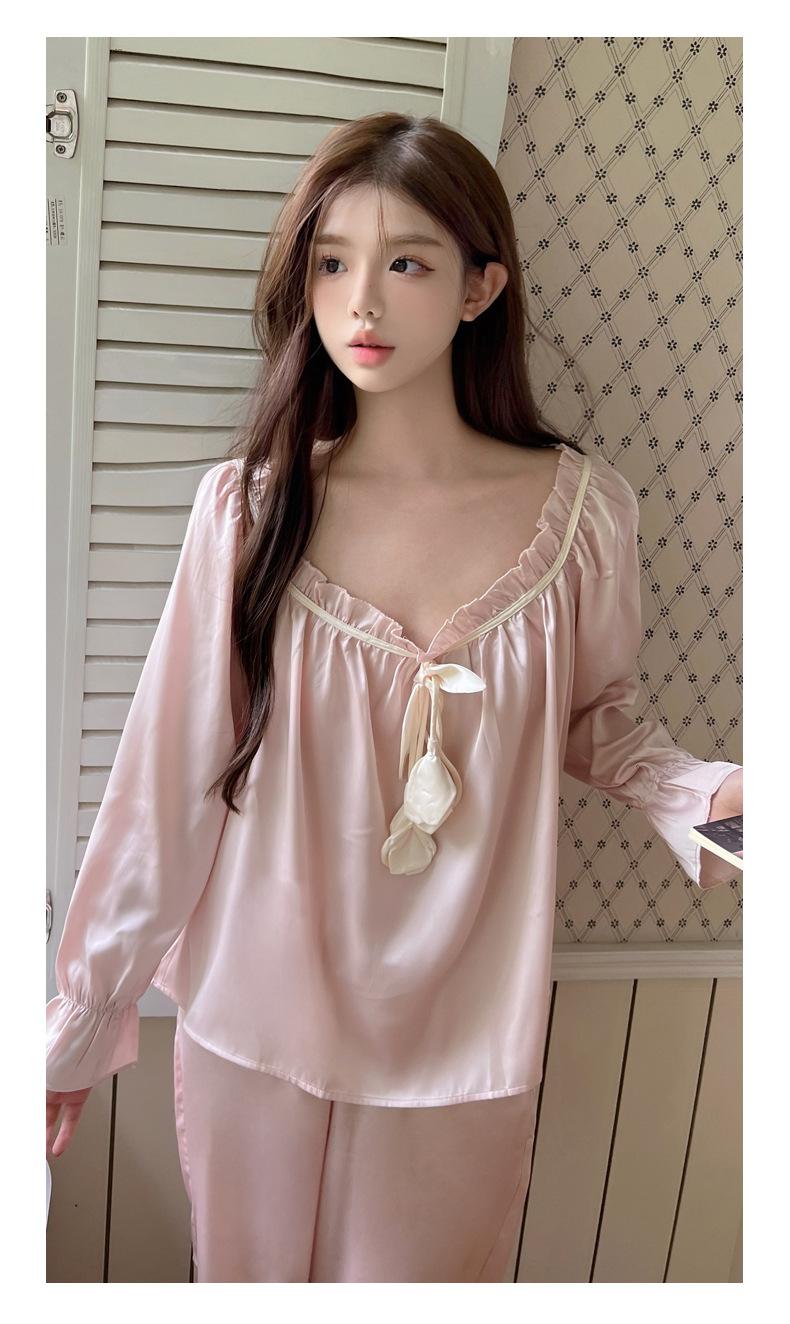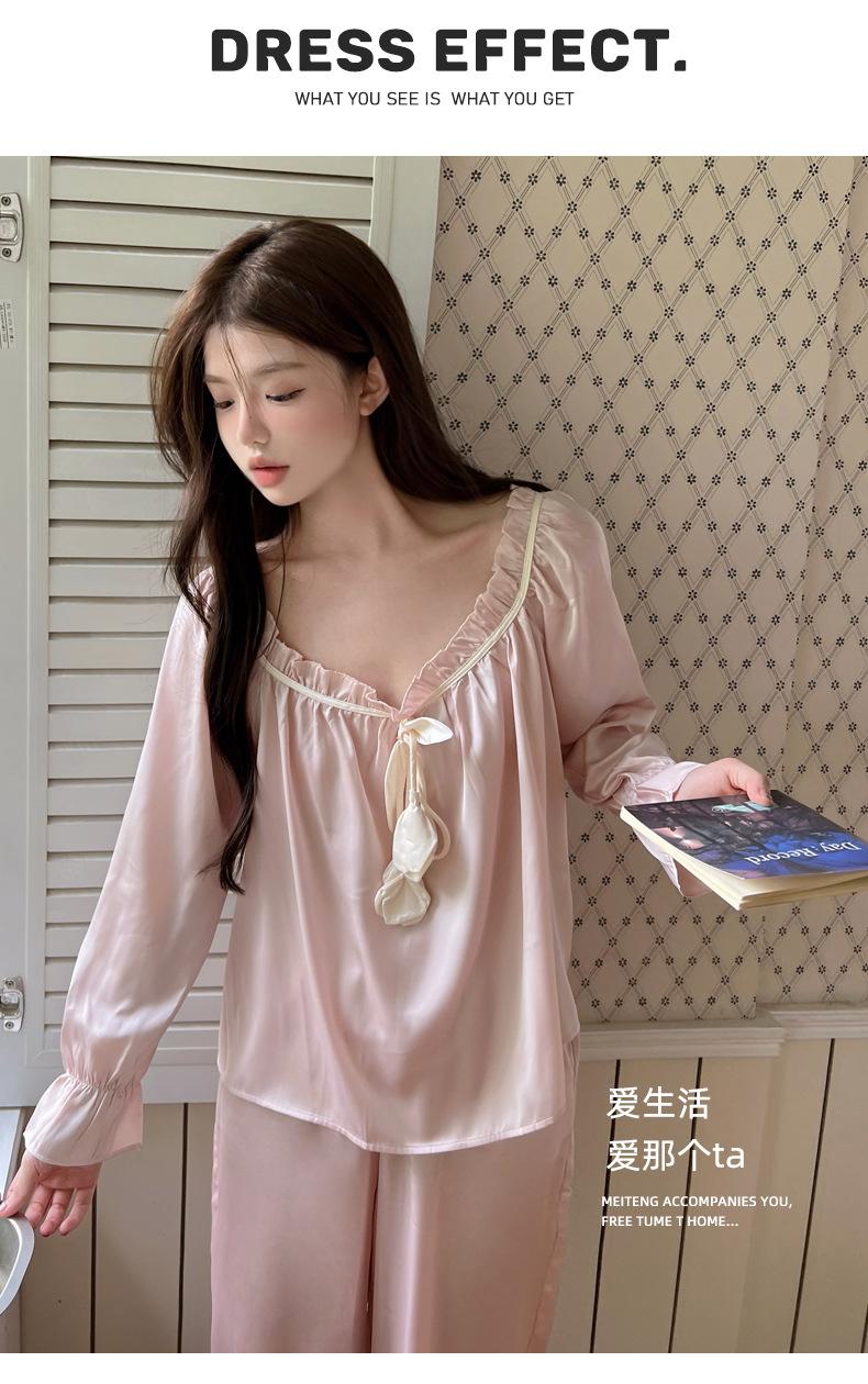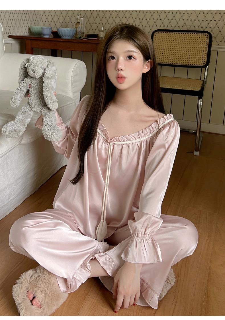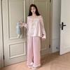 2024 Novo Pijama Francês Feminino Primavera e Outono Calças de Manga Comprida Terno de Seda de Gelo Ombro de Fada Roupas Femininas para Casa