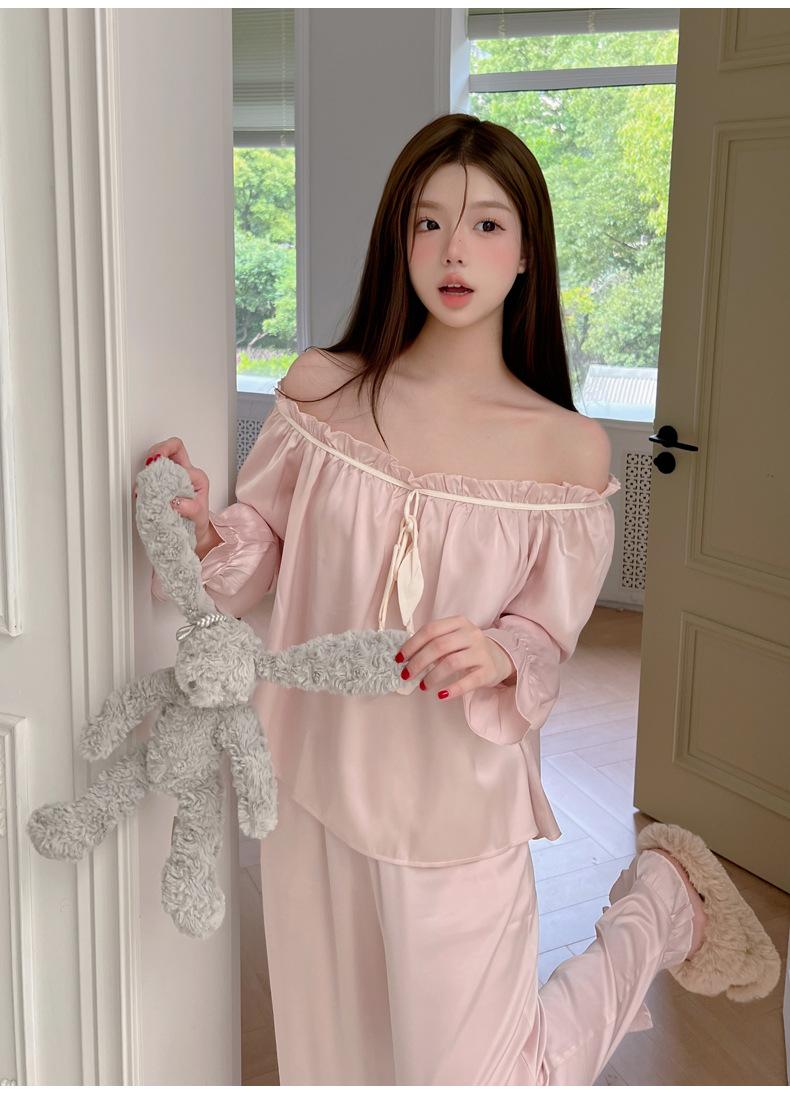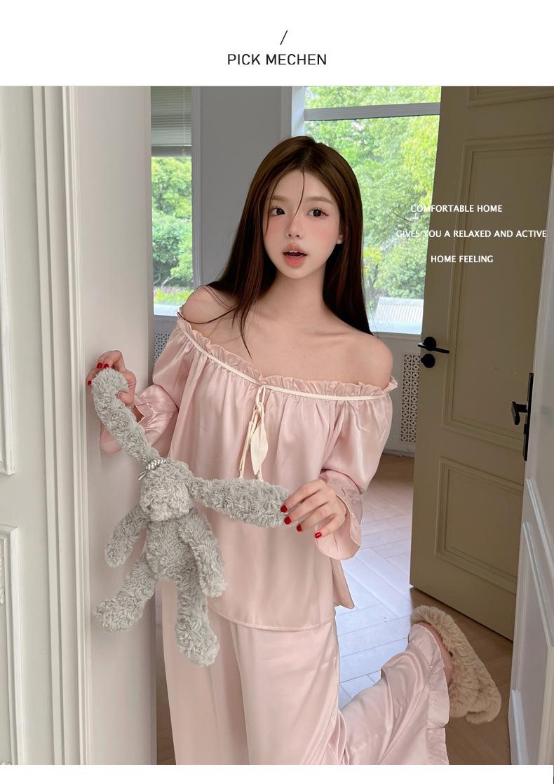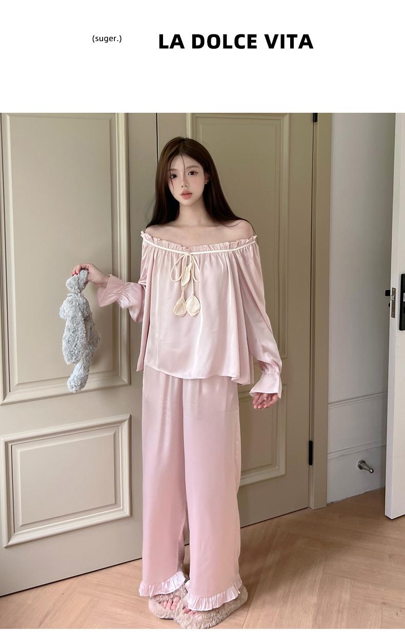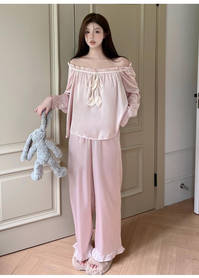 2024 Novo Pijama Francês Feminino Primavera e Outono Calças de Manga Comprida Terno de Seda de Gelo Ombro de Fada Roupas Femininas para Casa