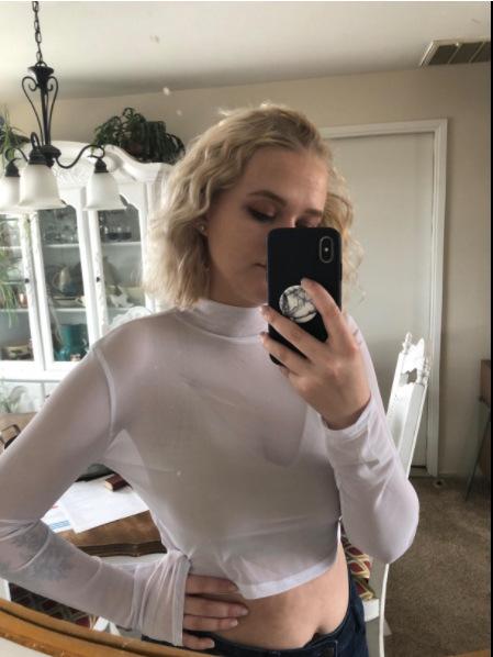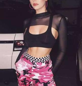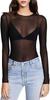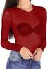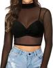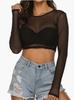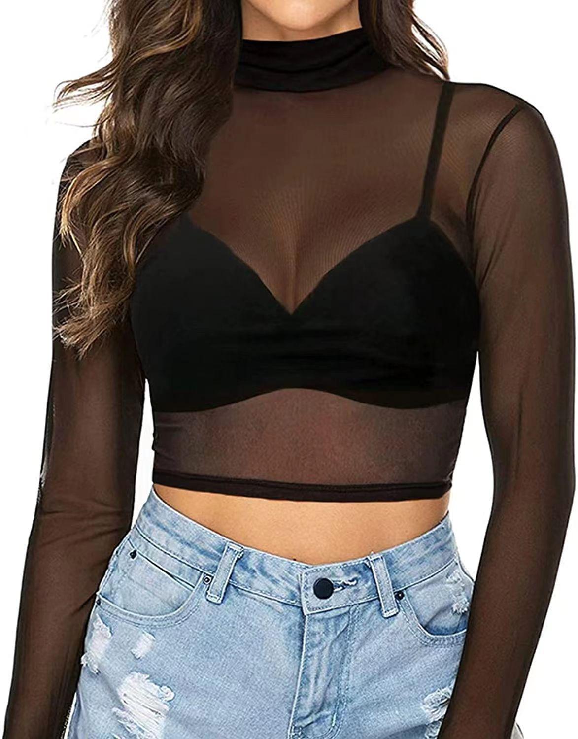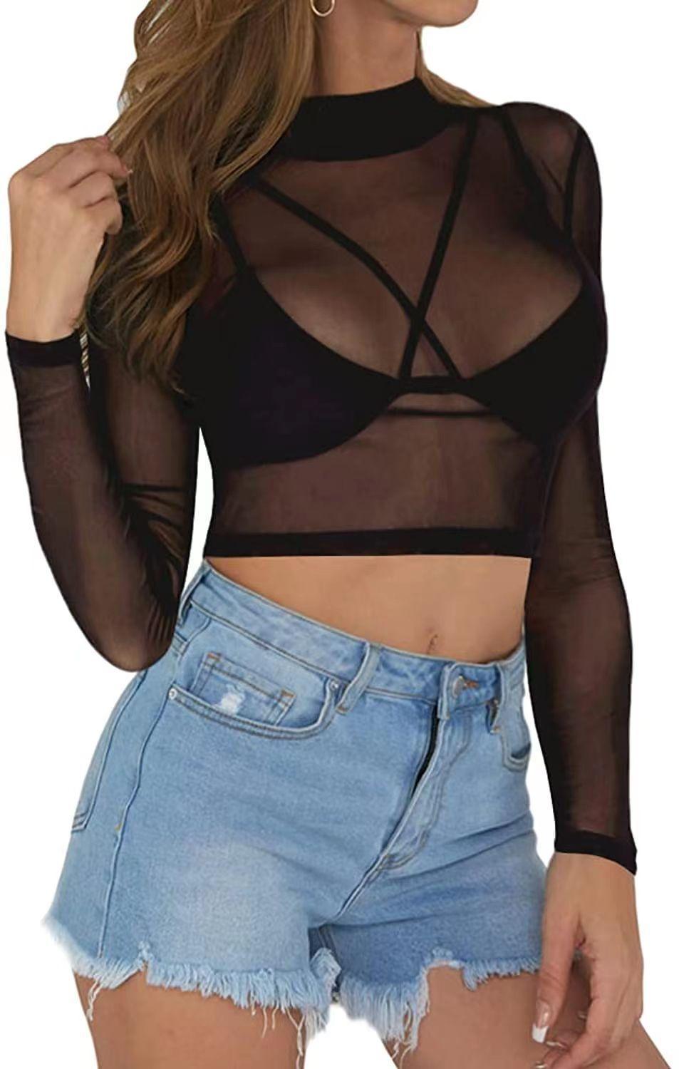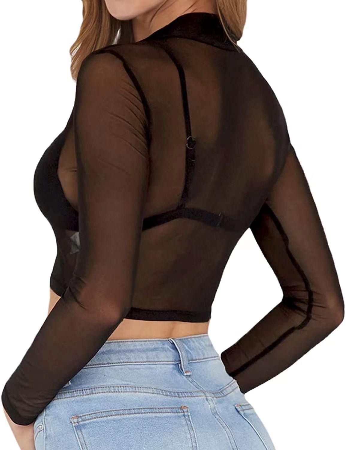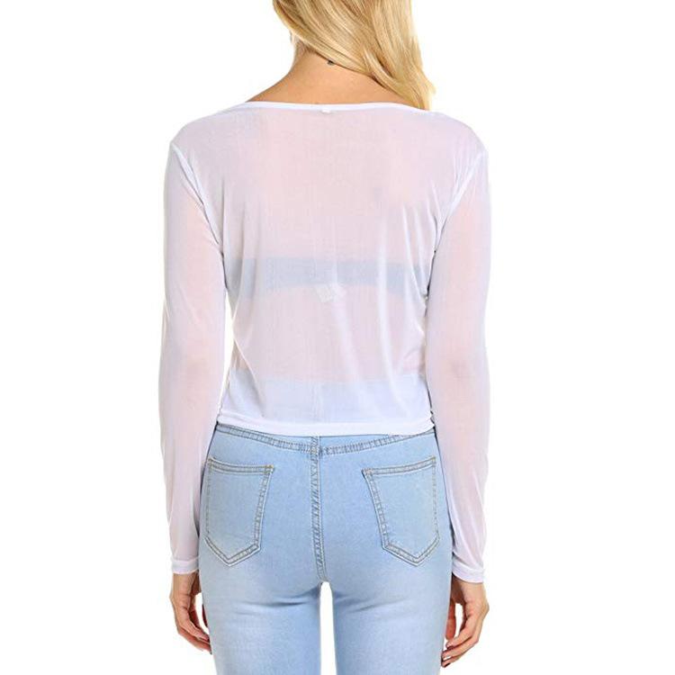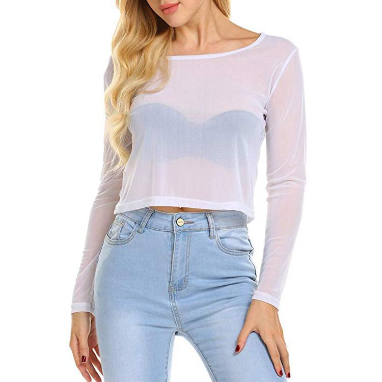 Amazon Blusa Feminina Curta Manga Comprida Transparente Mesh Umbigo Camiseta Camisa Camiseta Feminina Mesh Poliéster (