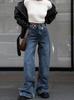 Calças europeias e americanas transfronteiriças deslocamento jeans design de outono feminino cintura alta calças retas divididas comércio exterior personalizado feminino