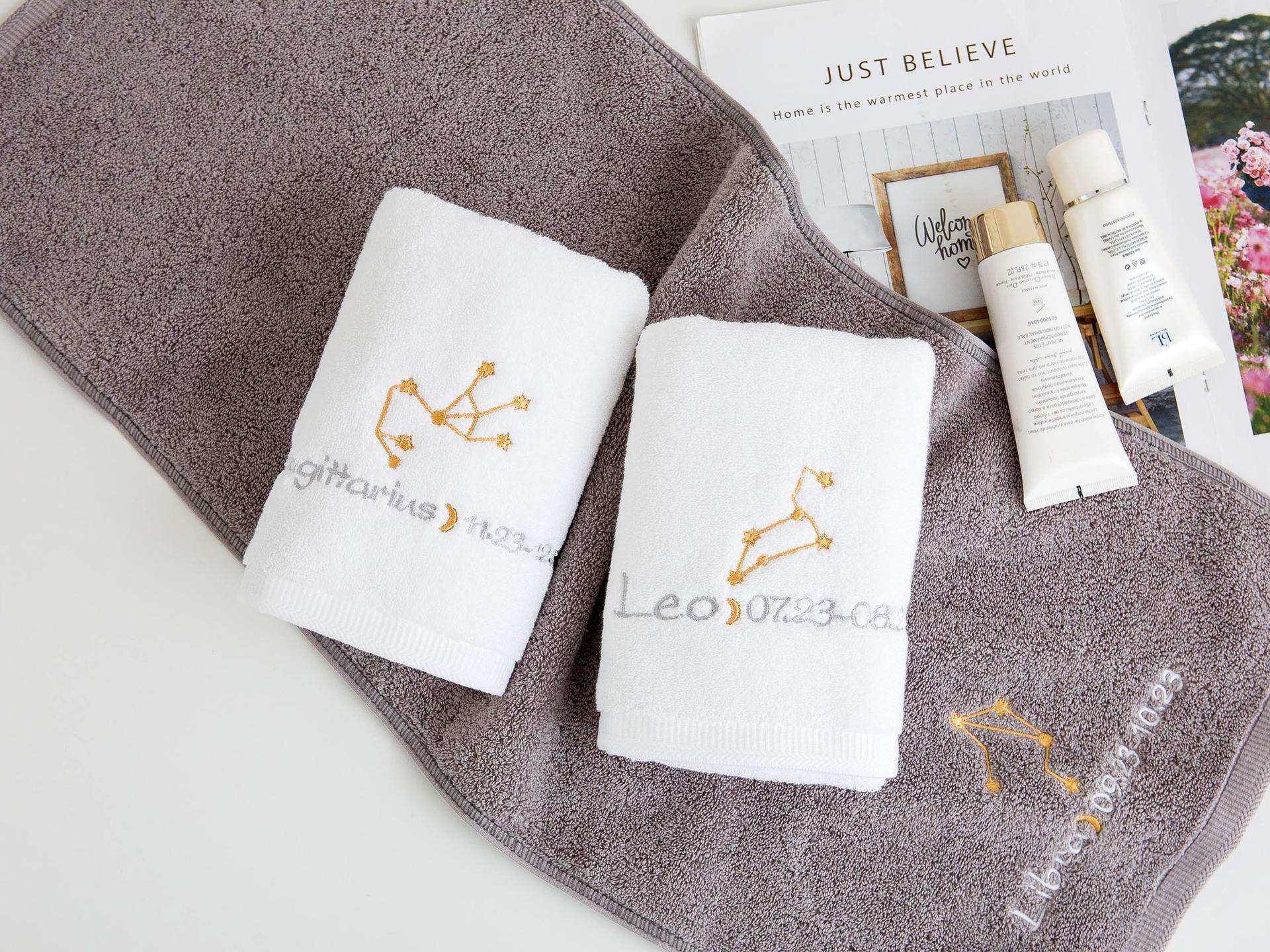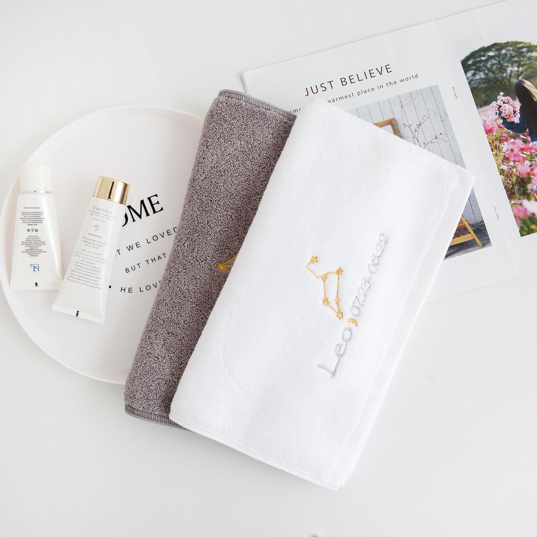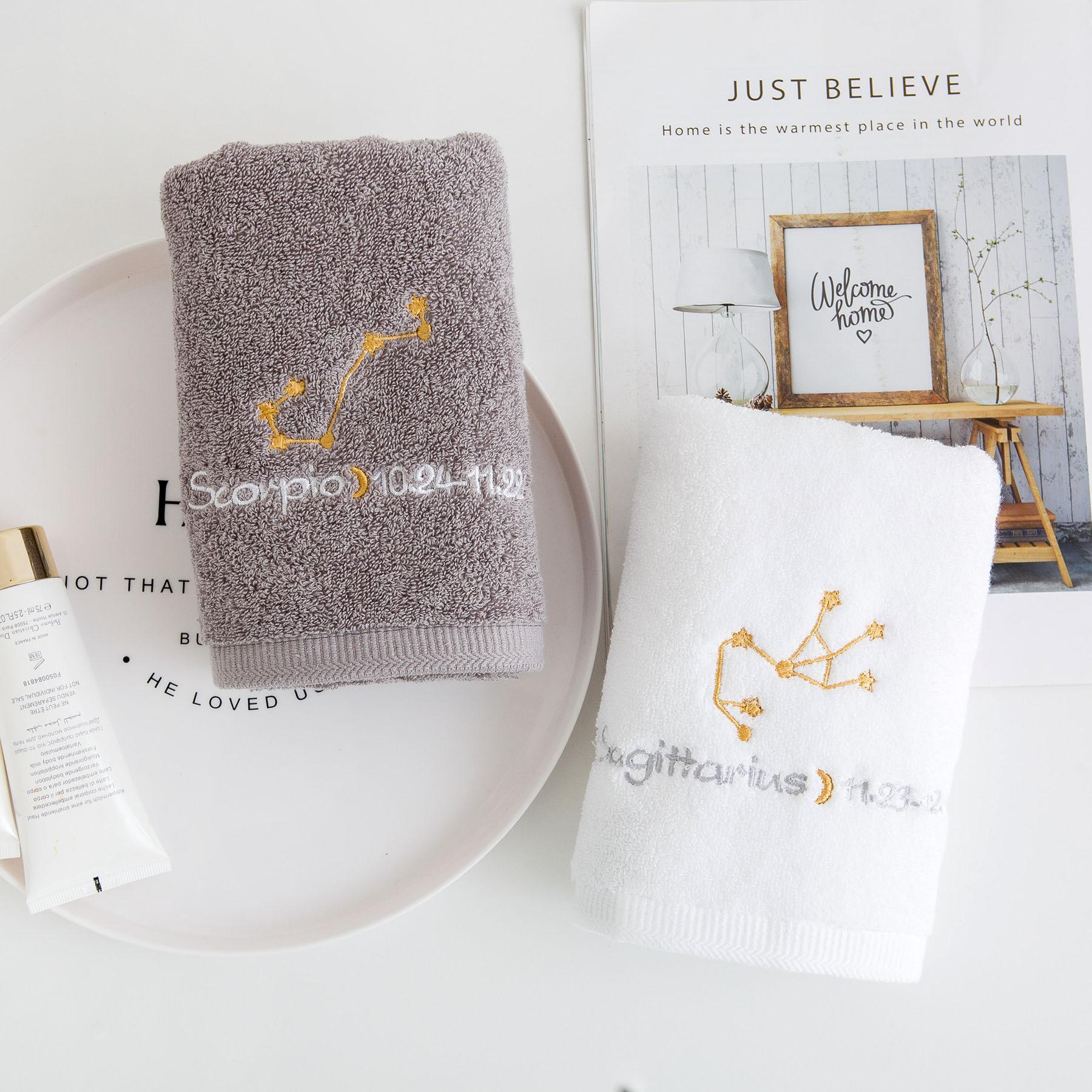 Ponto de venda do produto: Esta é uma toalha da série 12-zodiac, tecida em algodão paquistanês, com boa absorção de água e maciez. Impressão e tingimento ecologicamente corretos combinados com tecnologia de polimento, sem fiapos e sem desbotamento. O bordado requintado da constelação é o toque final desta toalha de banho. O padrão do bordado é composto de quatro partes: o mapa astrológico da constelação 12-zodiac, o nome em inglês da constelação, a lua e a data correspondente da constelação. É lindo e tem um significado muito exclusivo. O branco e o cinza clássicos são usados na seleção de cores, o que é adequado para uma gama mais ampla de grupos.