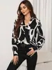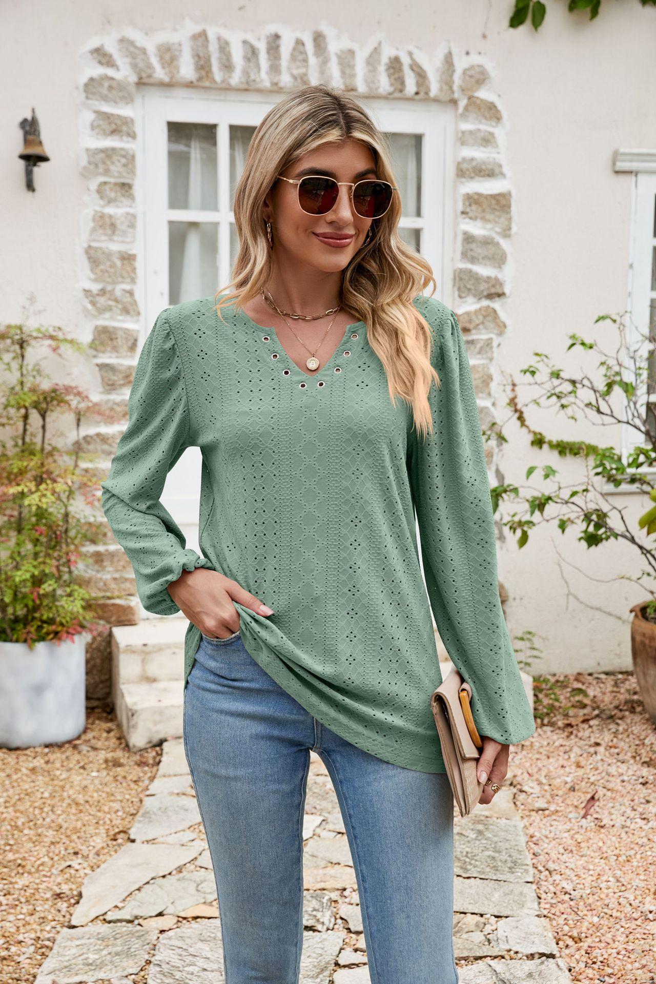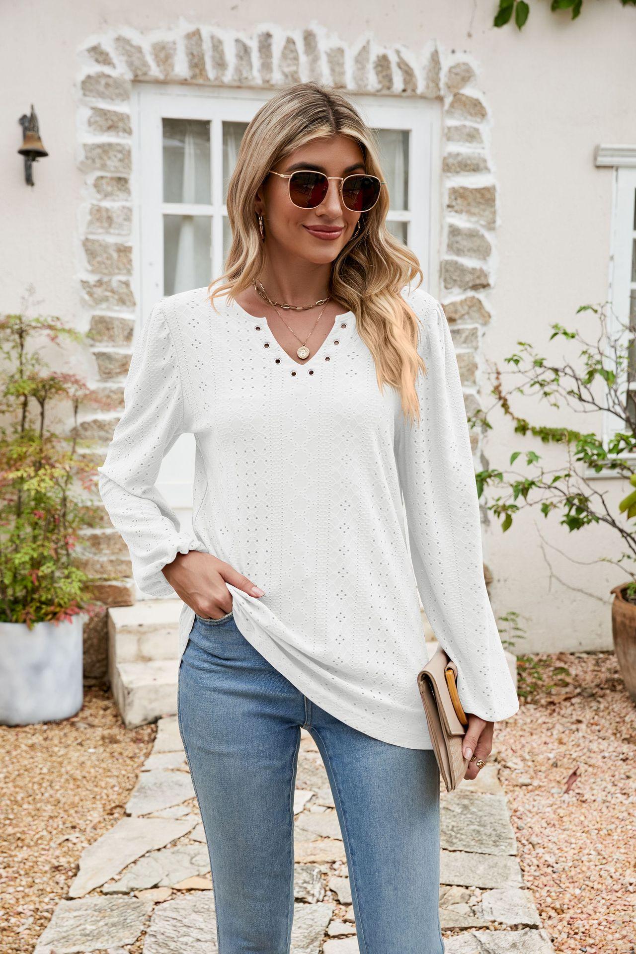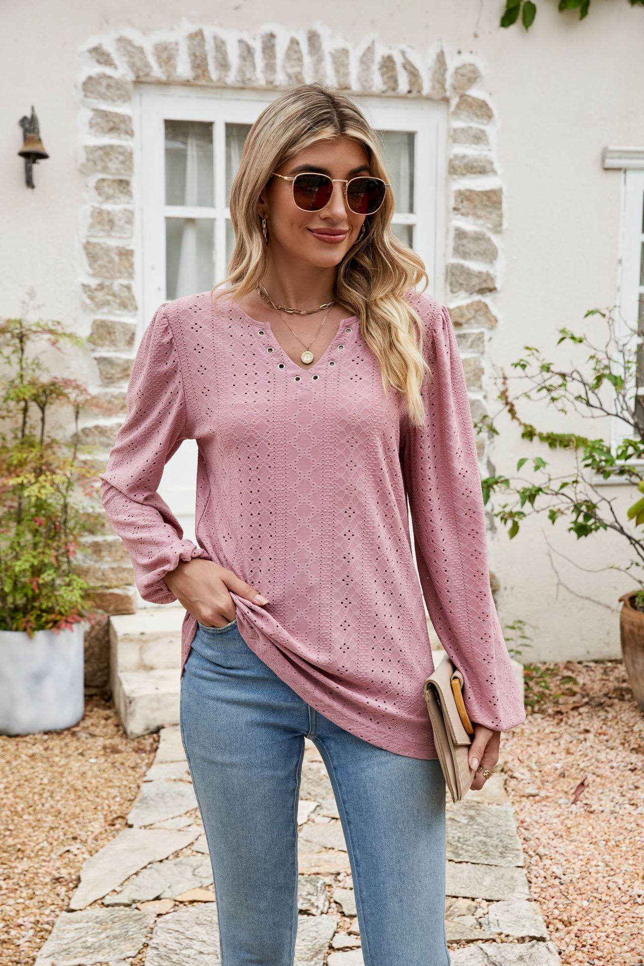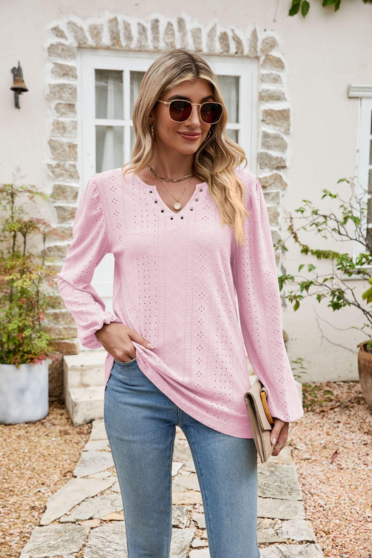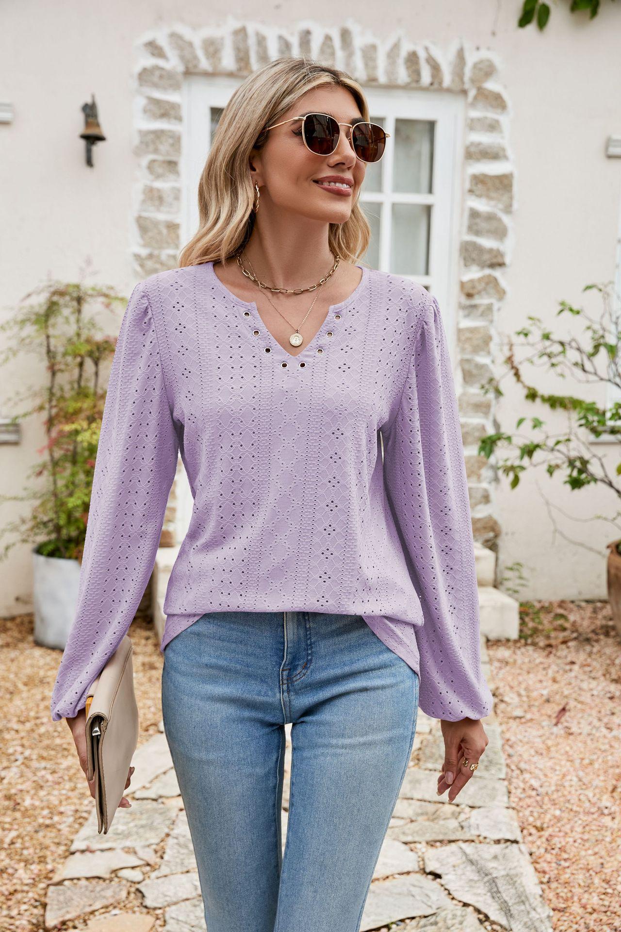 Amazon 2024 Comércio exterior transfronteiriço europeu e americano nova moda com decote em V botão oco solto camiseta de manga comprida top para mulheres