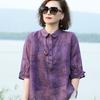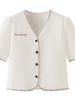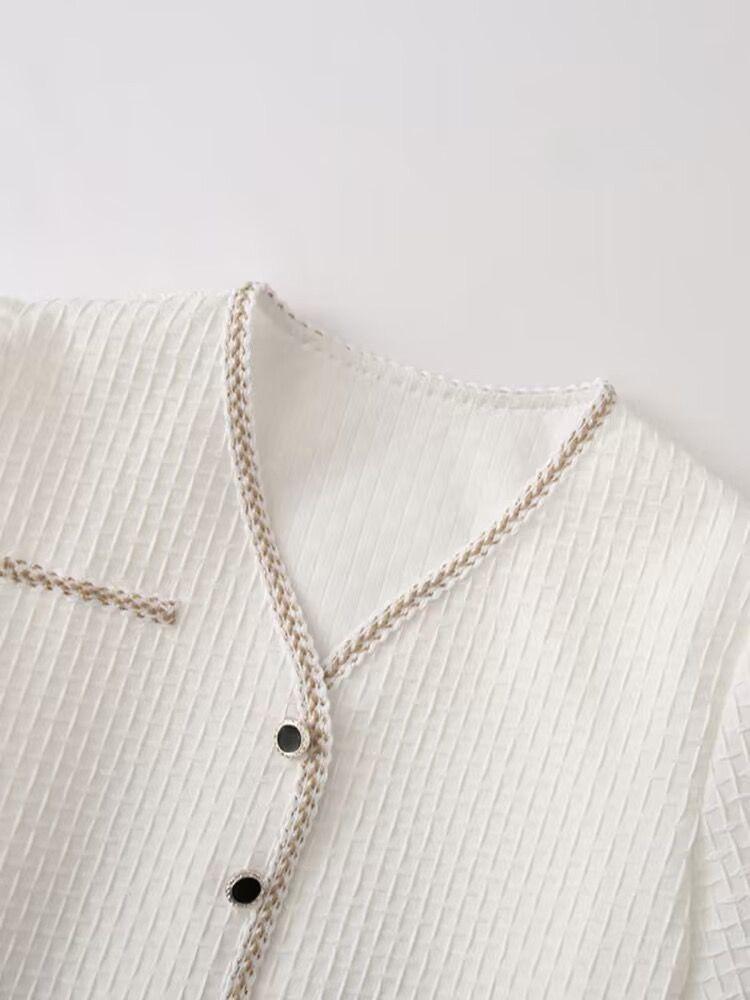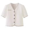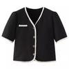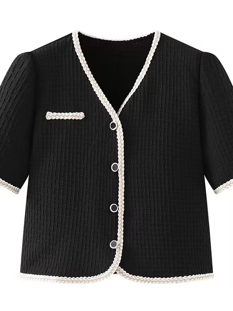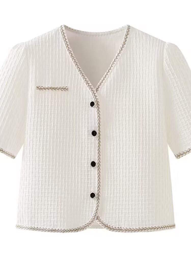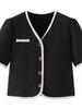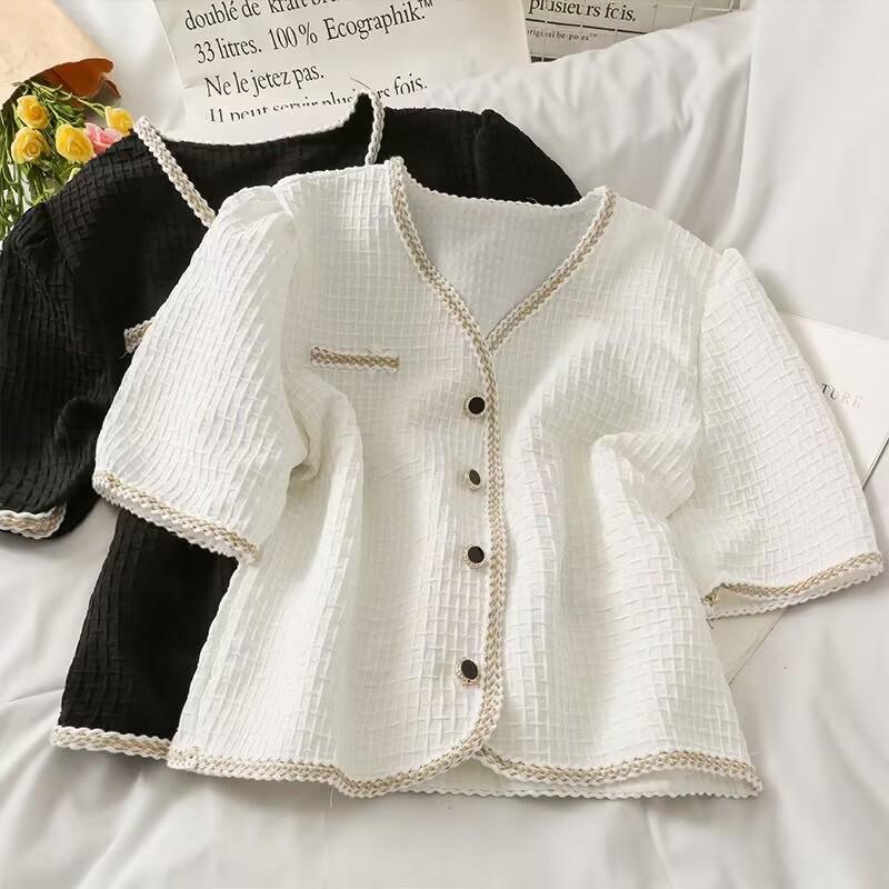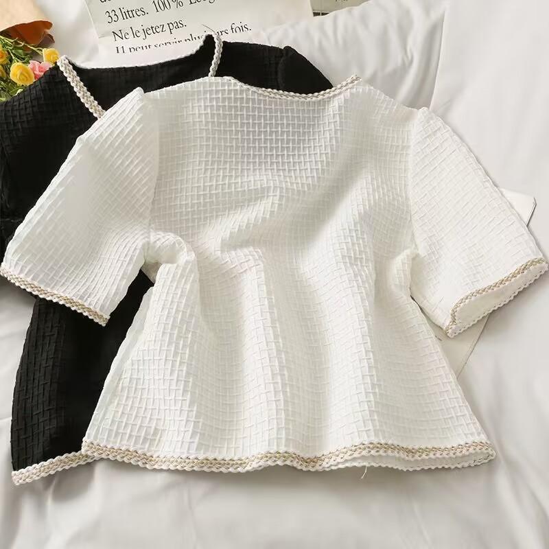 Camisa Xadrez de Manga Curta Estilo Francês com Borda de Seda Brilhante para Mulheres, Novo Estilo Verão 2025, Versátil, Top Ajustado e Valorizador