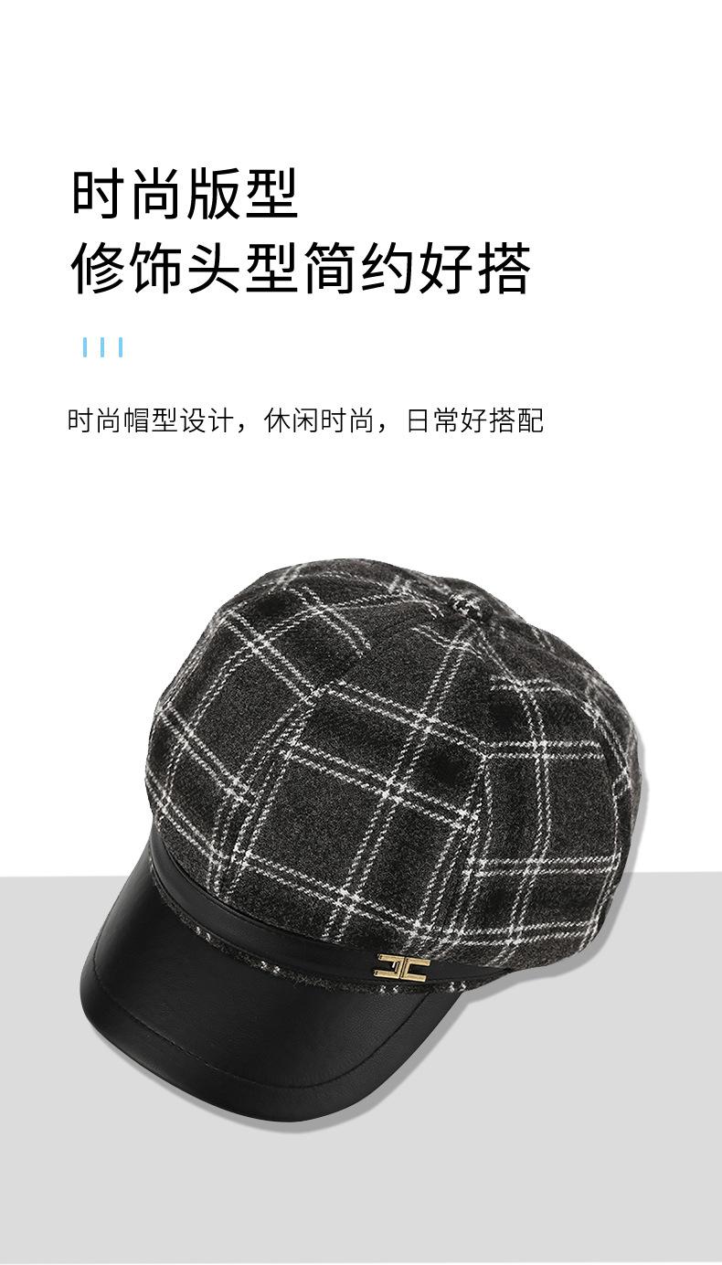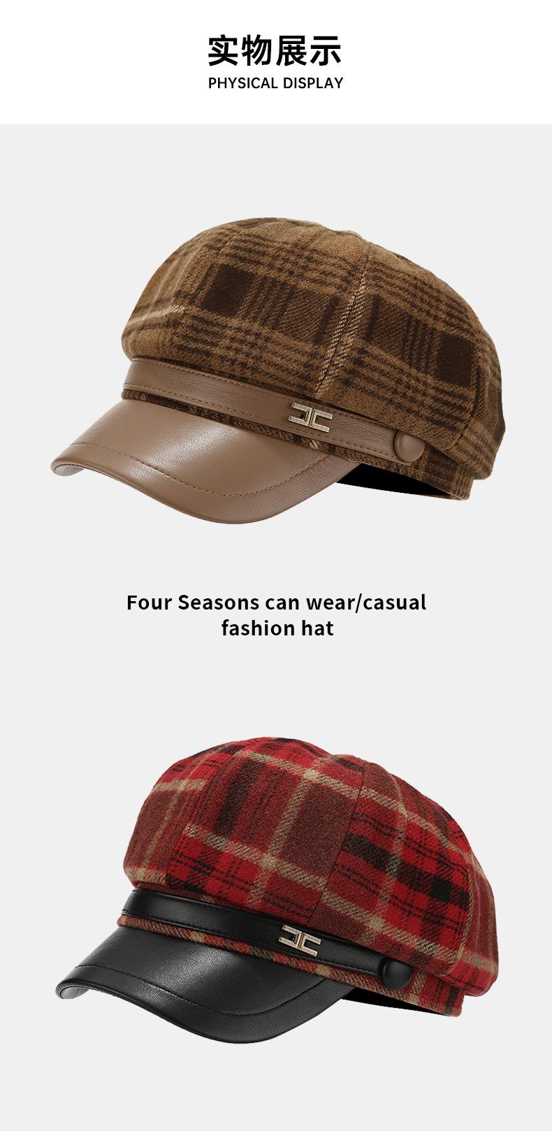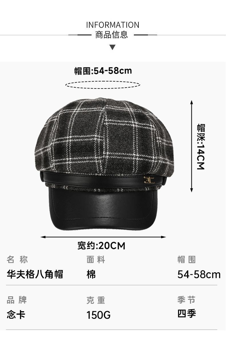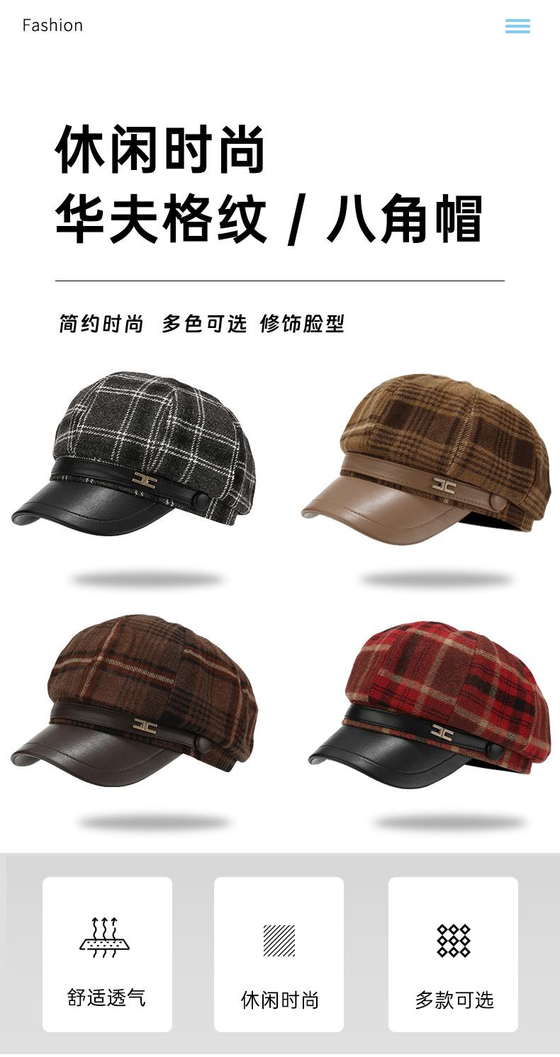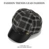 Chapéu Estilo Coreano Feminino Outono e Inverno Nova Chegada Fina Xadrez Couro Brim Boina Retro Face Mostrado Pequeno All-Match Moda Octogonal Chapéu