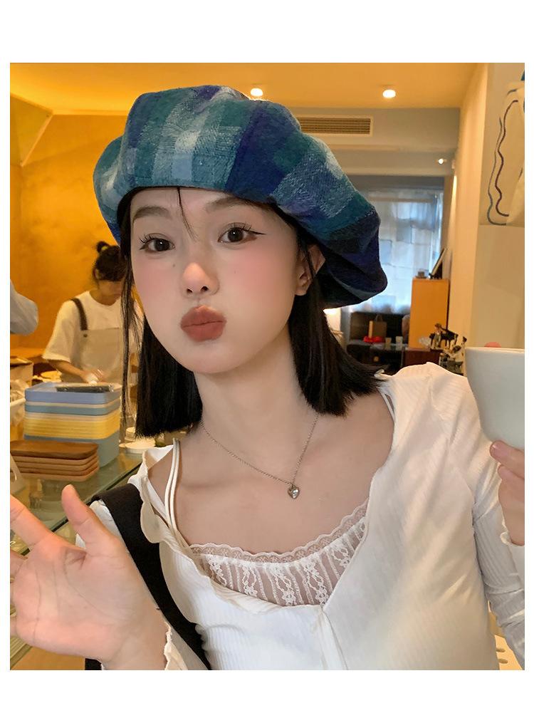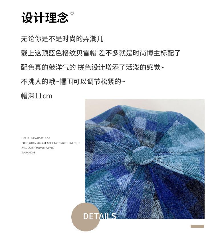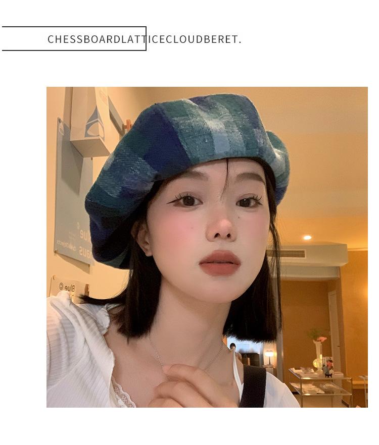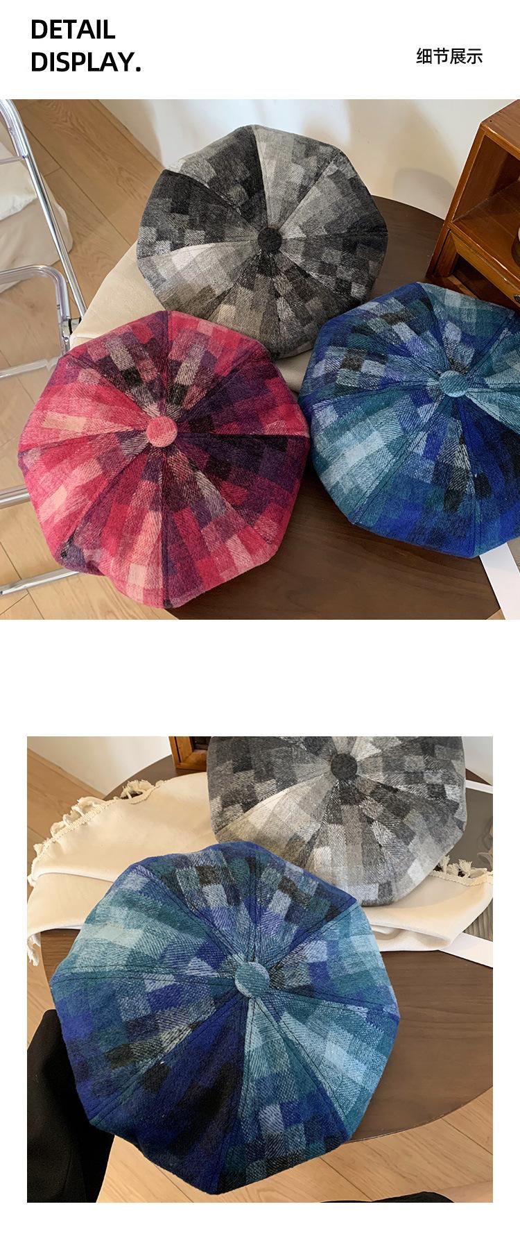 Chapéu de nuvem xadrez japonês vintage, combinando todas as cores, rosto feminino, mostrando pequeno chapéu de pintor Bei Lei, circunferência da cabeça grande, chapéu octogonal moderno