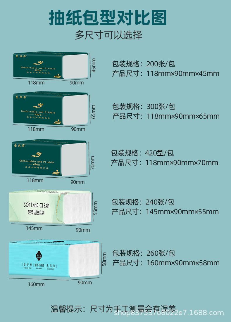 Dark green 30 packs (300 sheets/4 layers), Pink 30 pack (300 sheets/4 layers), Blue and white 30 packs (300 sheets/4 layers)