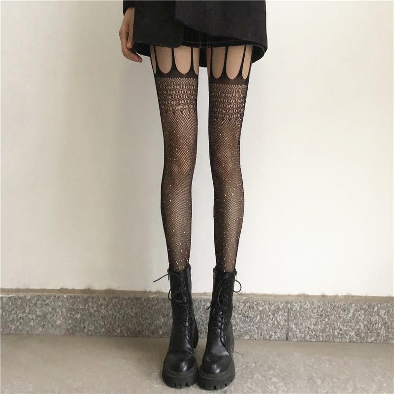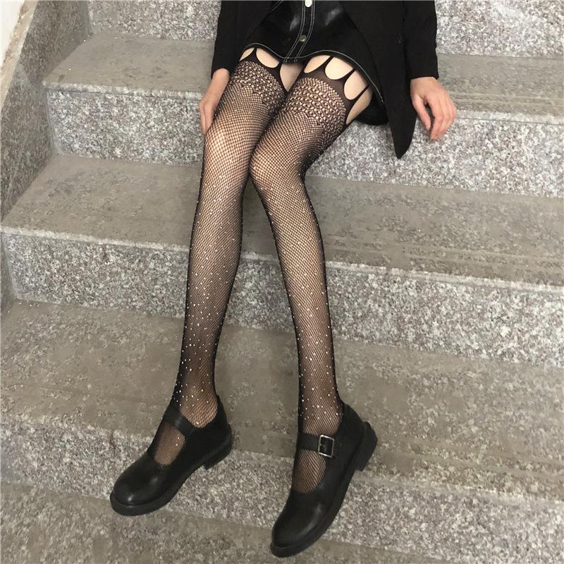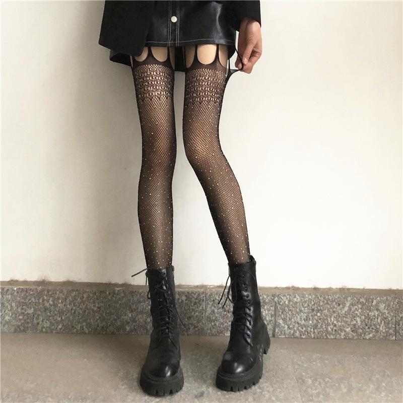 Internet Celebridade com Diamante Lace Strap Meias de Seda Meias de Rede Fishernet Meias de Seda Pretas Meia-Calça Fina Sexy Ins Na Moda