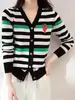 Pequeno Hong Kong Estilo Vintage Leite Estilo Desgaste Cardigan Fino Listrado Manga Comprida Suéter de Malha Casual All-match Cor Listrada Suéter