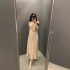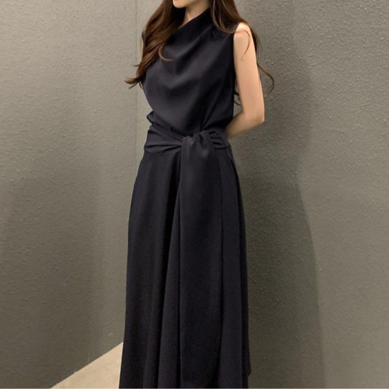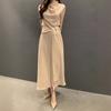 Vestido de Verão para Mulheres Chic Coreano Elegante Francês Gola Alta Alça Cintura Afunilada Look Emagrecedor Sem Mangas Colete Saia Midi
