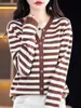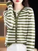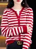 Coreano listrado cor combinando falso de duas peças Andy veludo malha cardigã mulheres em torno do pescoço solto casual manga comprida fivela casaco