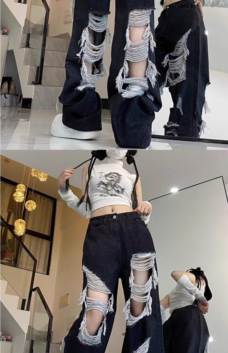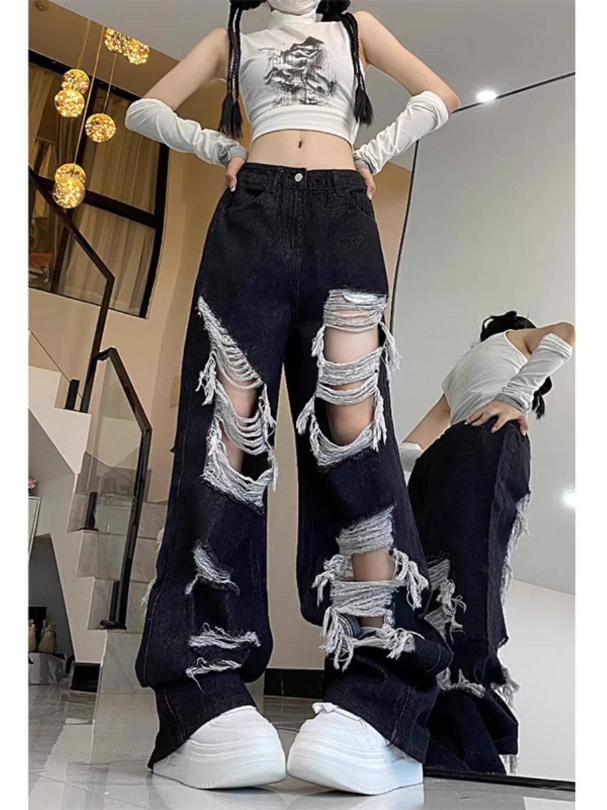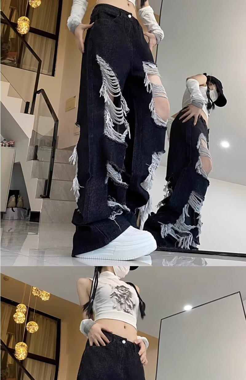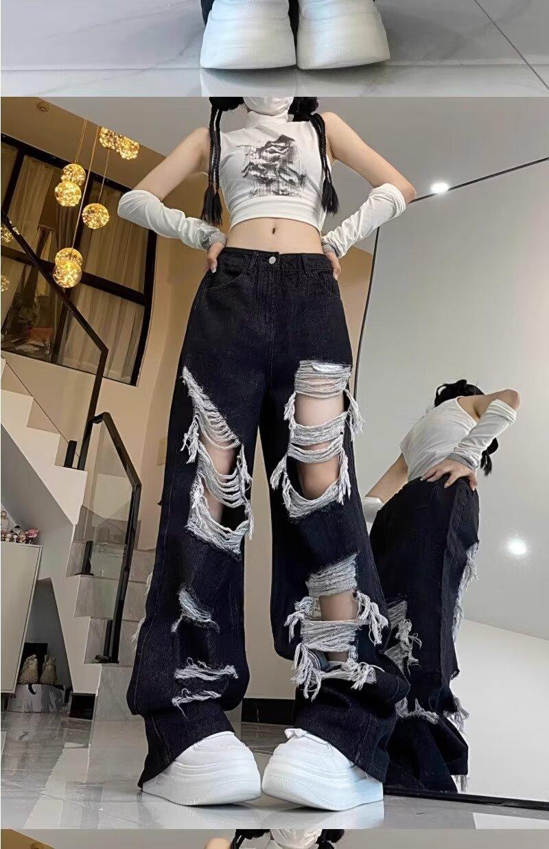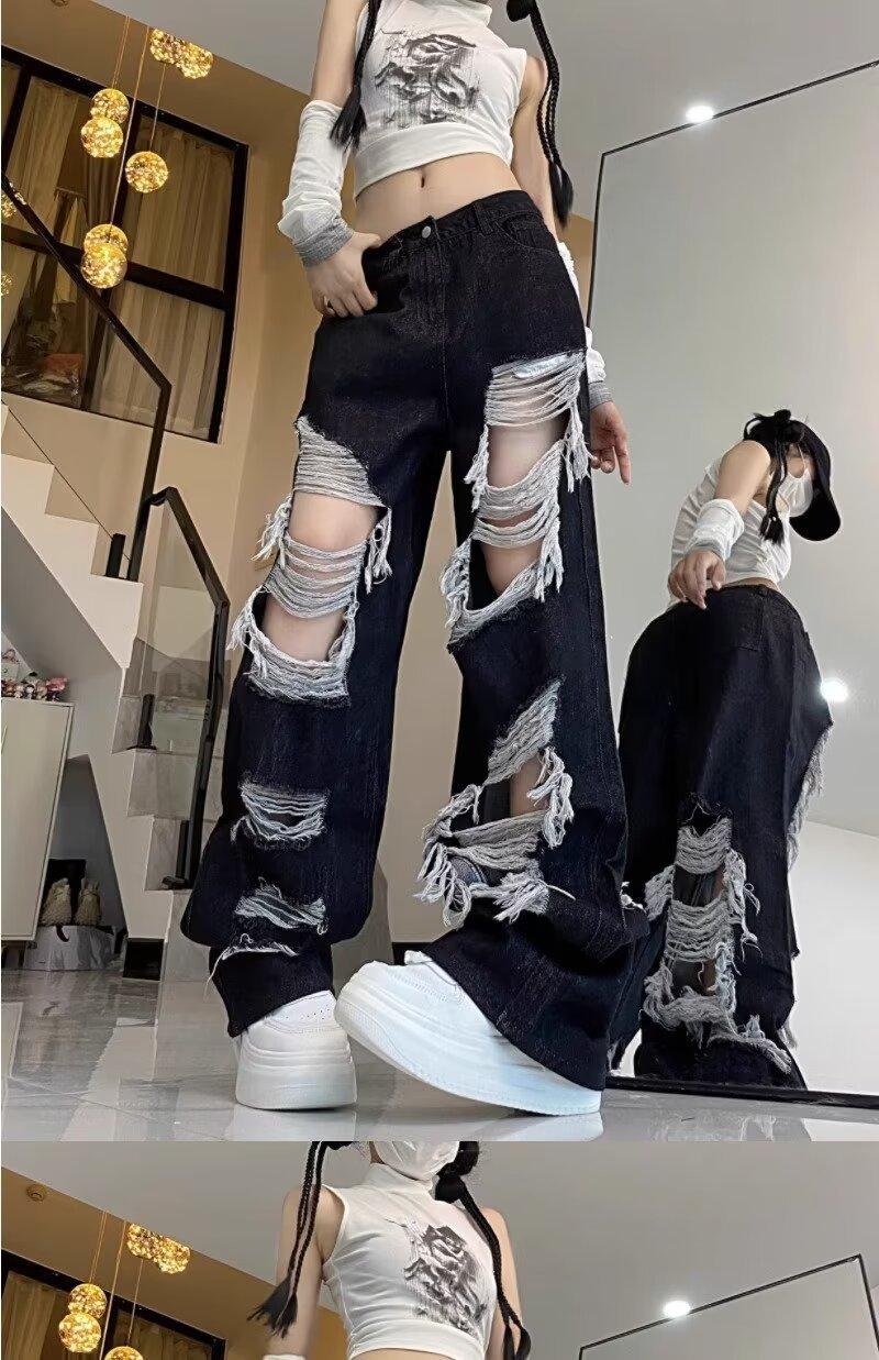 Jeans Rasgados de Rua Estilo Americano Calças Femininas Soltas Retas Calças de Mendigo Vintage Casual Perna Larga