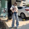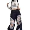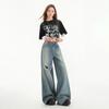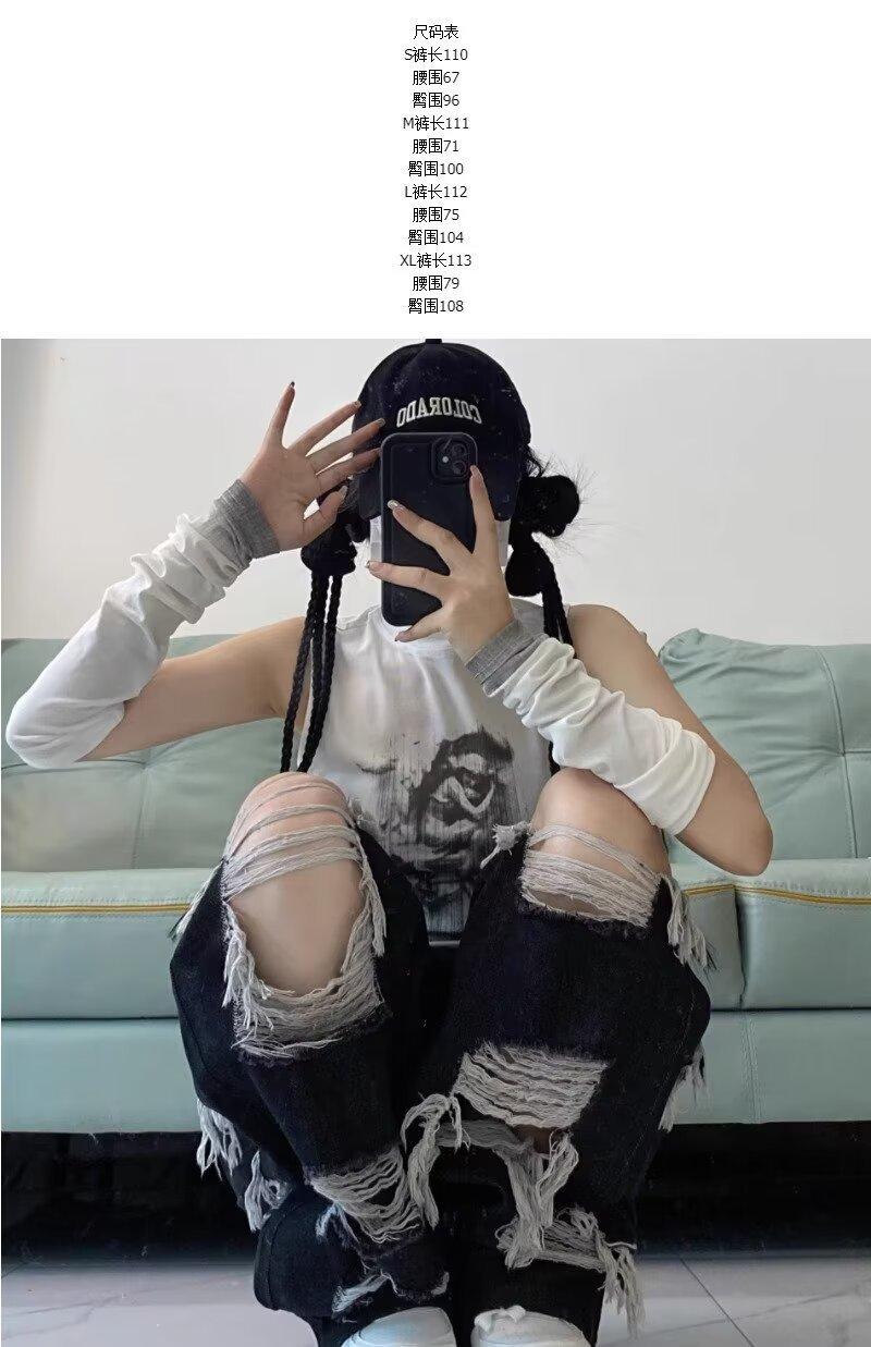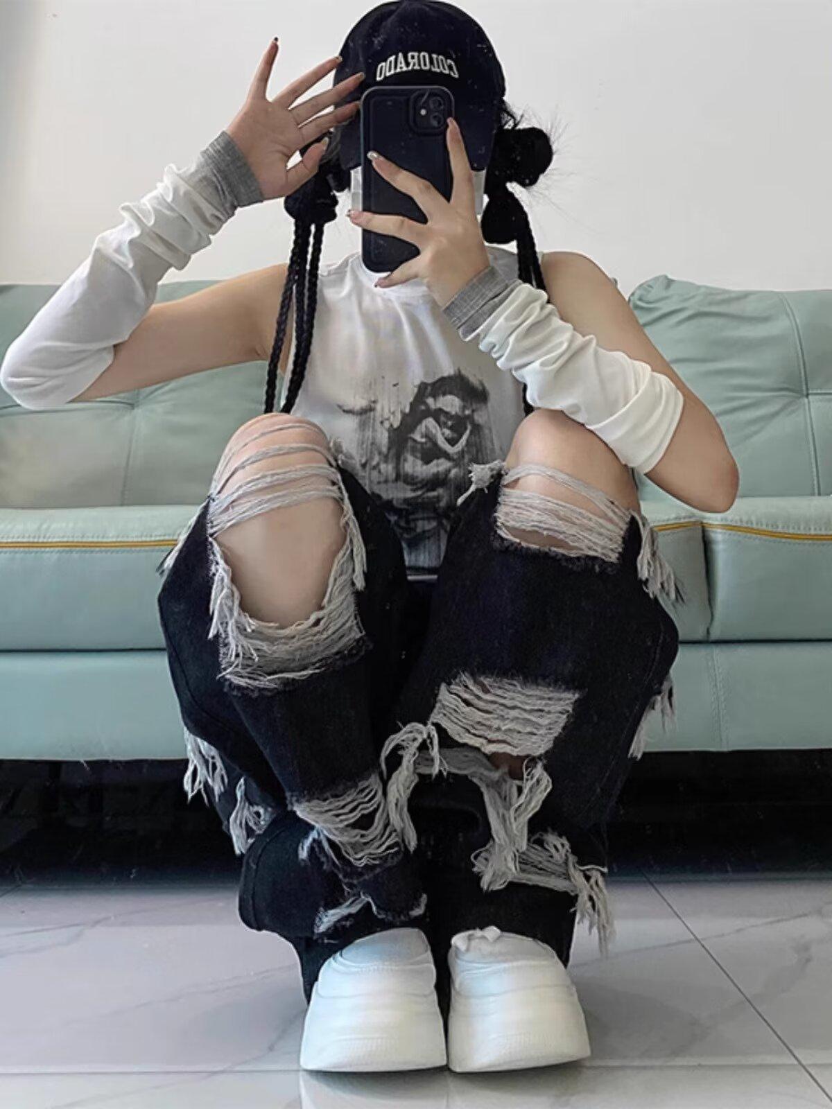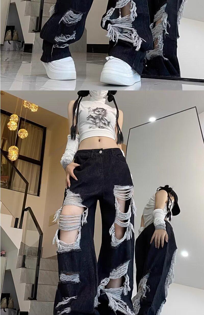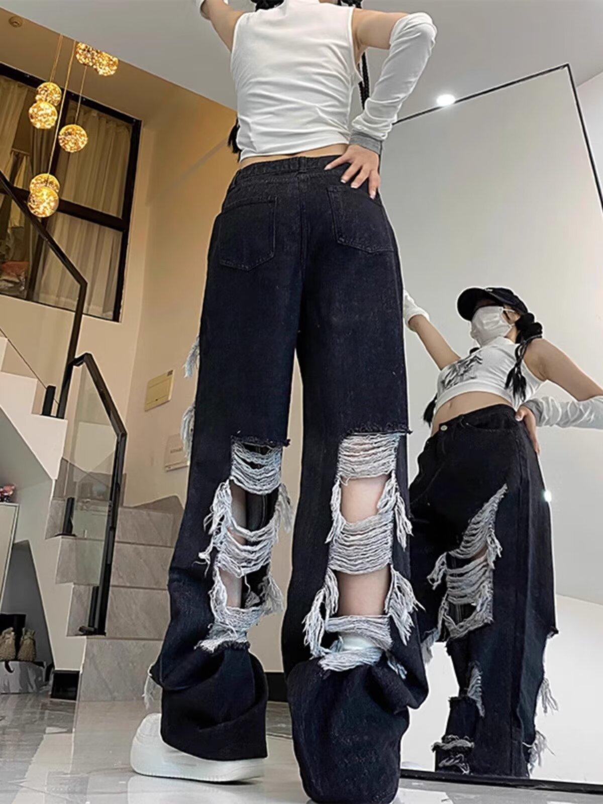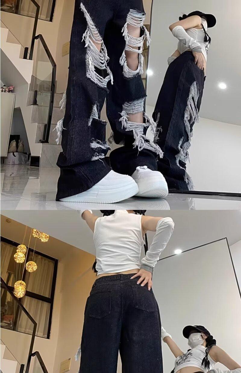 Jeans Rasgados de Rua Estilo Americano Calças Femininas Soltas Retas Calças de Mendigo Vintage Casual Perna Larga
