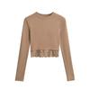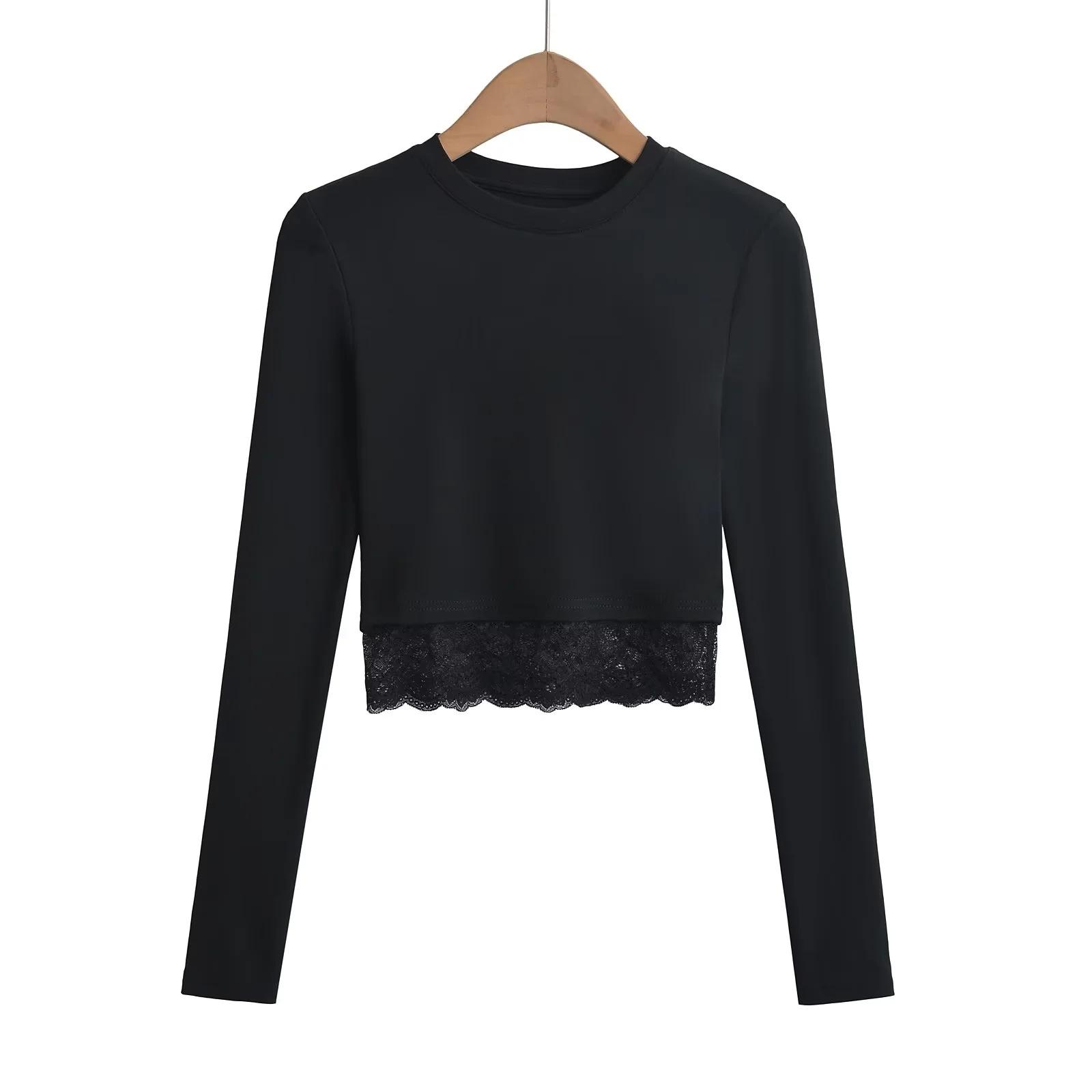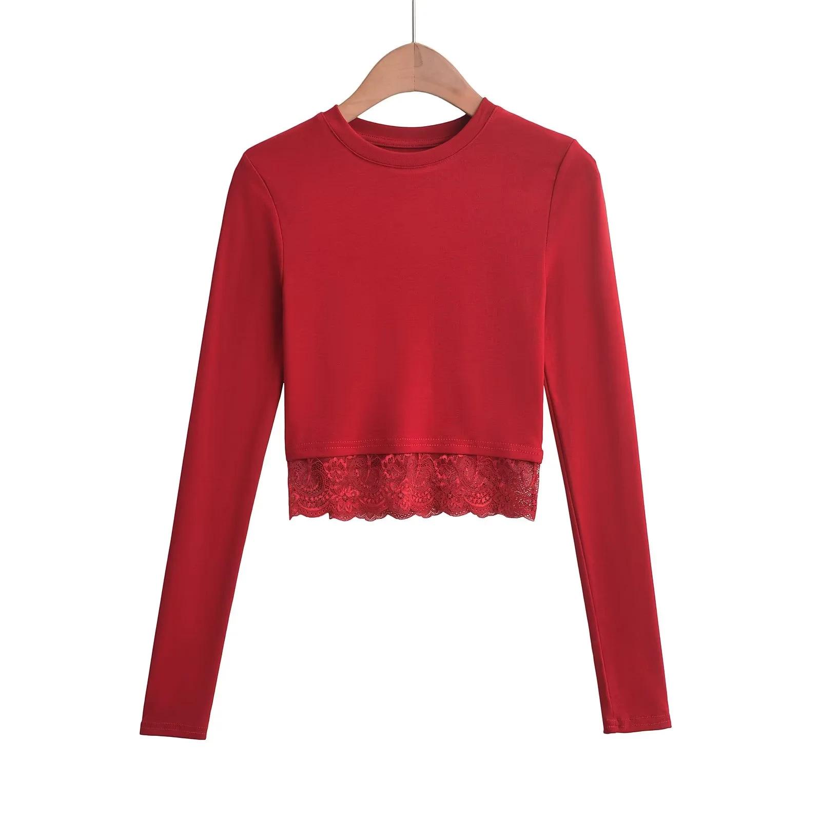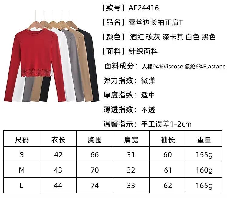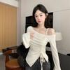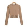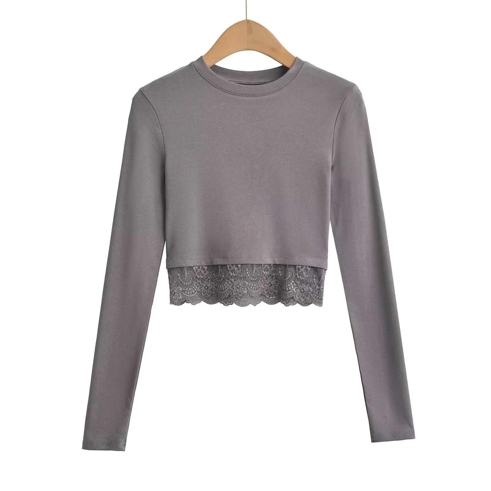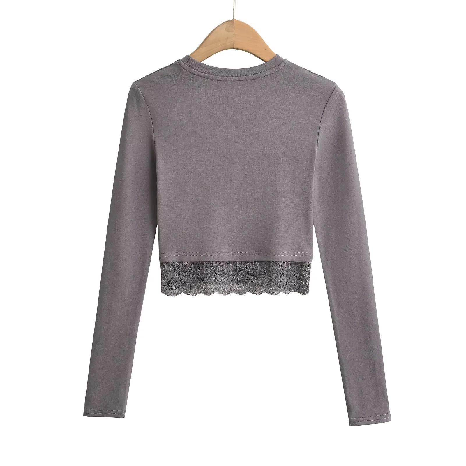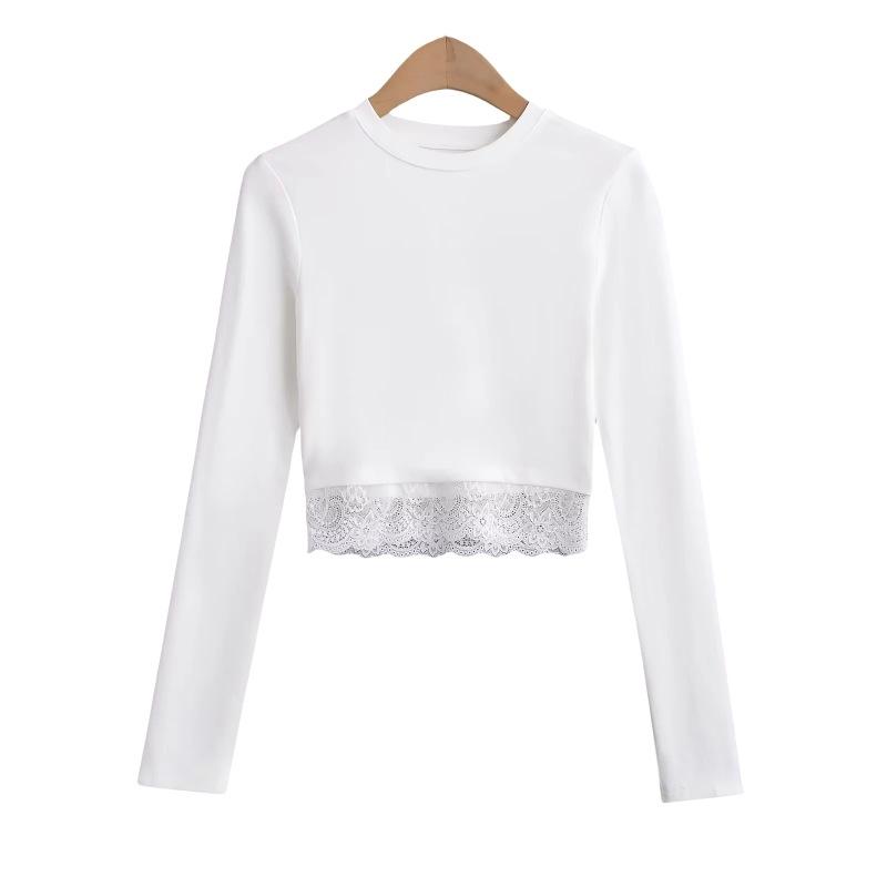 Outono e inverno New Spice Girls cintura alta manga comprida ombro camiseta feminina sexy renda costura slim-fit emagrecimento curto top