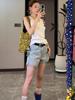 2024 verão novos shorts jeans femininos Xinjiang algodão longo grampo cintura alta design retro dinâmico versão A calças quentes