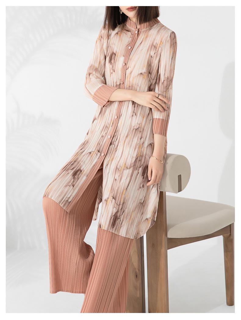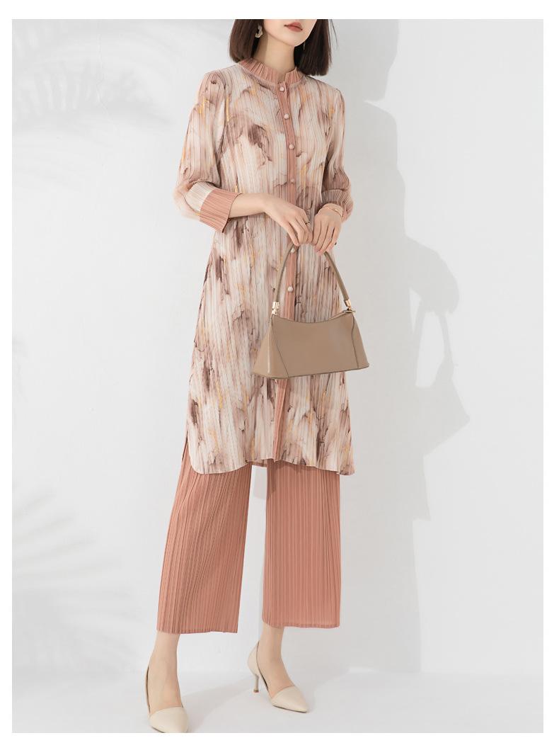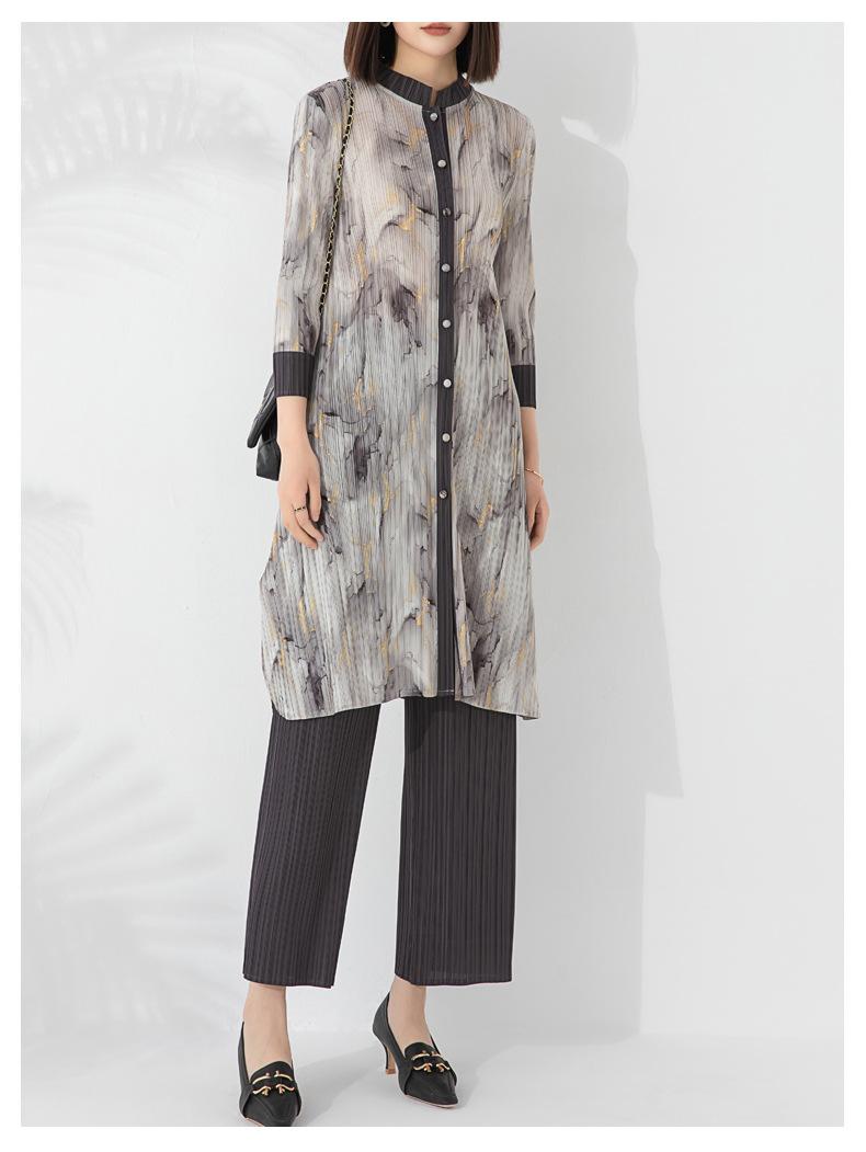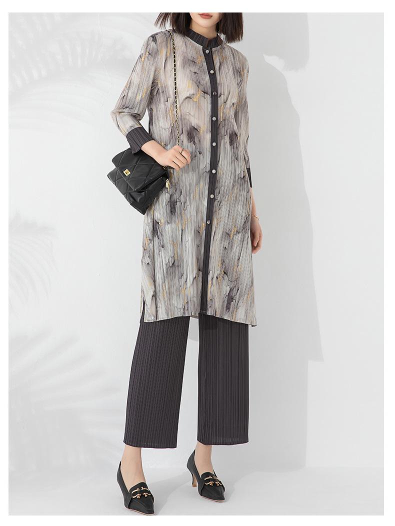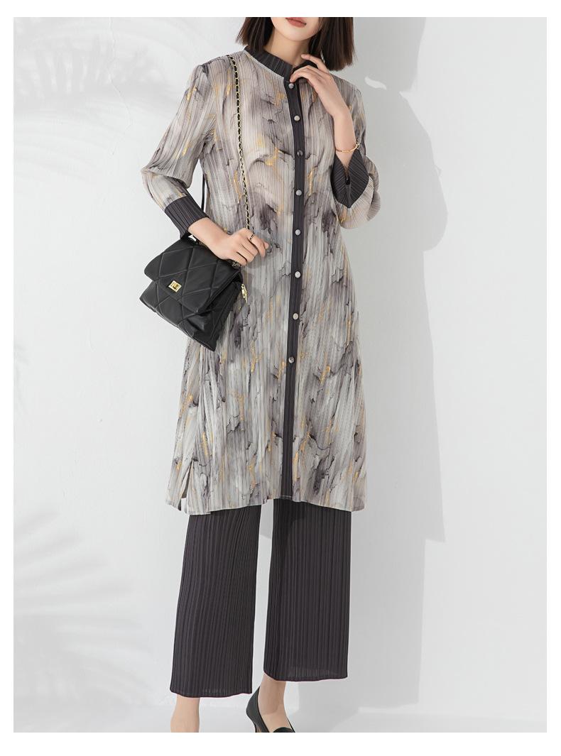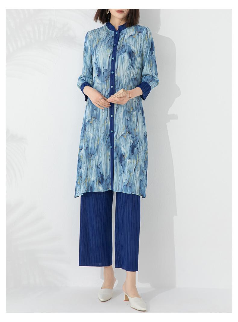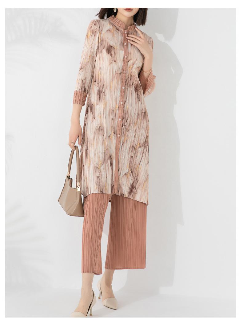 Plissado 2024 Outono Nova Moda Terno Feminino Impresso De Comprimento Médio Colarinho Reto Top Conjunto De Duas Peças