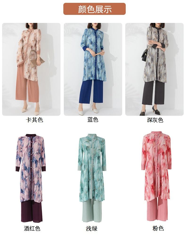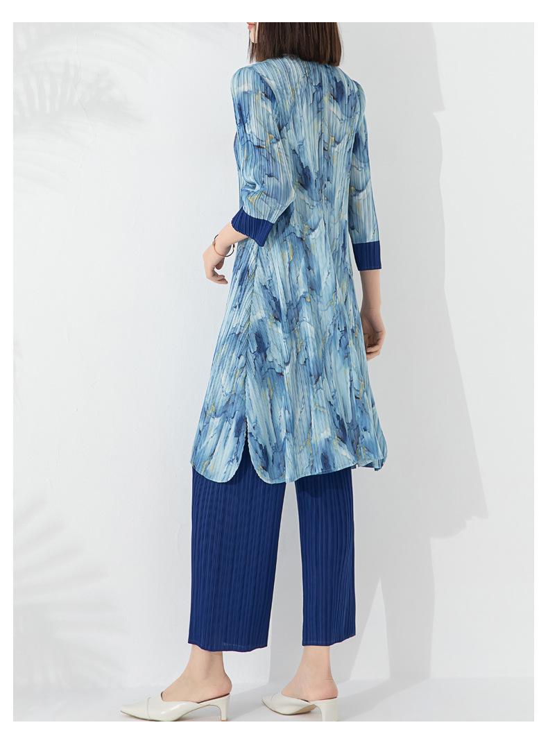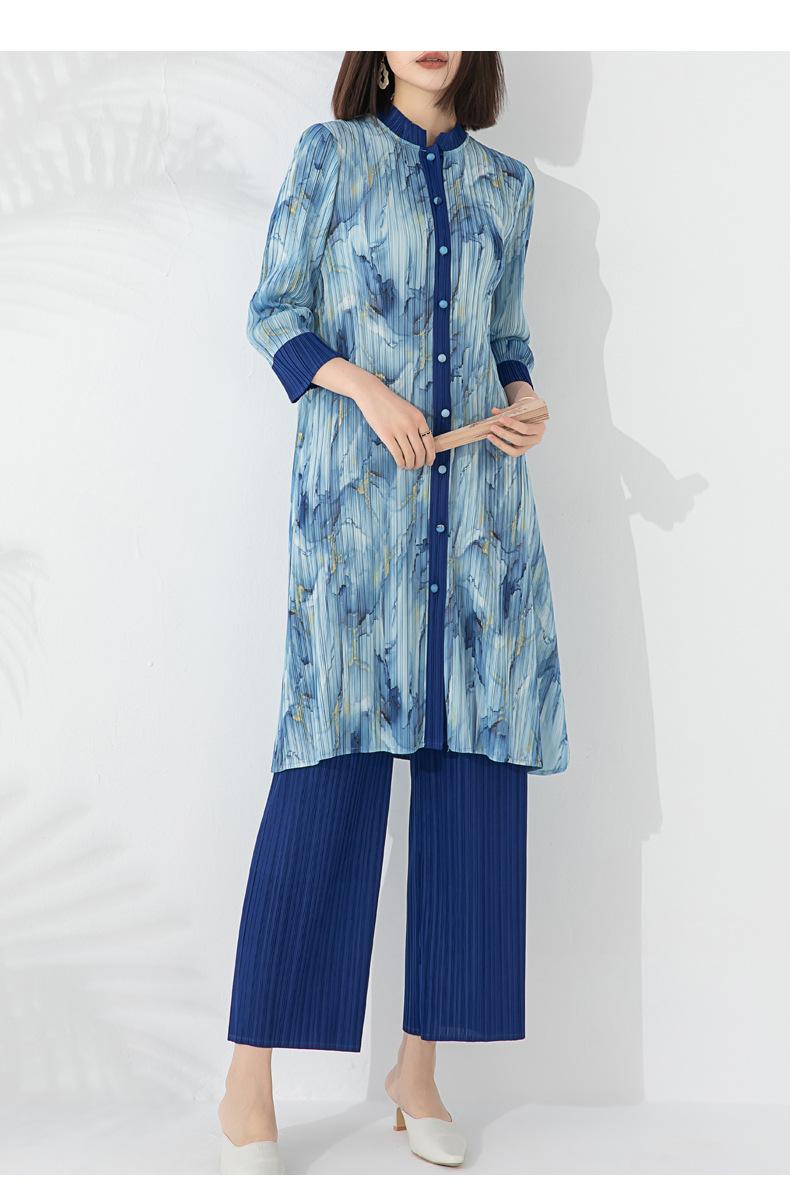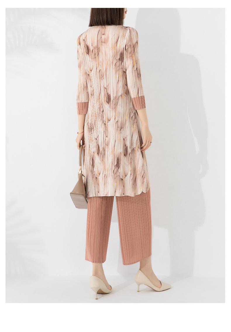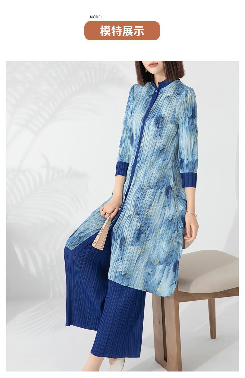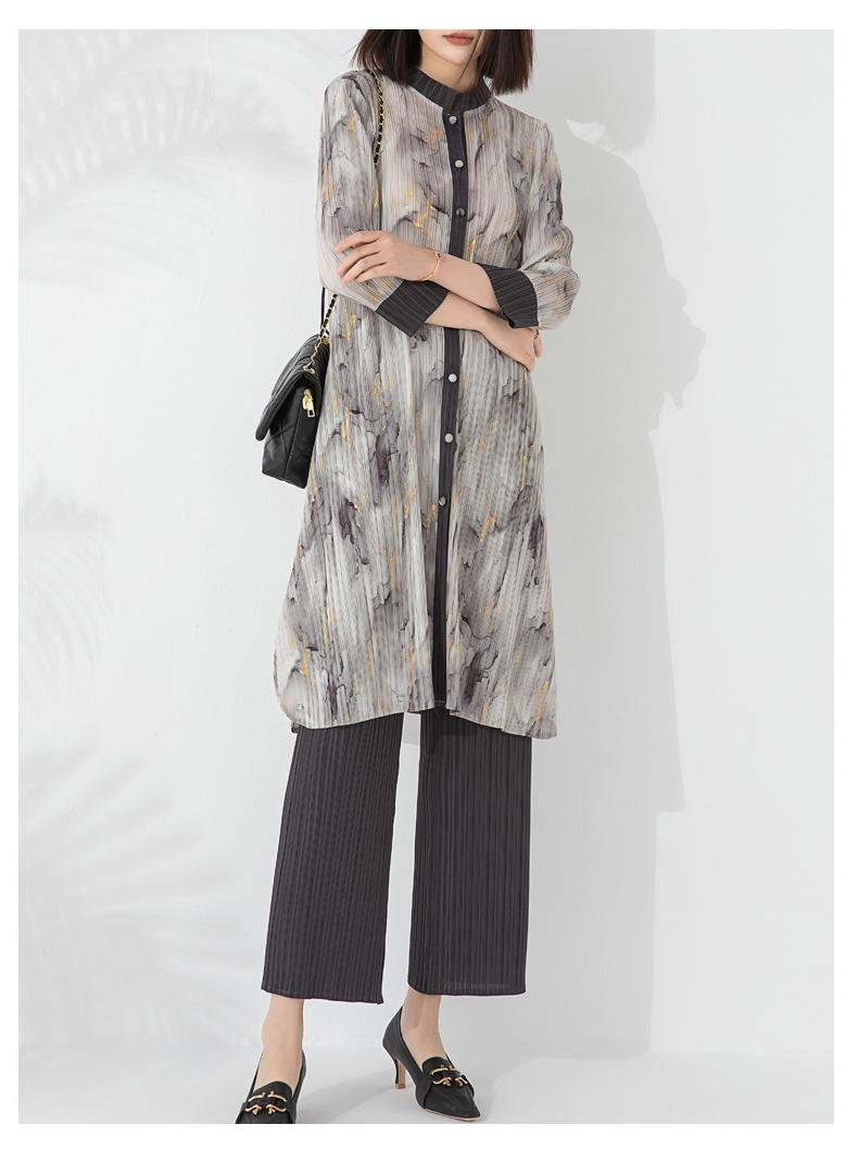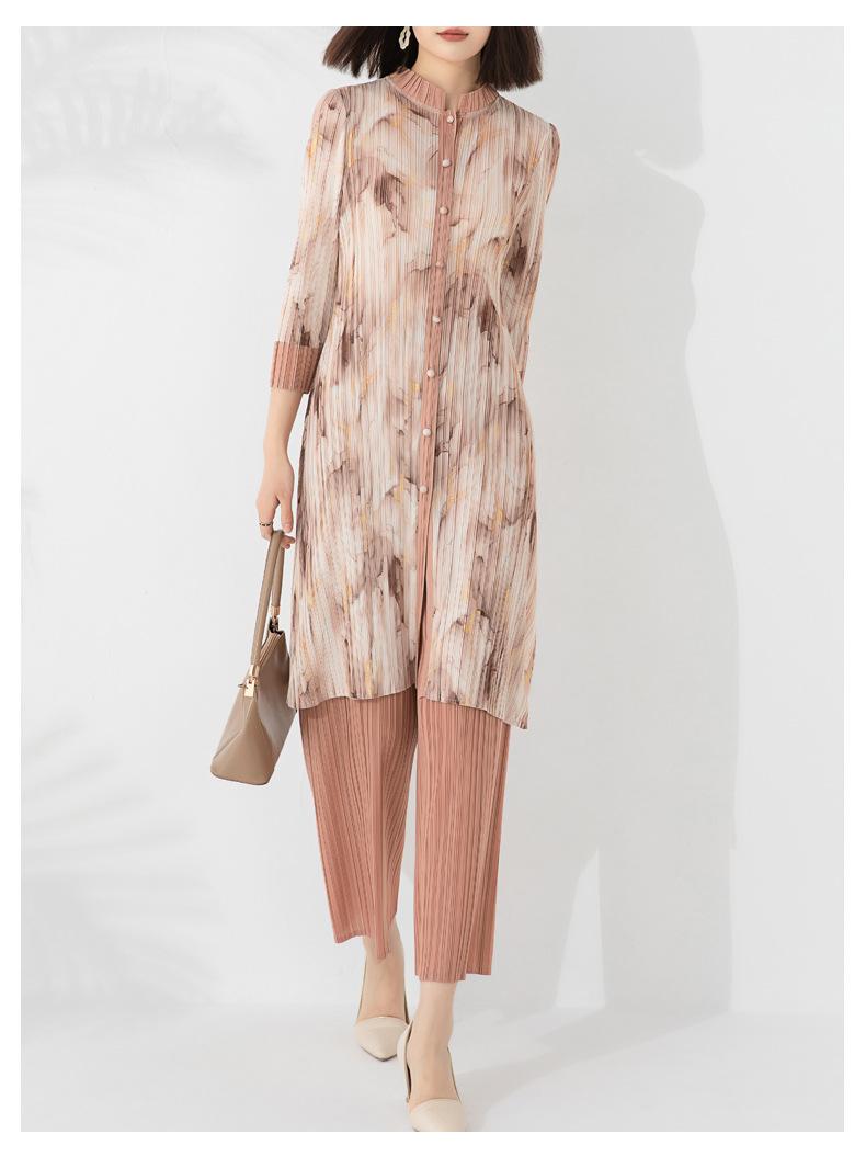 Plissado 2024 Outono Nova Moda Terno Feminino Impresso De Comprimento Médio Colarinho Reto Top Conjunto De Duas Peças