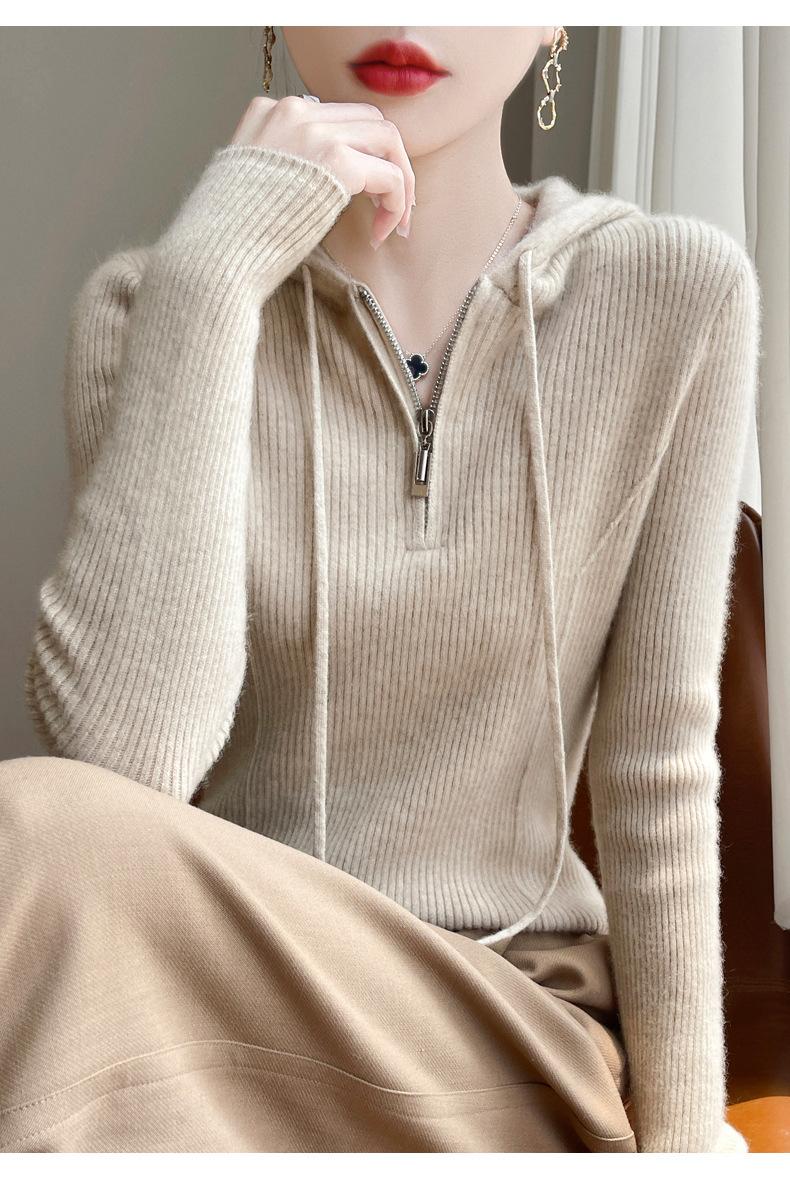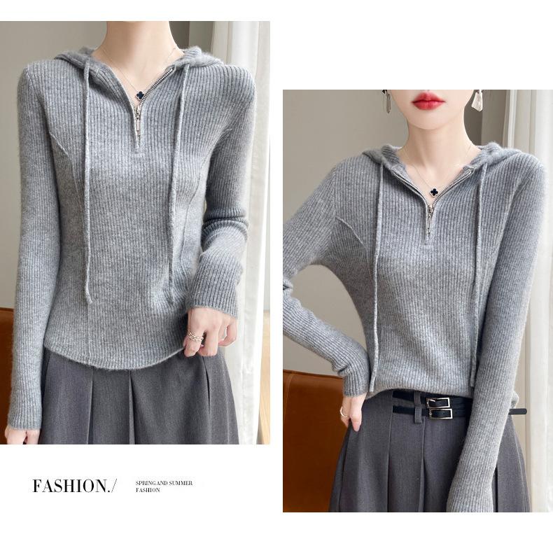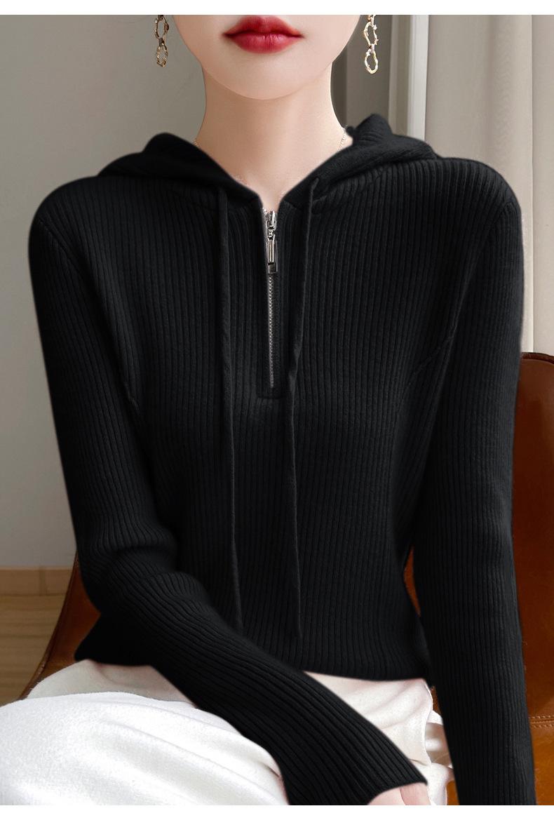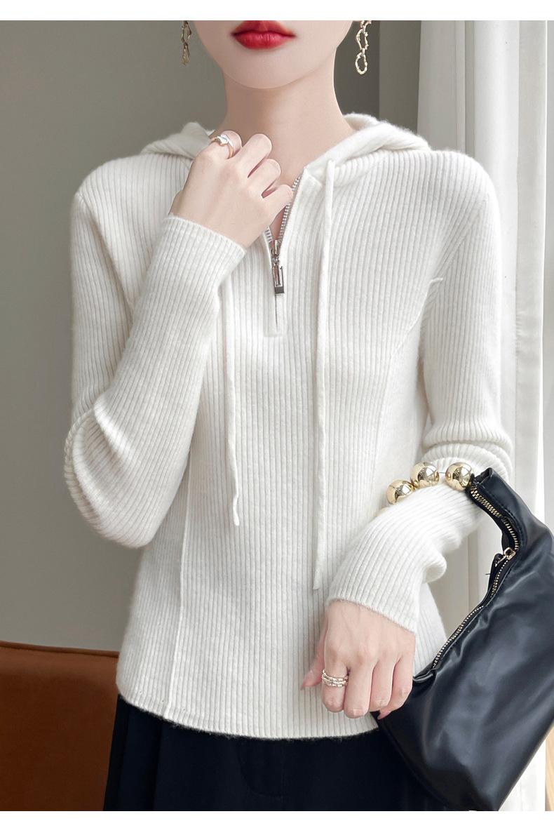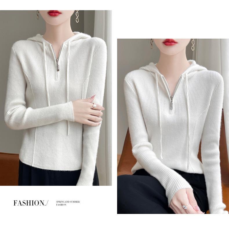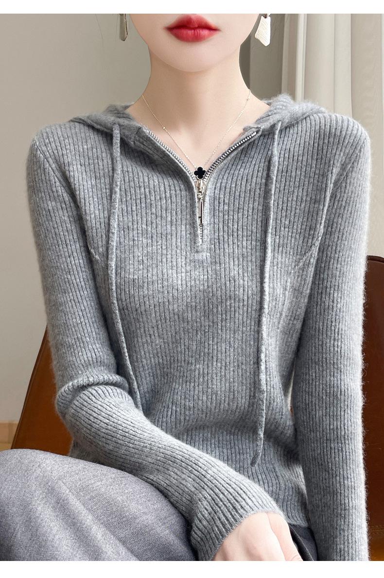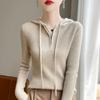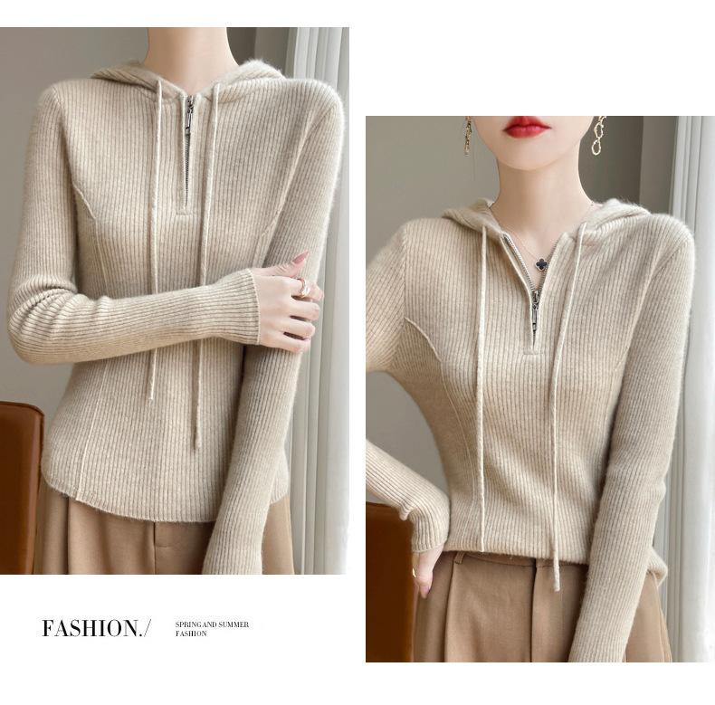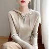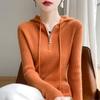 Suéter de Lã Feminino Moletom com Meio Zíper Cava Manga Longa com Capuz Solto Suéter com Cordão