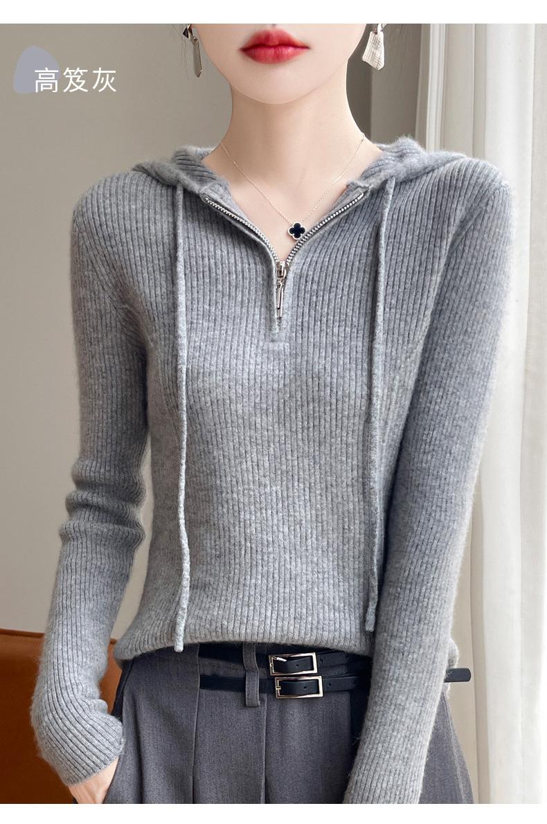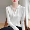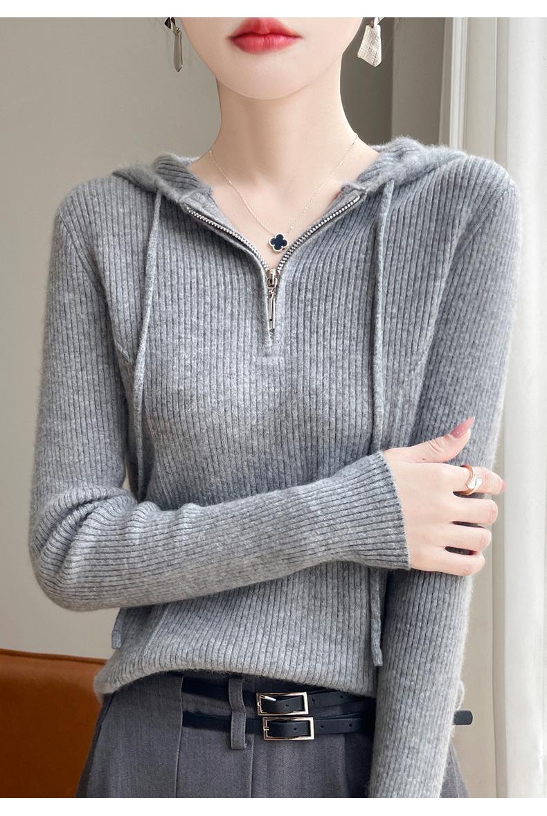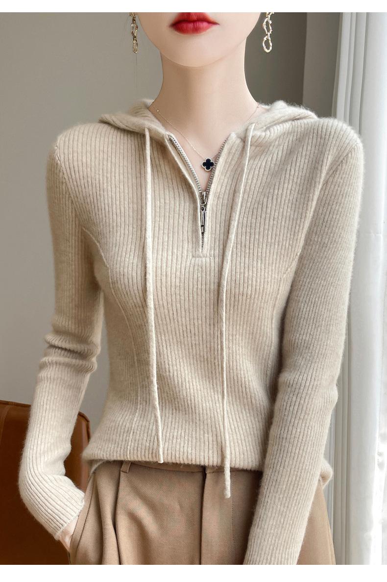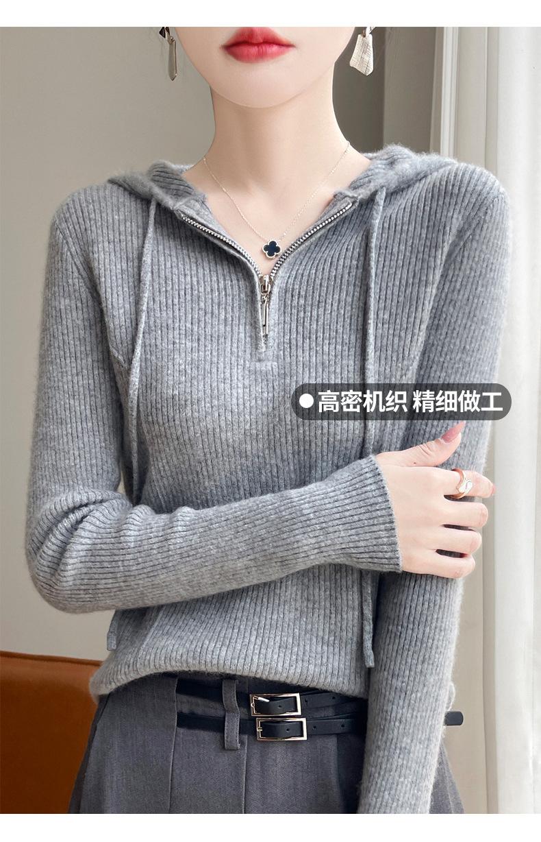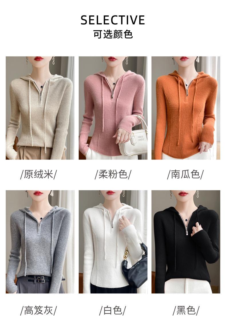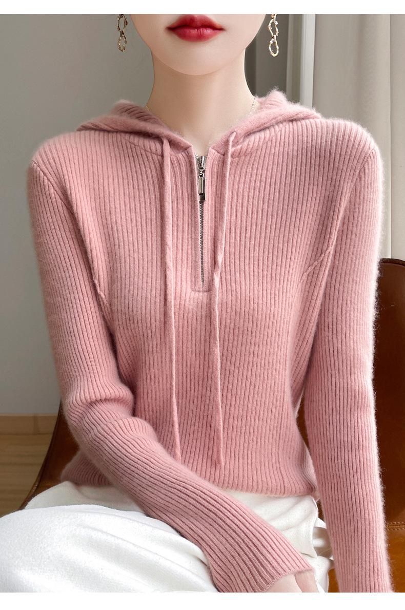 Suéter de Lã Feminino Moletom com Meio Zíper Cava Manga Longa com Capuz Solto Suéter com Cordão