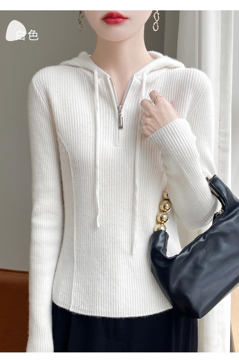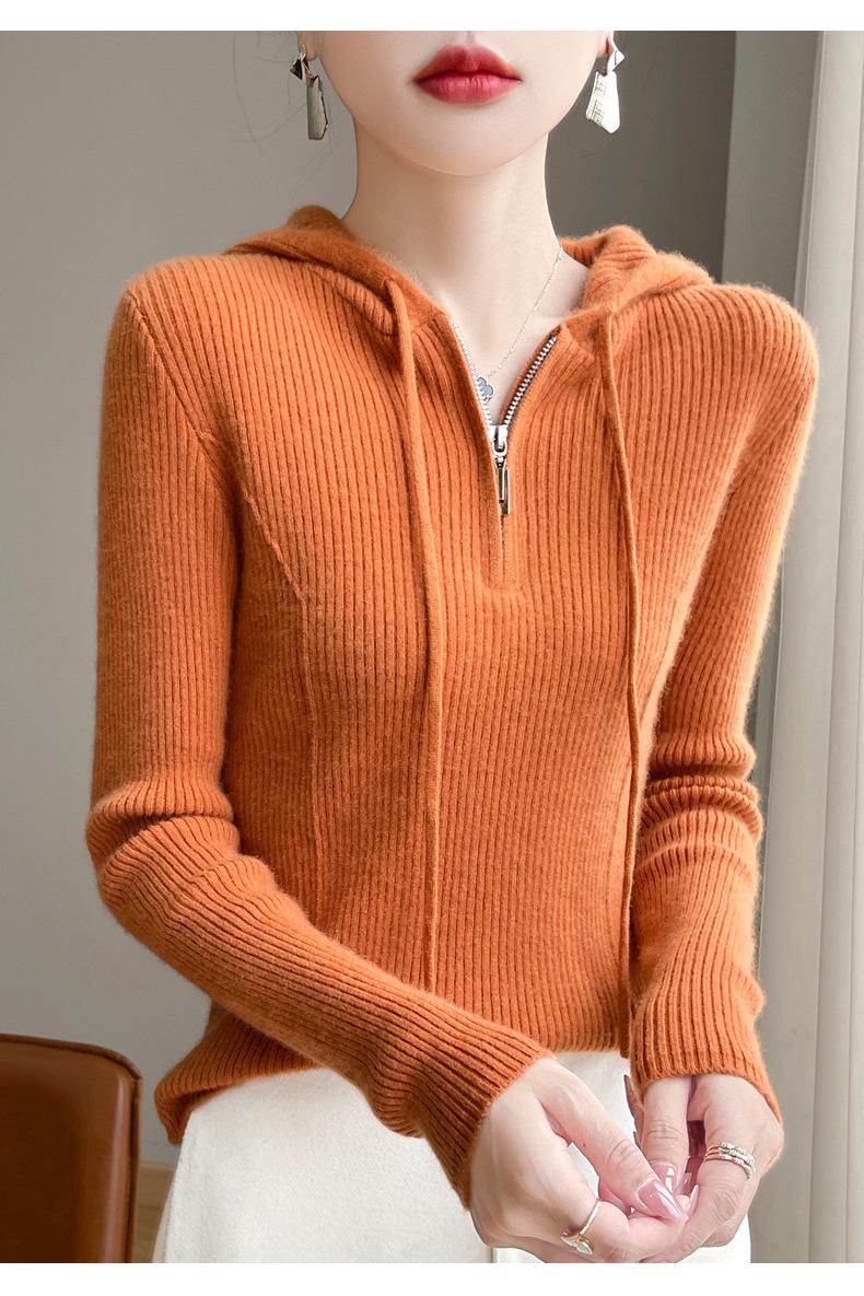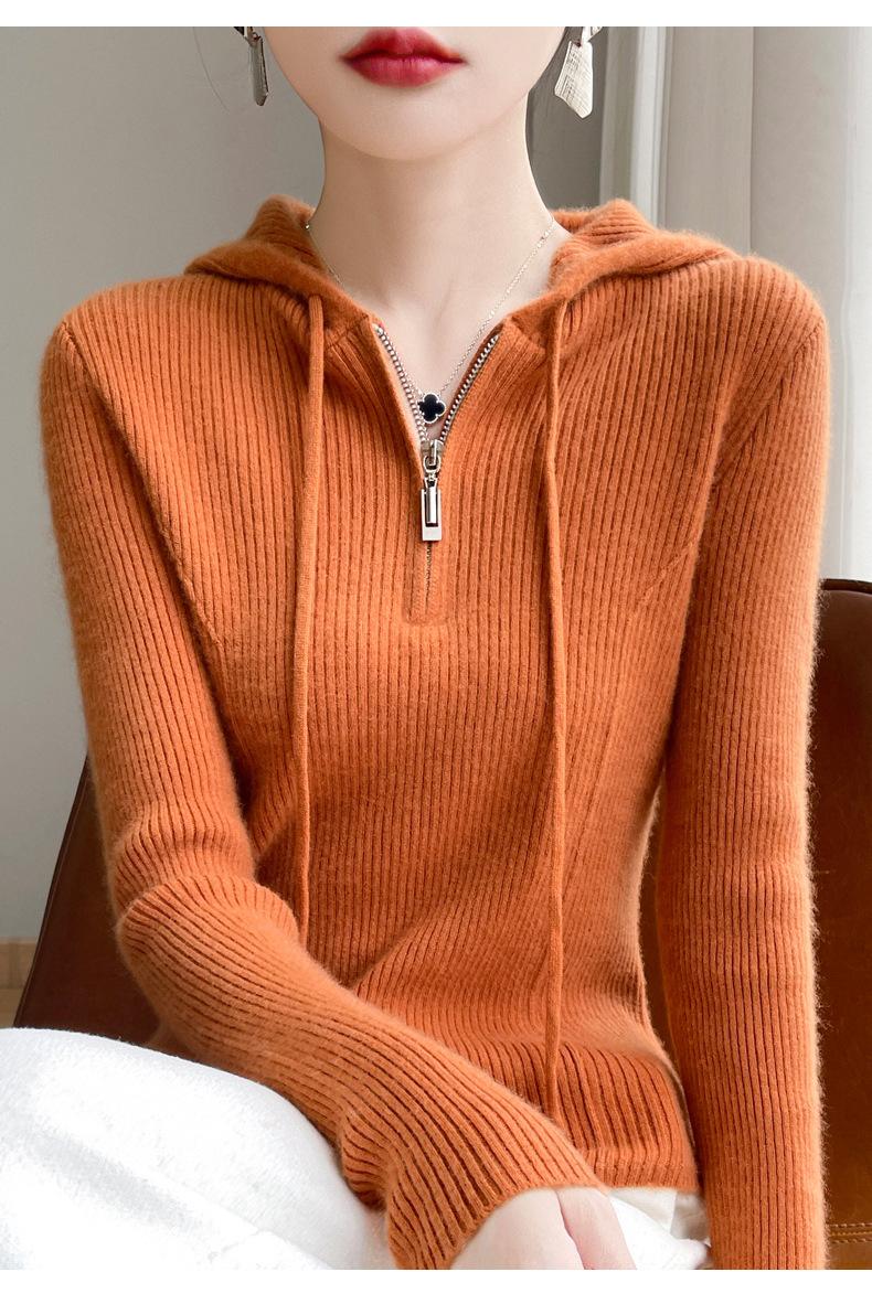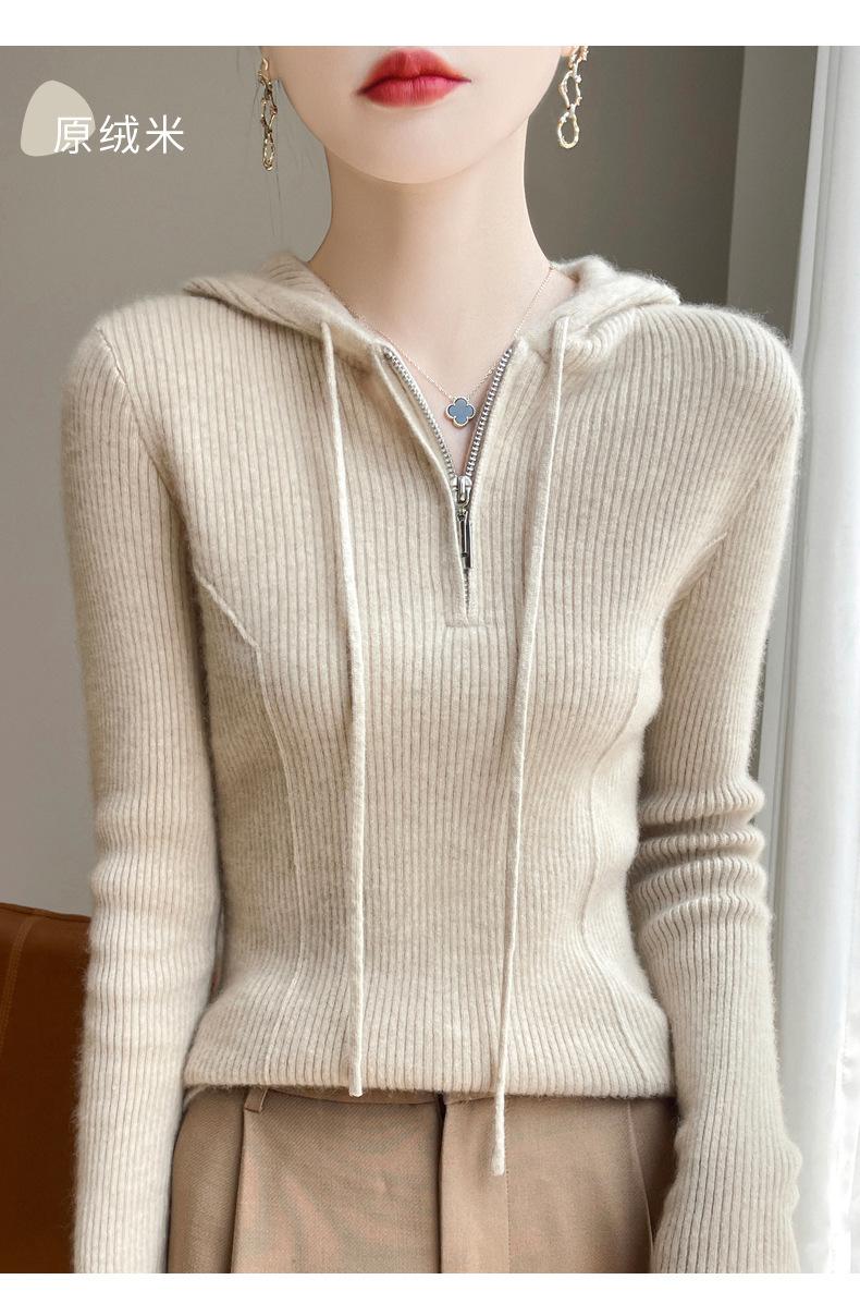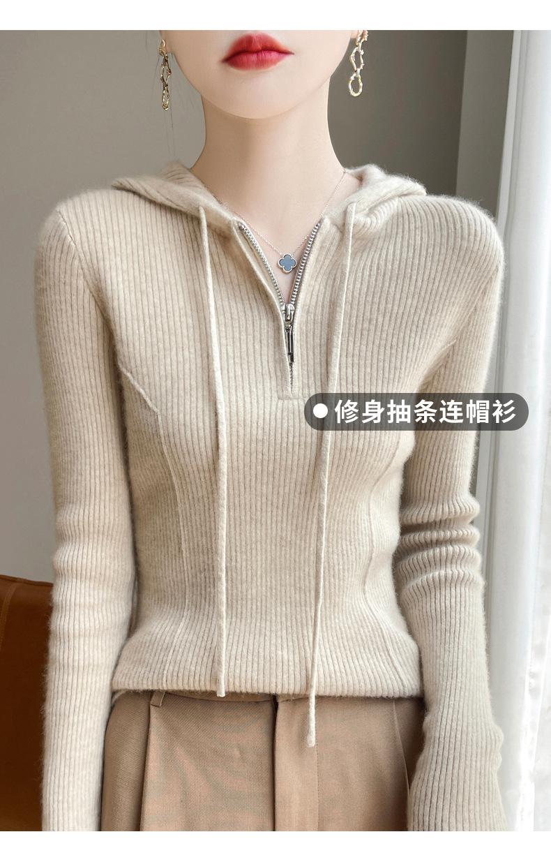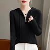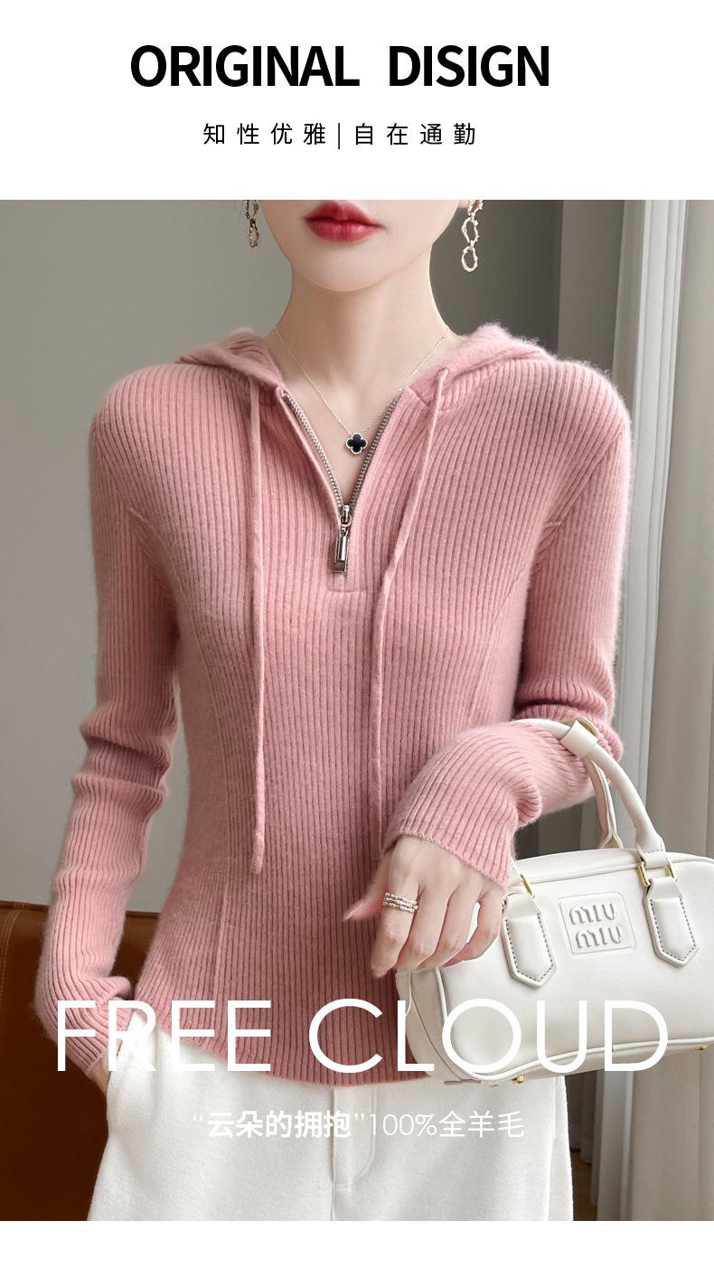 Suéter de Lã Feminino Moletom com Meio Zíper Cava Manga Longa com Capuz Solto Suéter com Cordão