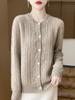 2024 Novo Cardigã de Malha de Lã Pura Feminino Decote Redondo Pérola Fivela Torcida Cor Sólida Manga Comprida Casaco Grosso para Viajante