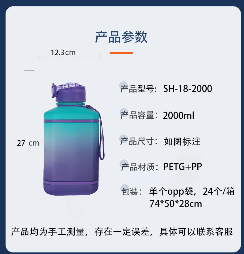 Chaleira de plástico gradiente de 2000 ml, chaleira quadrada Petg, grande capacidade, esportes ao ar livre, capa protetora, alça