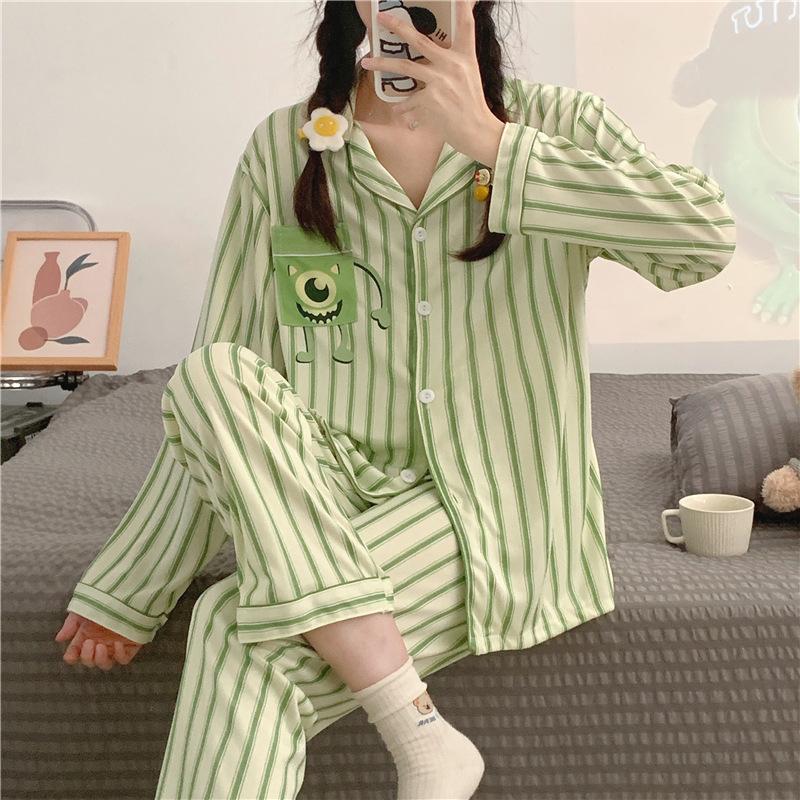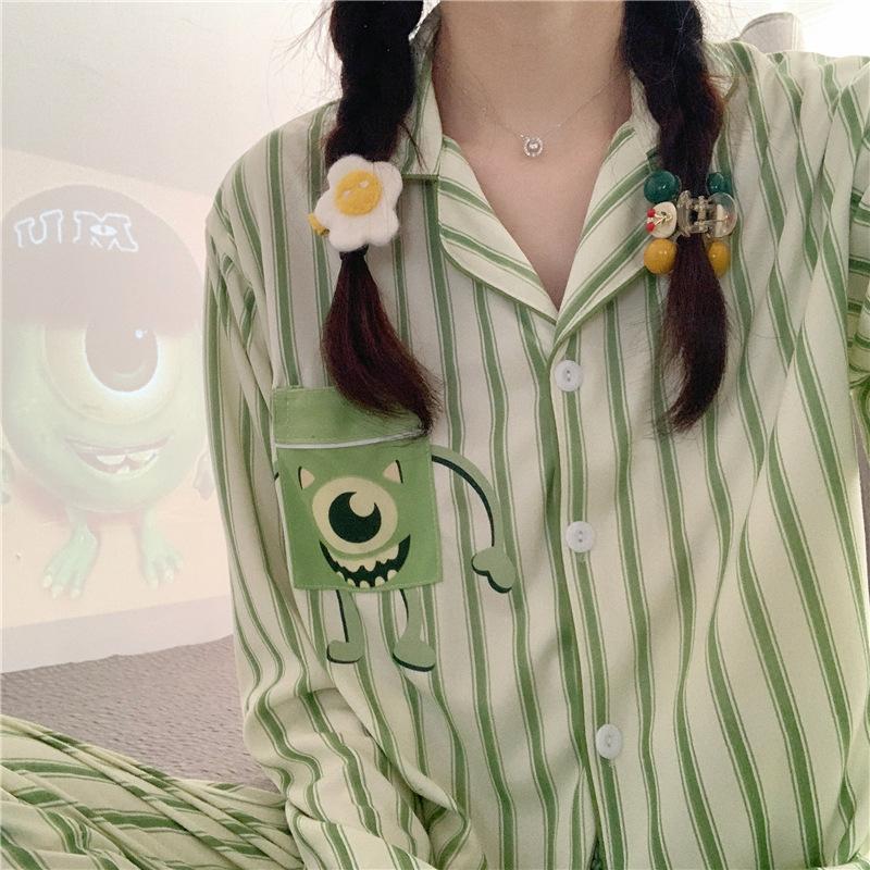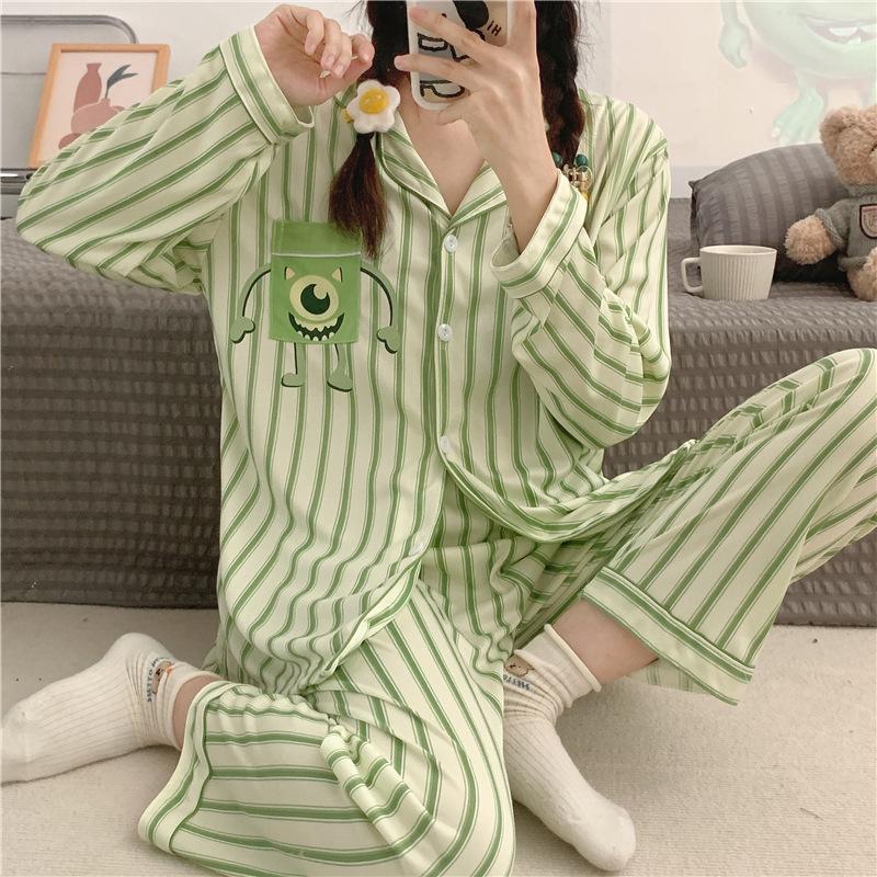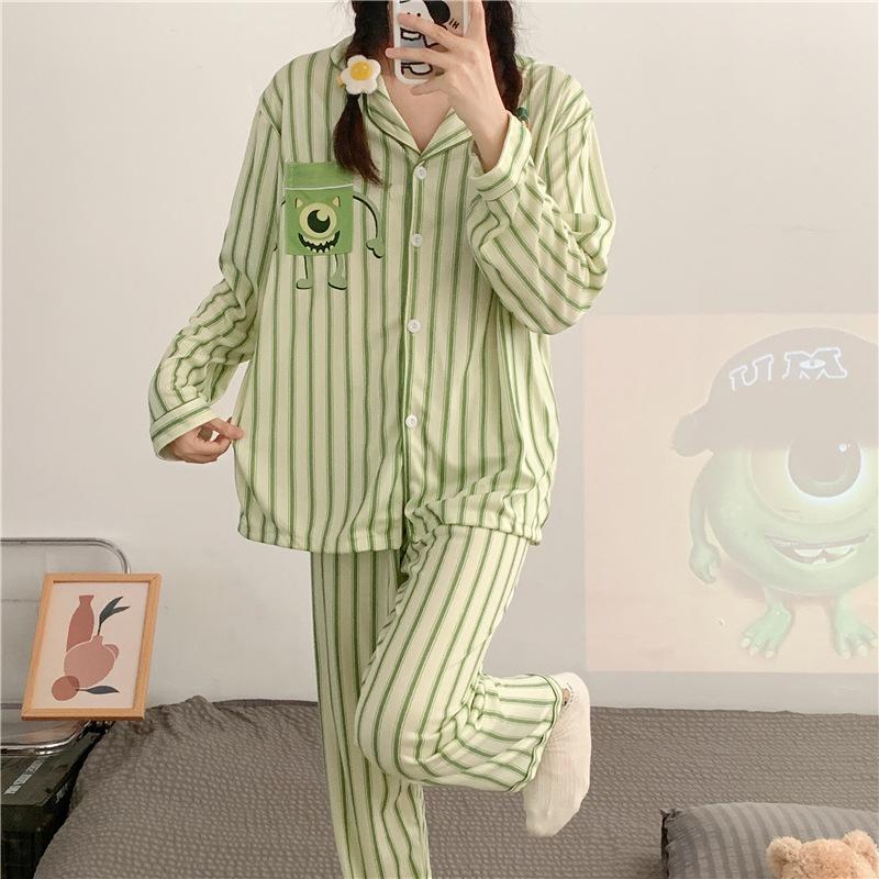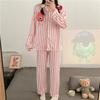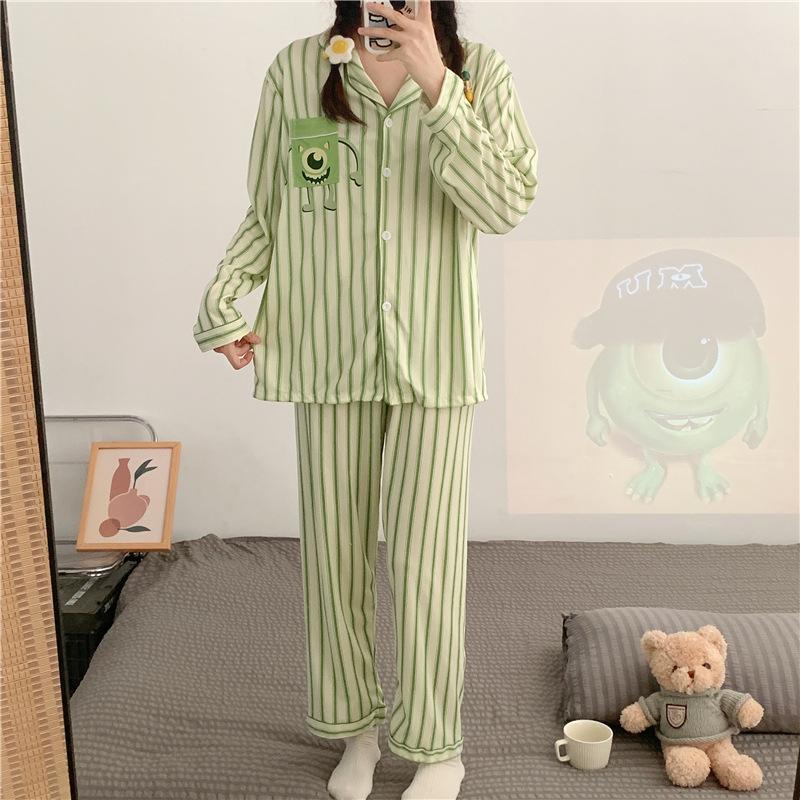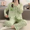 Novo pijama listrado verde das mulheres de manga comprida estilo coreano bonito da menina roupas de casa pijamas terno atacado desgaste exterior