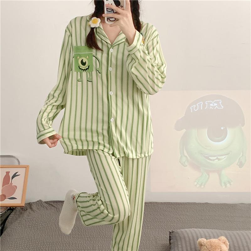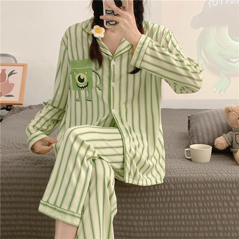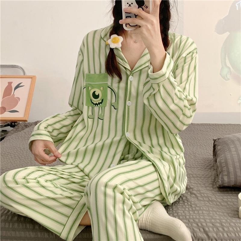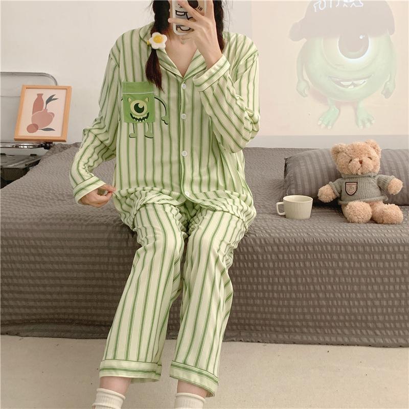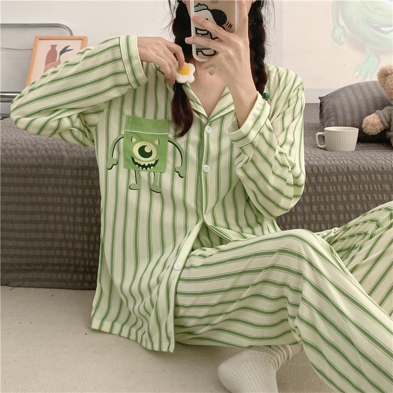 Novo pijama listrado verde das mulheres de manga comprida estilo coreano bonito da menina roupas de casa pijamas terno atacado desgaste exterior