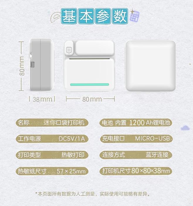 Parâmetros de impressão: 200DPI Método de impressão: Impressão térmica em preto e branco sem tinta Capacidade da bateria: 1200mAh Papel de impressão: 57*25mm Configuração padrão de fábrica: unidade principal + cabo de carregamento + manual + 1 rolo de papel de impressão + caixa de embalagem Tamanho do produto: 80*80*35mm Tamanho da embalagem: 11*15*4.8cm, individual com embalagem 250g Tamanho da caixa: 56*25*32cm, Quantidade por caixa: 50 peças Peso total da caixa: 12,5kg