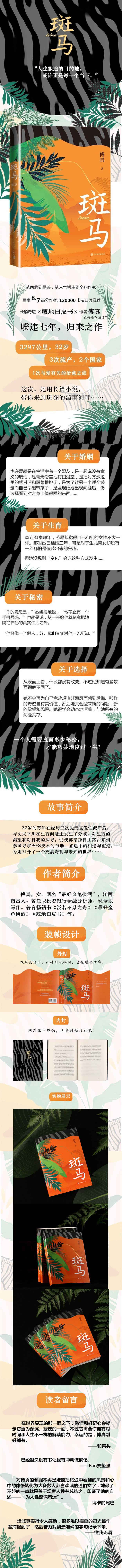 "Zebra" é o romance de estreia da autora de best-sellers Fu Zhen, que levou sete anos para ser escrito. É uma adaptação de algumas de suas experiências pessoais. Começa com a história de uma mulher chinesa de 32 anos que foi sozinha para a Tailândia em busca de tratamento médico após três abortos congênitos recorrentes. Conta uma jornada maravilhosa de reencontro em um país estrangeiro, descobrindo segredos e encontrando a si mesmo.