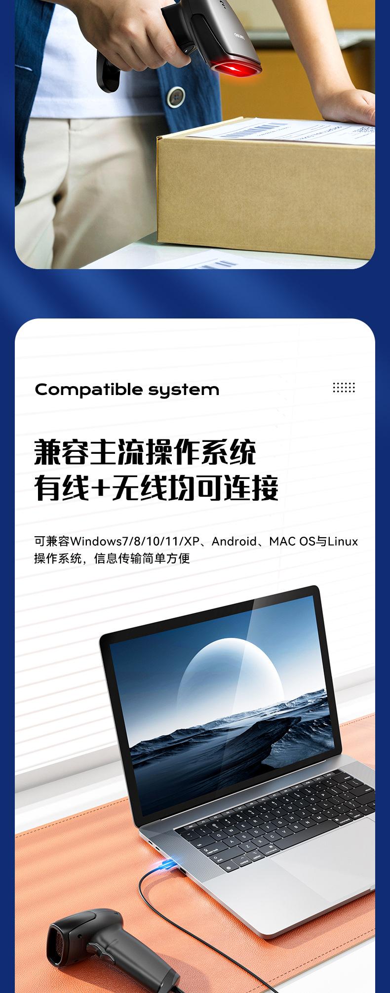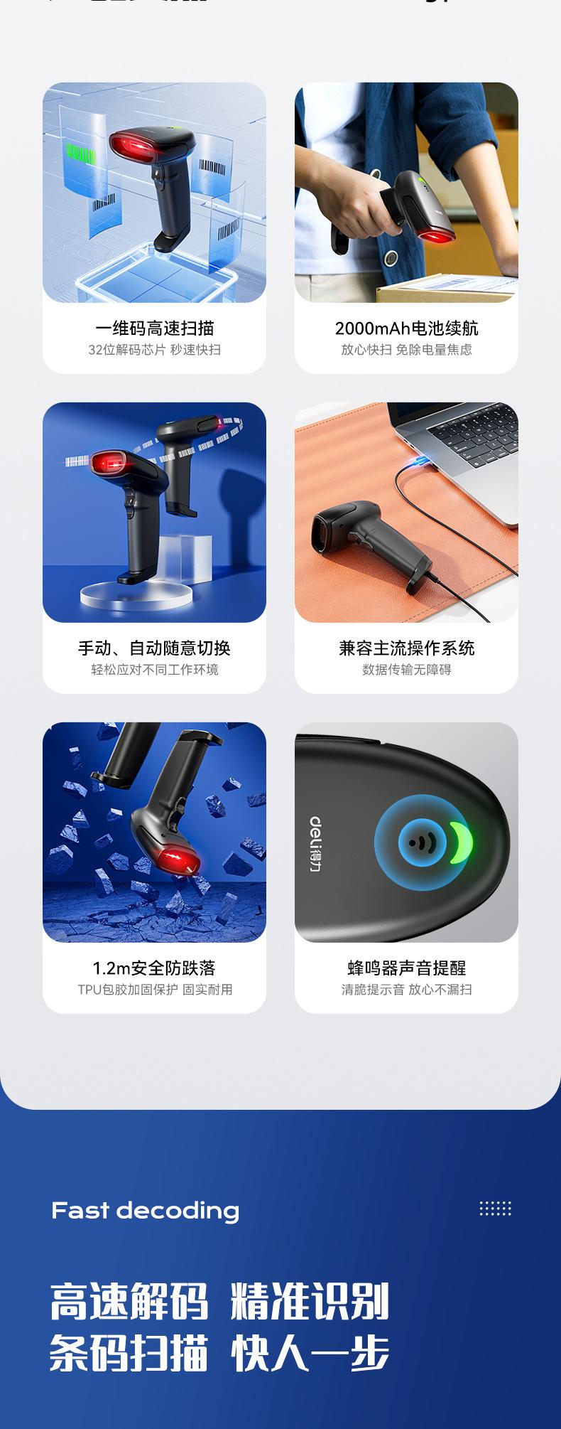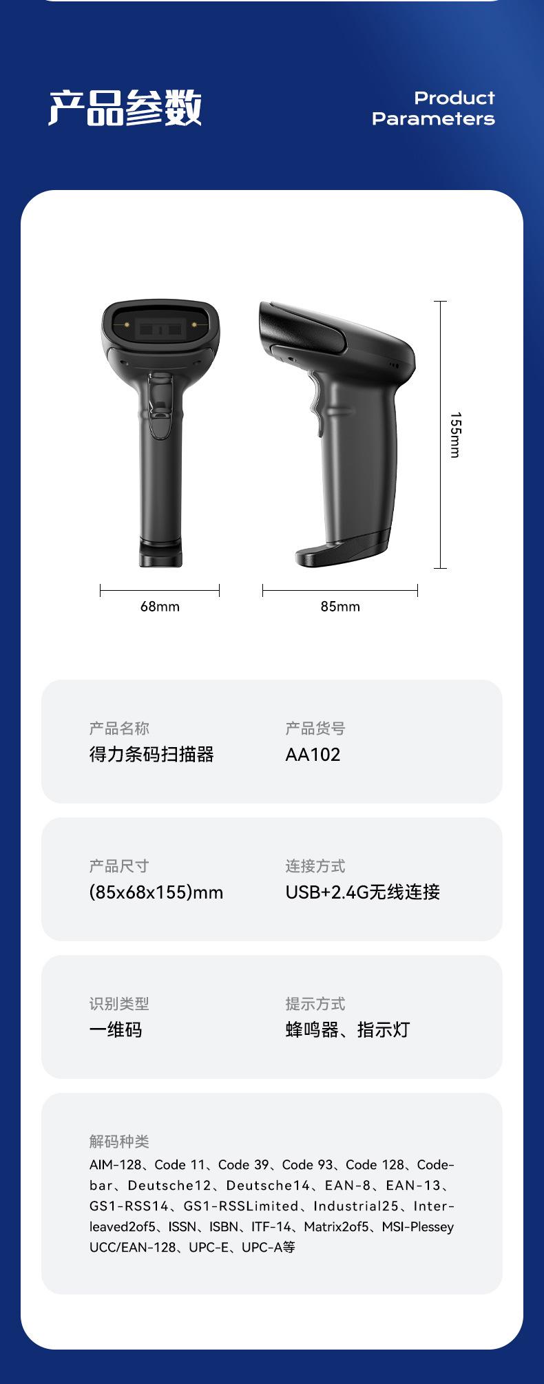 Deli AA102 Scanner Sem Fio Arma de Digitalização Código de Barras Scanner de Código de Tela de Código de Tela Logística Expressa Produto