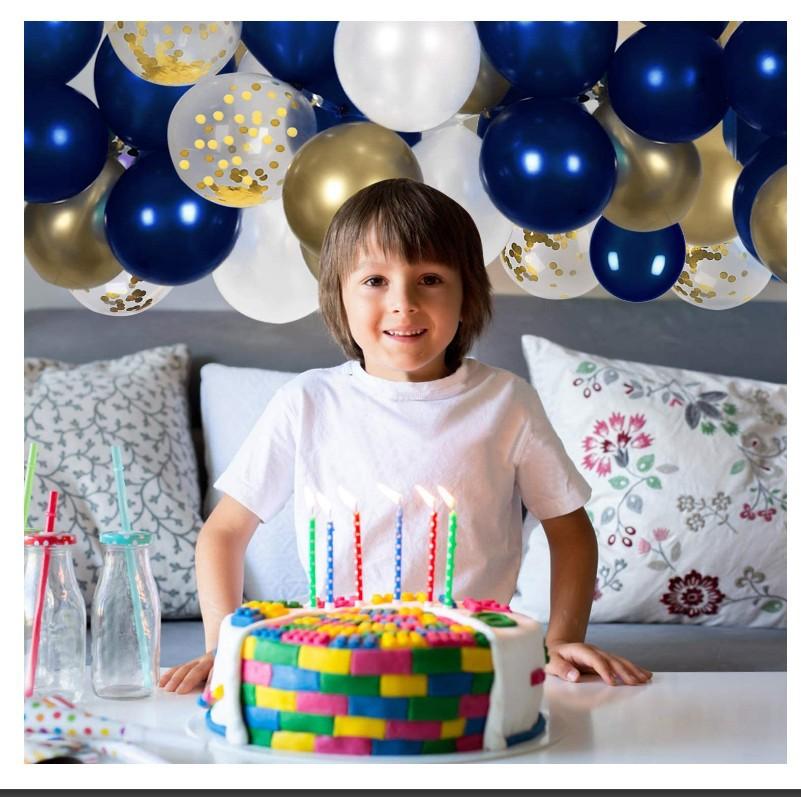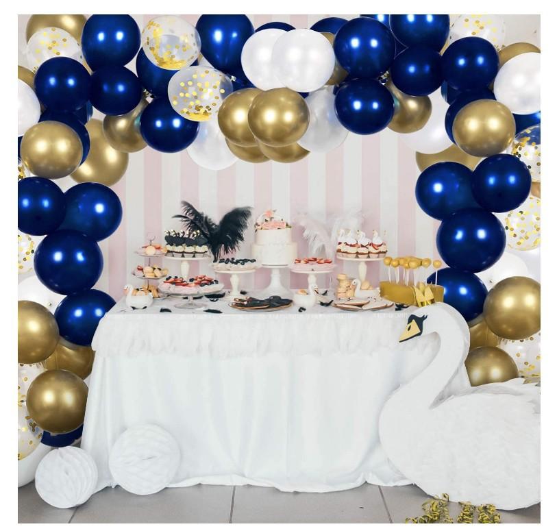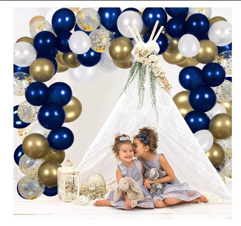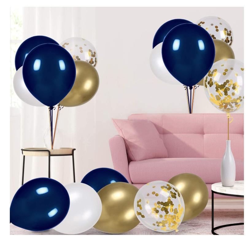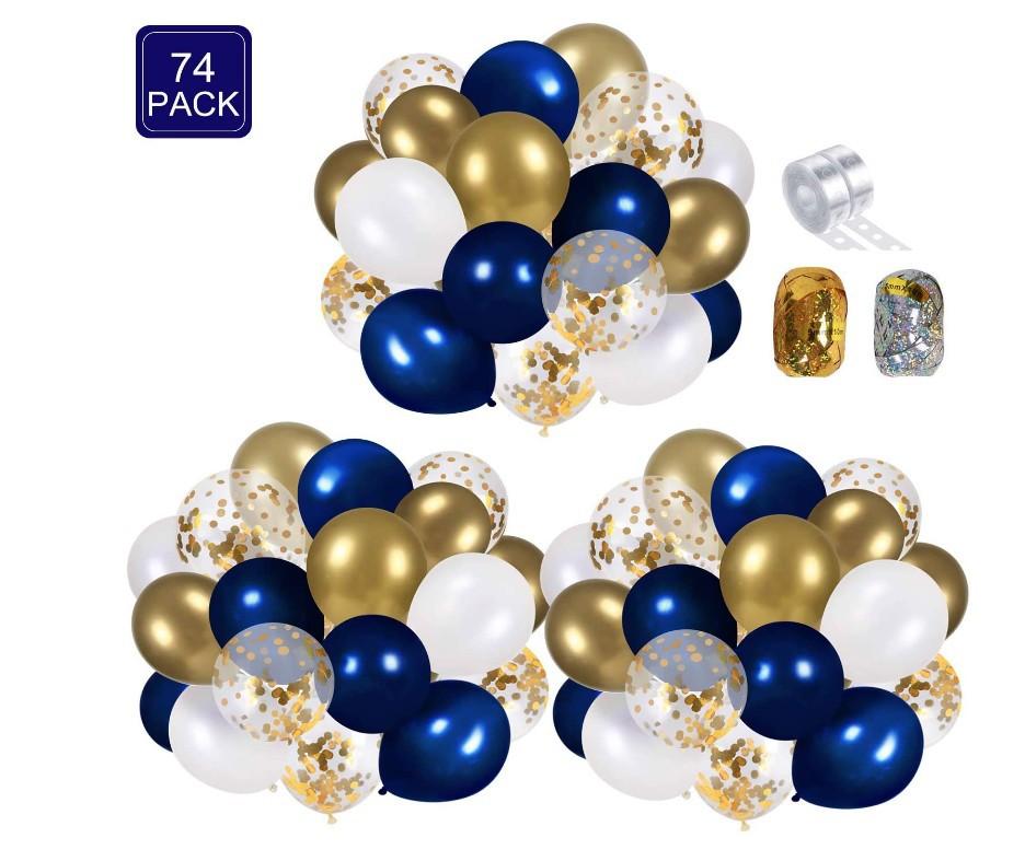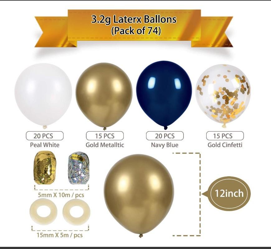 【74 Peças】Contém 20 balões azul-marinho, 20 balões branco-pérola, 15 balões multicoloridos dourados, 15 balões metálicos dourados, 2 fitas de foil, 2 fitas de balão. Total de 74 peças.