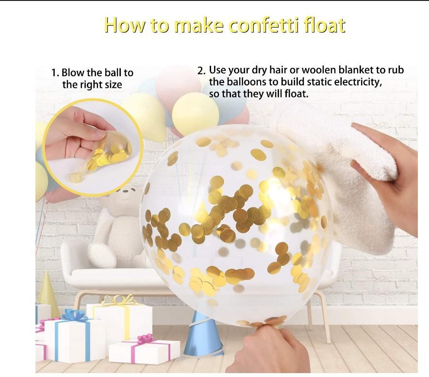 【Método de enchimento】Esses balões de festa podem ser enchidos com ar e hélio. Para fazer o efeito de balão de confete dourado, limpe suavemente o balão com luvas de lã, suéteres, carpetes, pano ou cabelo, isso garantirá que o confete interno adira ao interior do balão para obter o melhor efeito.