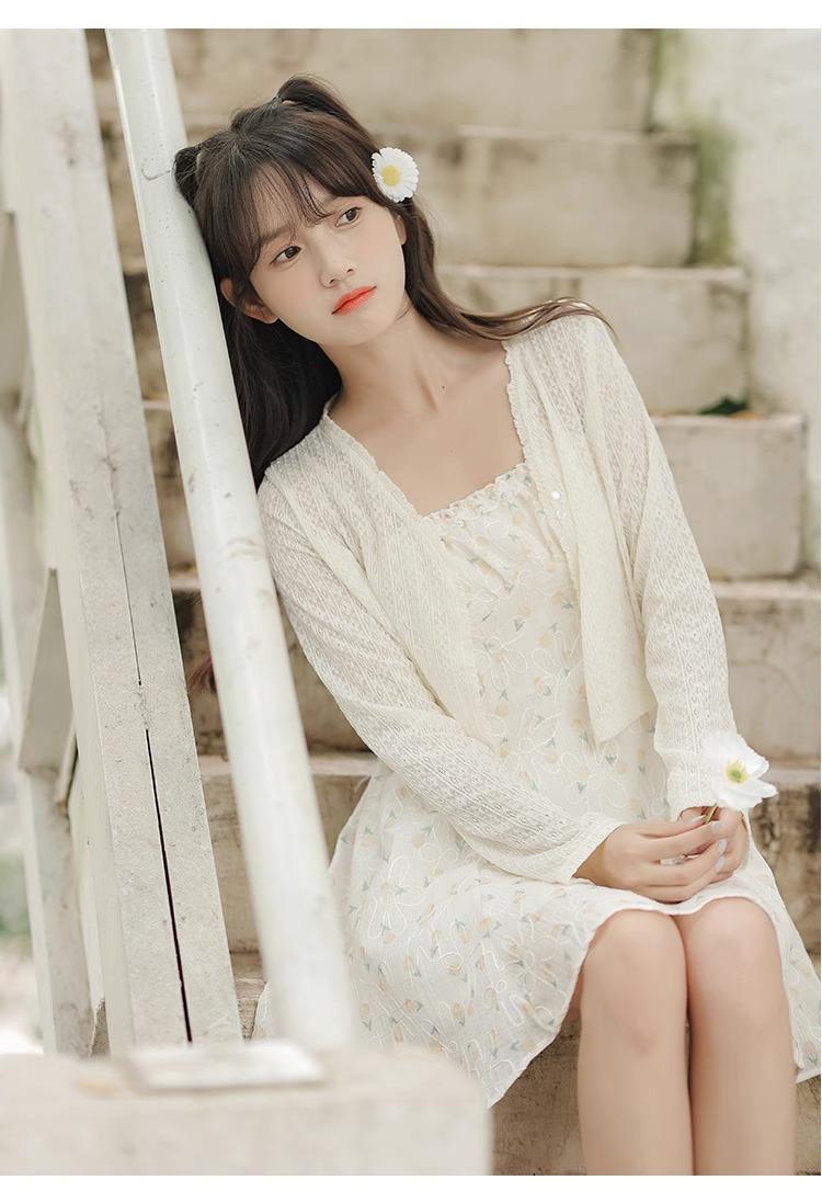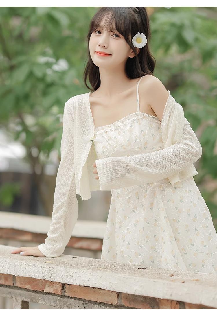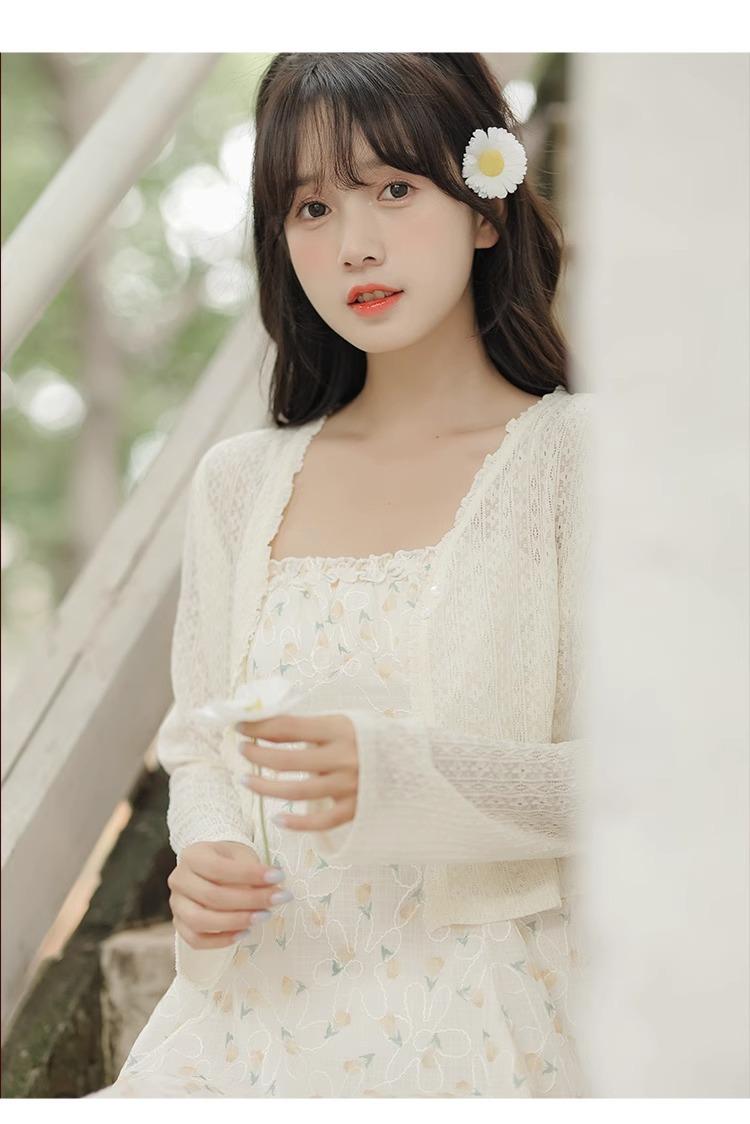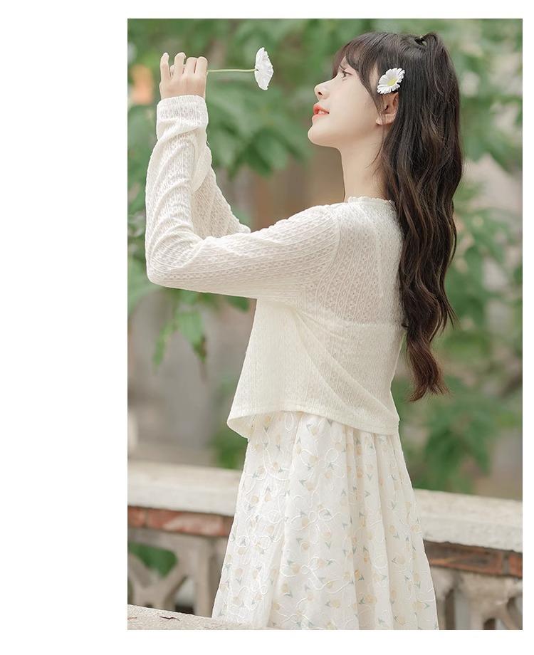 Cardigã Francês de Proteção Solar para Mulheres Usarem no Outono e Verão com Saia Suspensório, Blusa Xale, Jaqueta Pequena com Cintura Marcada Elegante