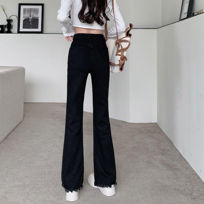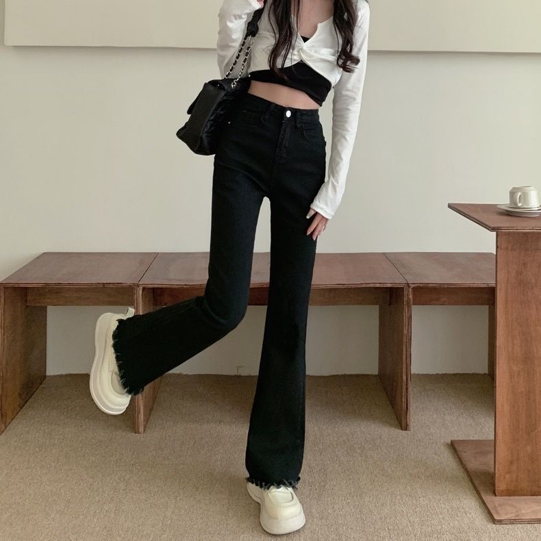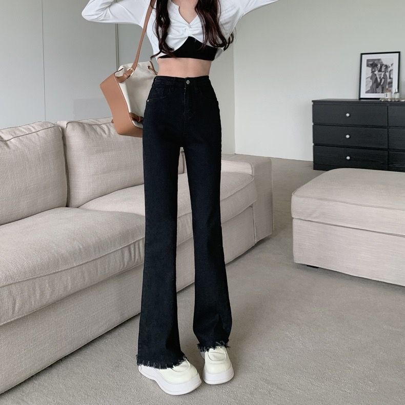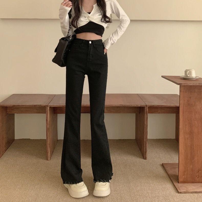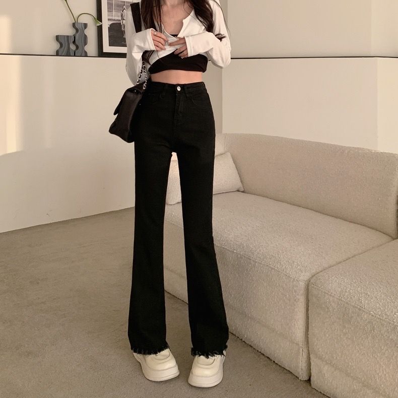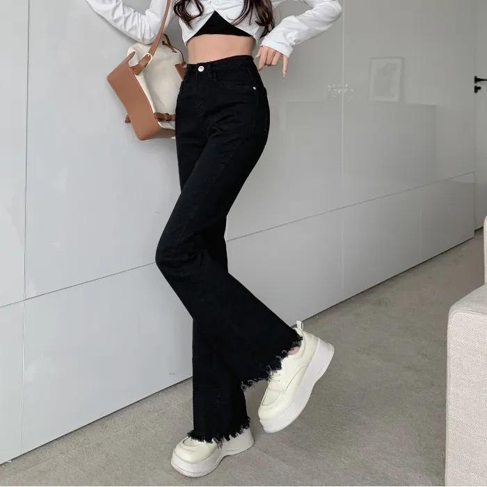Calça jeans preta elástica feminina primavera e outono 2023, nova cintura alta, slim, all-match, perna larga, fenda, calças da moda