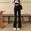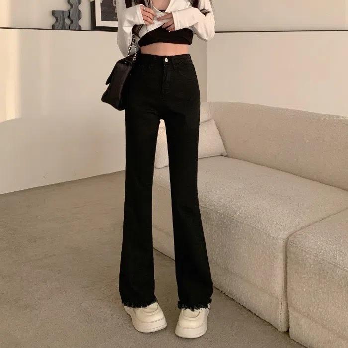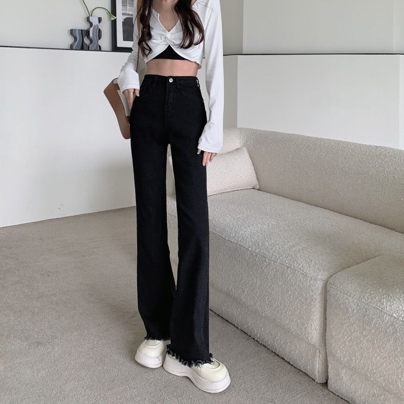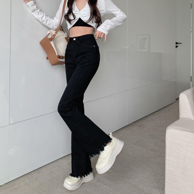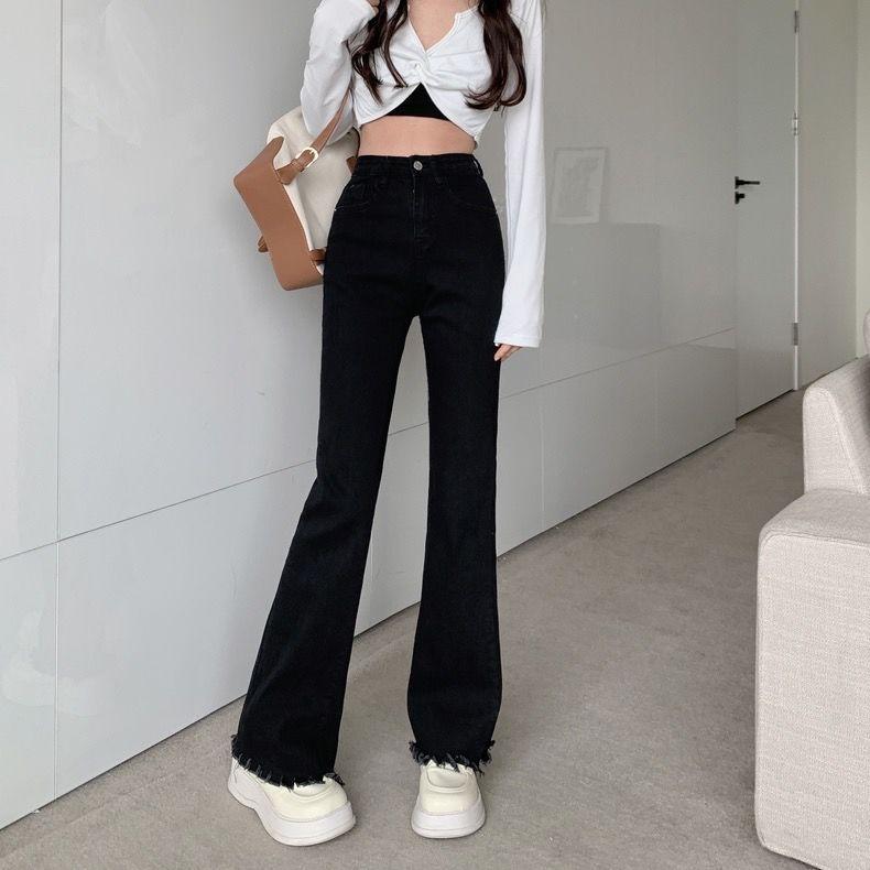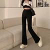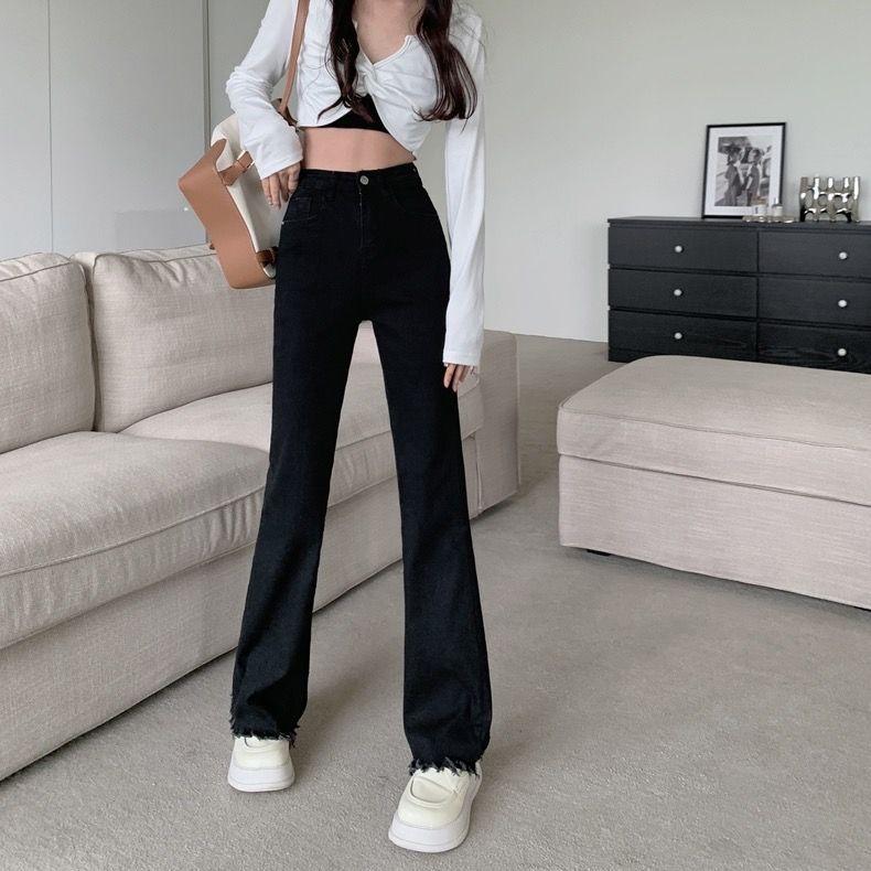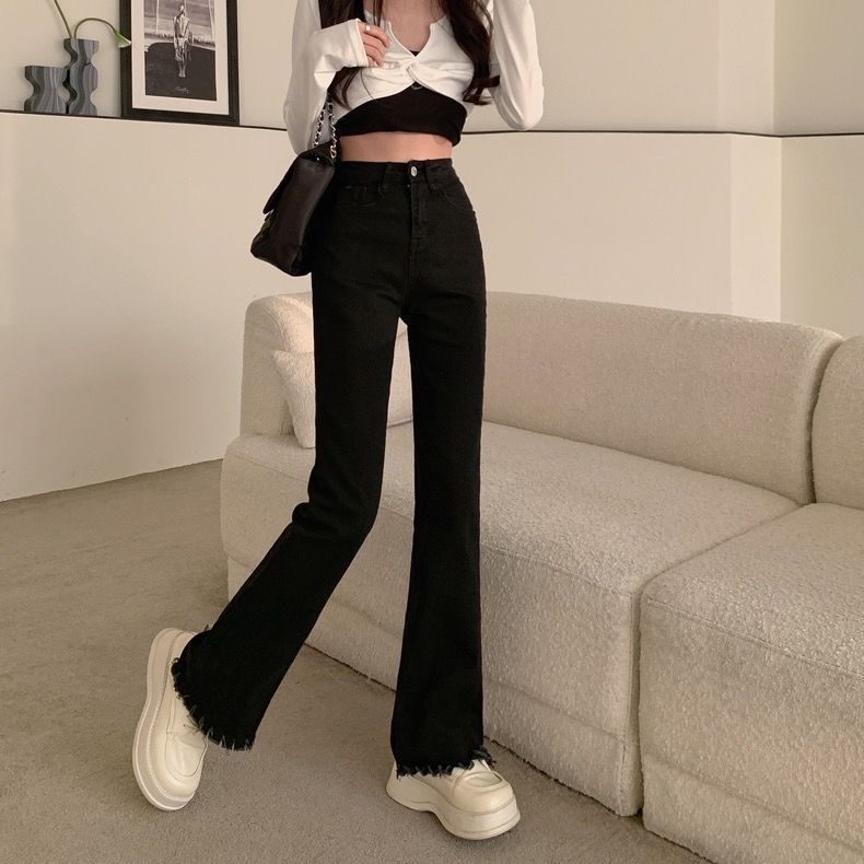 Calça jeans preta elástica feminina primavera e outono 2023, nova cintura alta, slim, all-match, perna larga, fenda, calças da moda