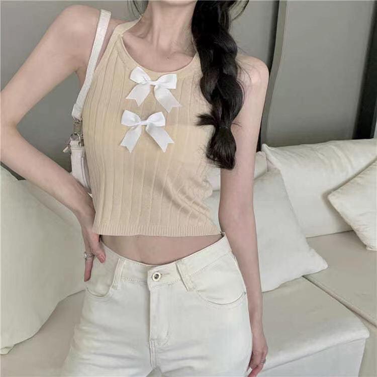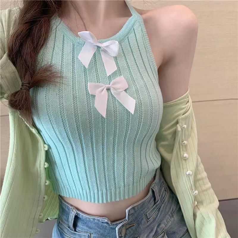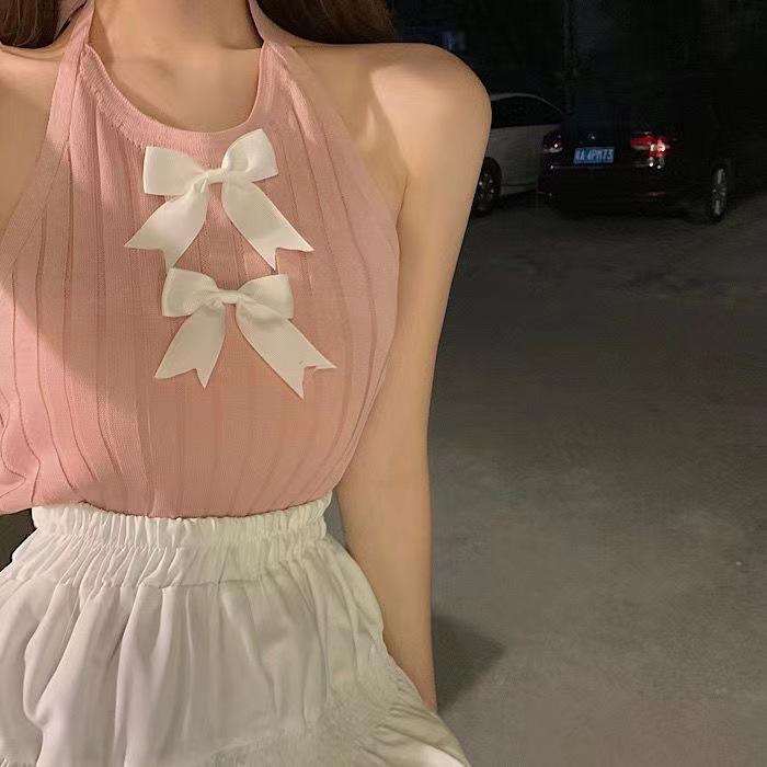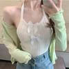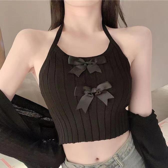 Colete de laço de pescoço branco para mulheres de verão exterior vestindo novo estilo Spice Girl Sling Inner Knitted curto sem mangas