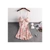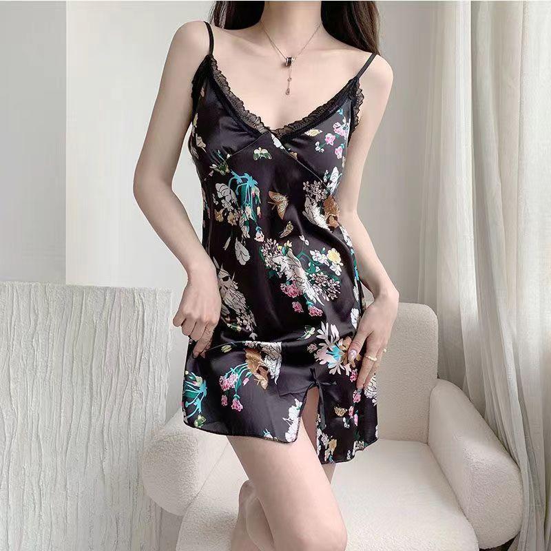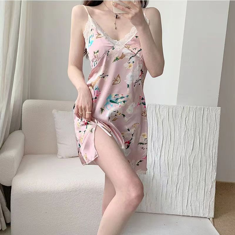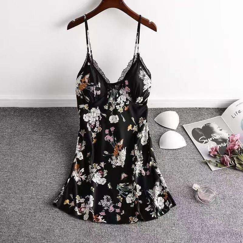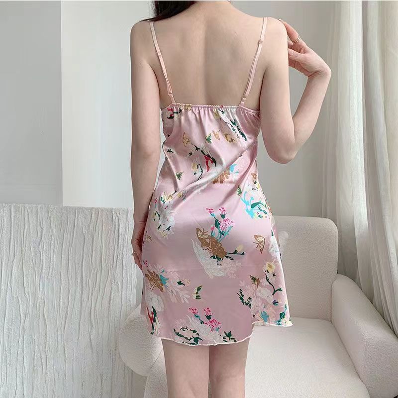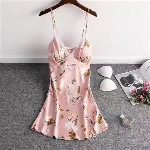 Camisola Sling Verão Feminino Novo Pijama Sexy Ice Silk Impresso Saia Puro Desejo Feminino com Almofada no Peito Roupas para Casa