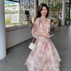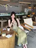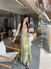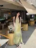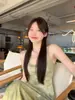 Vestido Sling Vintage Verão Feminino Novo Verde Francês Vestido Longo Elegante Cintura Emagrecimento A- Vestido de Linha