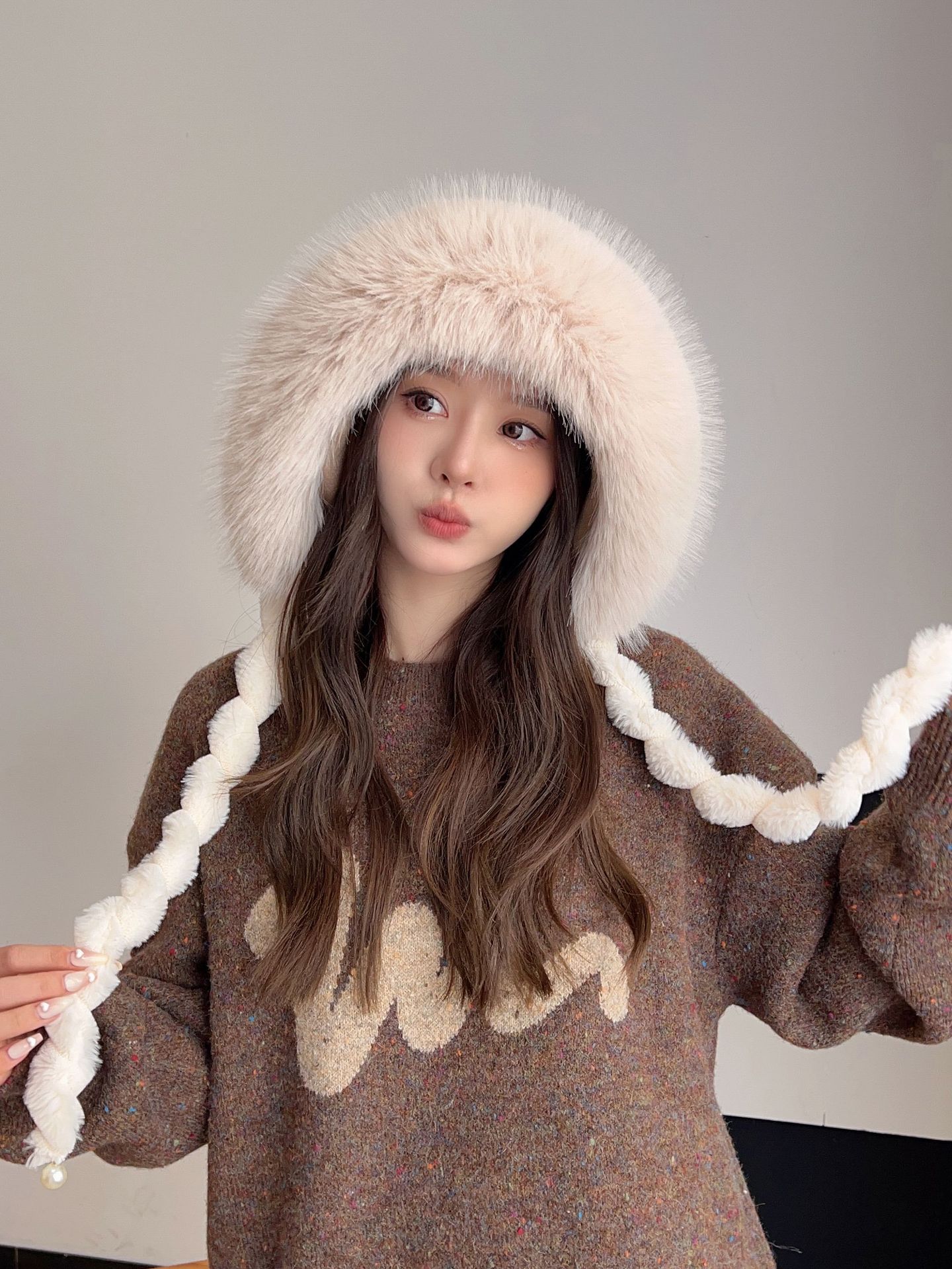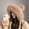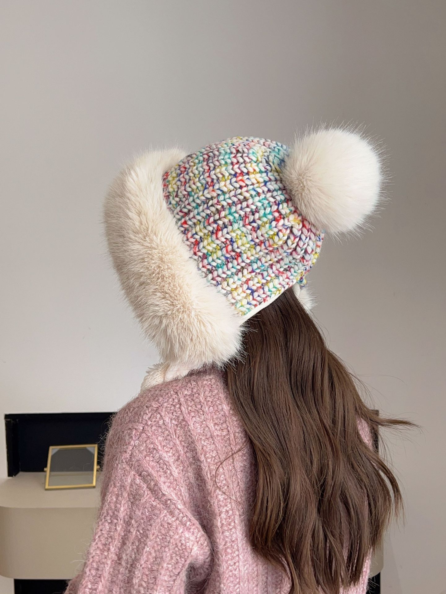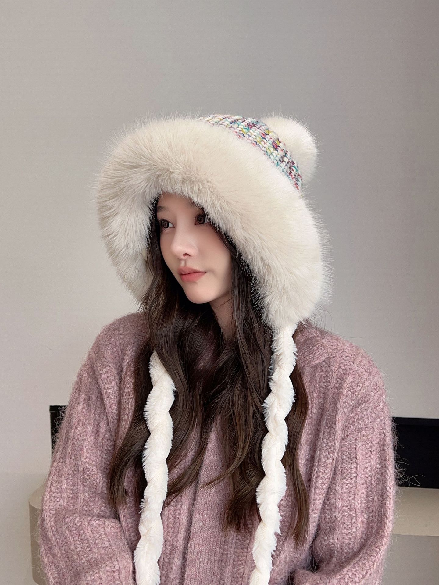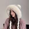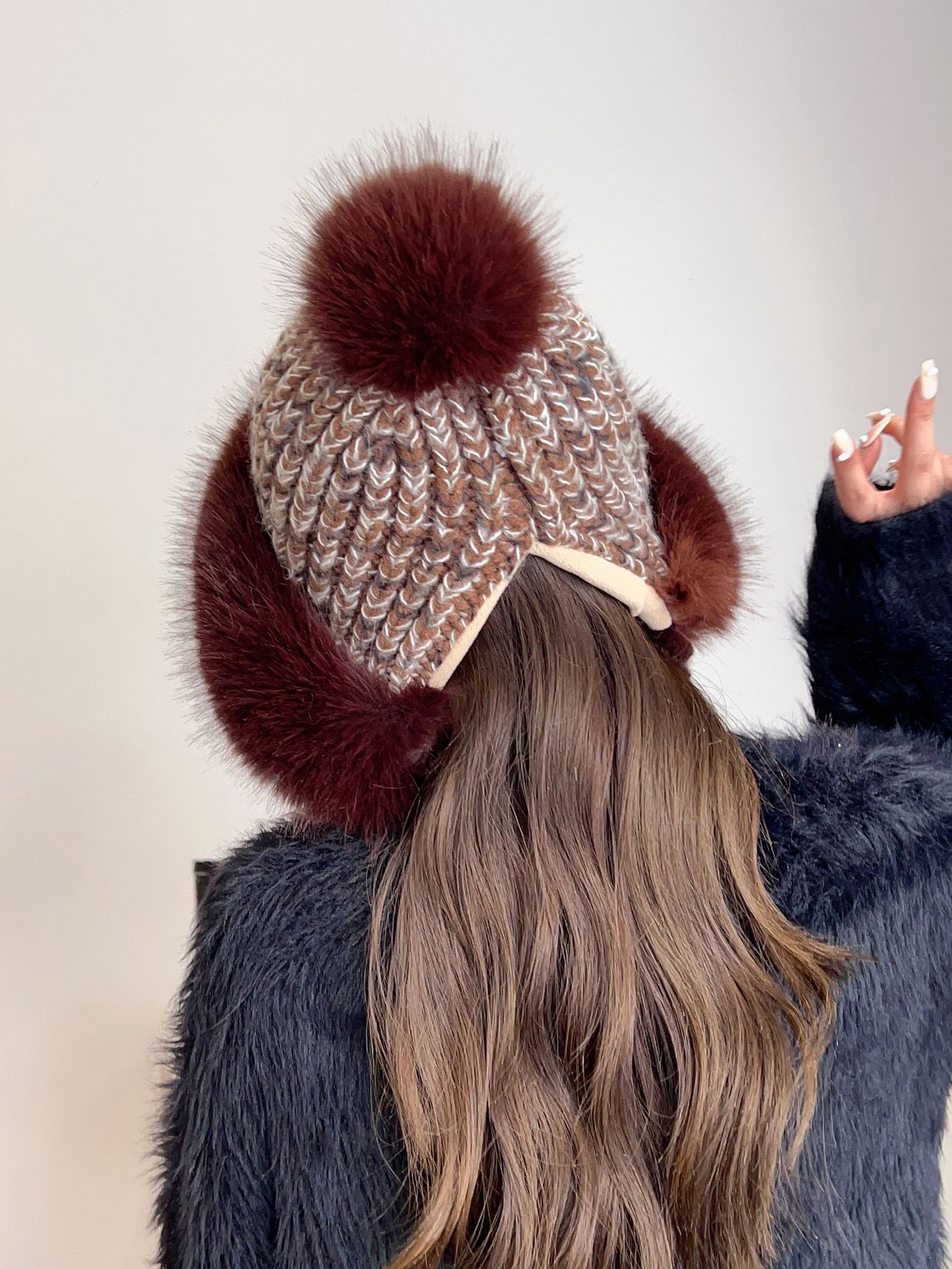 Chapéu de malha com bola de pelo quente e forrado de lã, chapéu de Lei Feng à prova de frio, chapéu coreano de proteção auricular de pelúcia para outono e inverno para mulheres