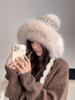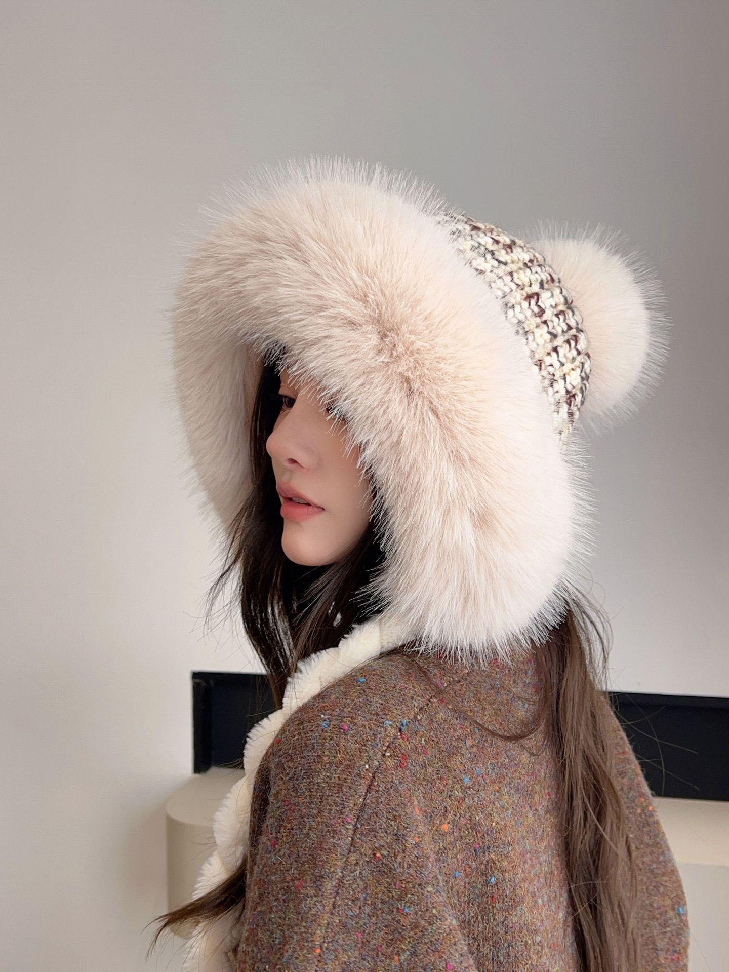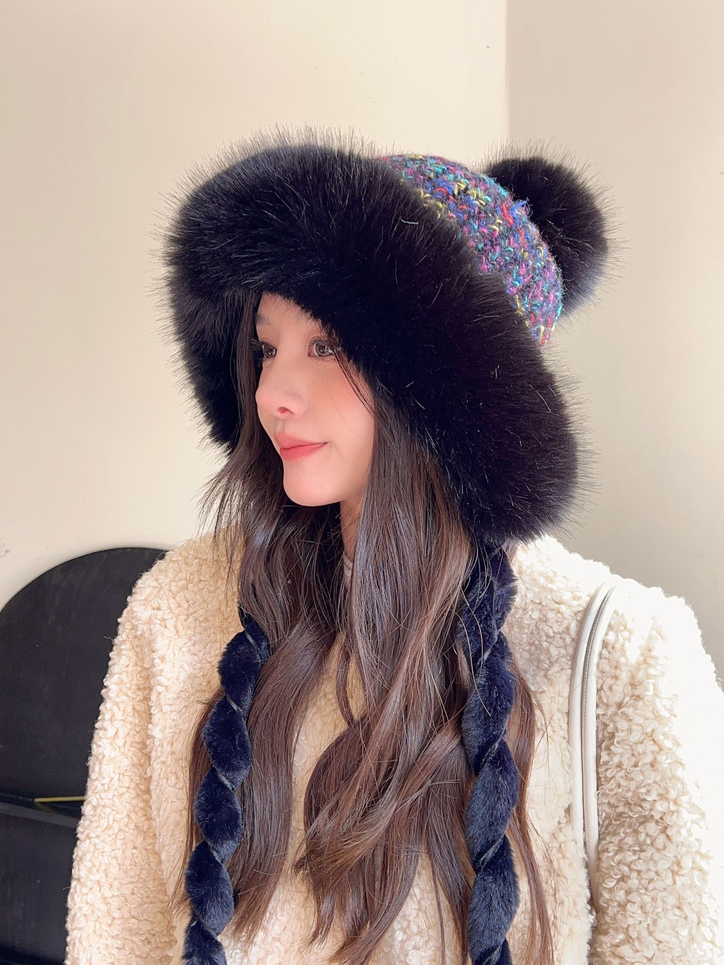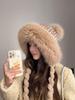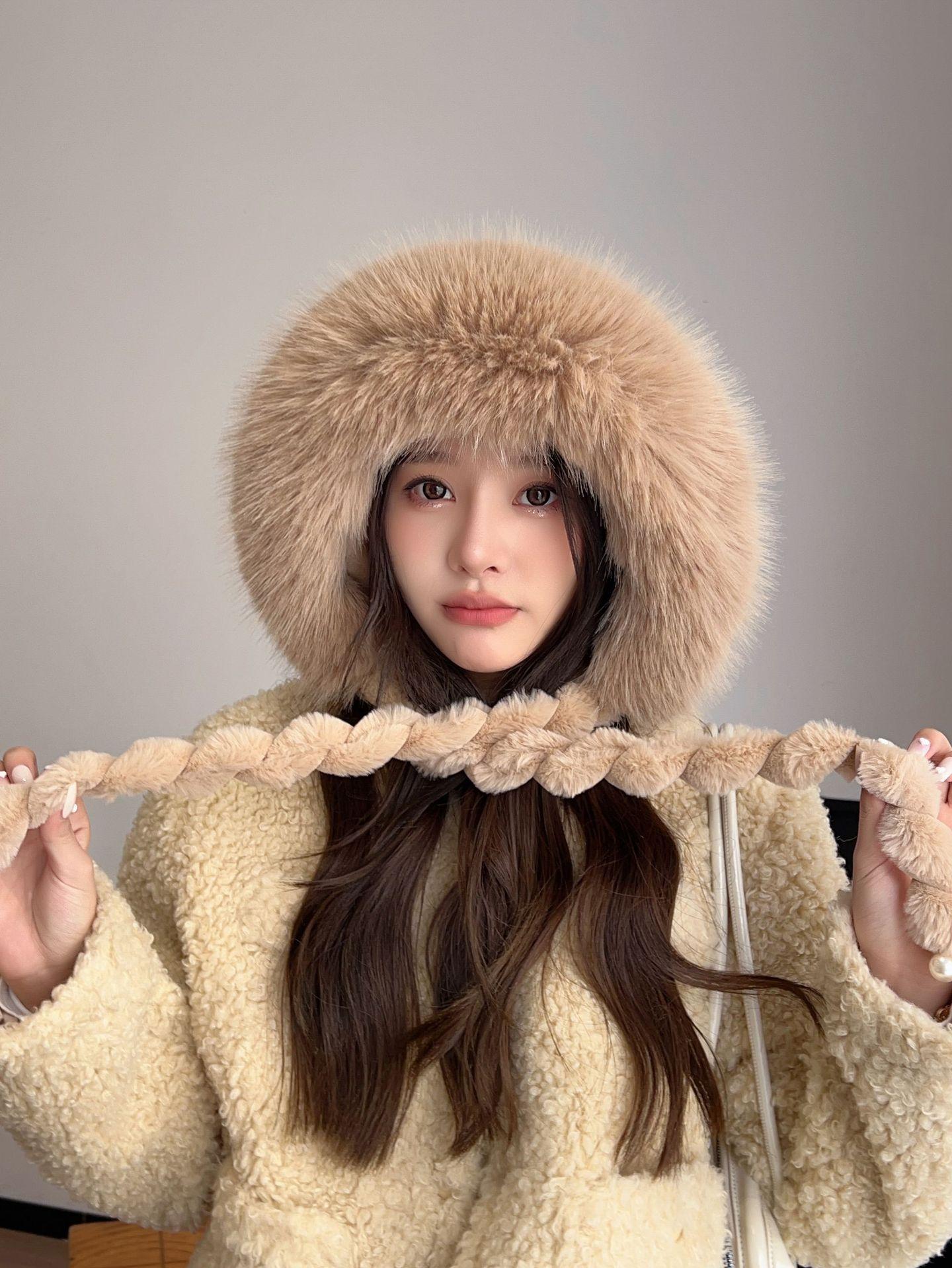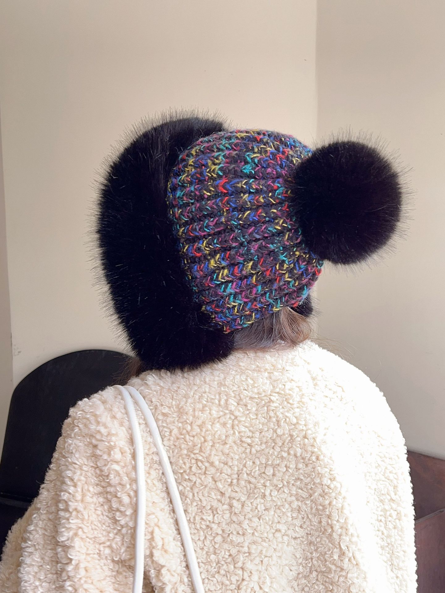Chapéu de malha com bola de pelo quente e forrado de lã, chapéu de Lei Feng à prova de frio, chapéu coreano de proteção auricular de pelúcia para outono e inverno para mulheres
