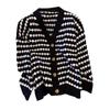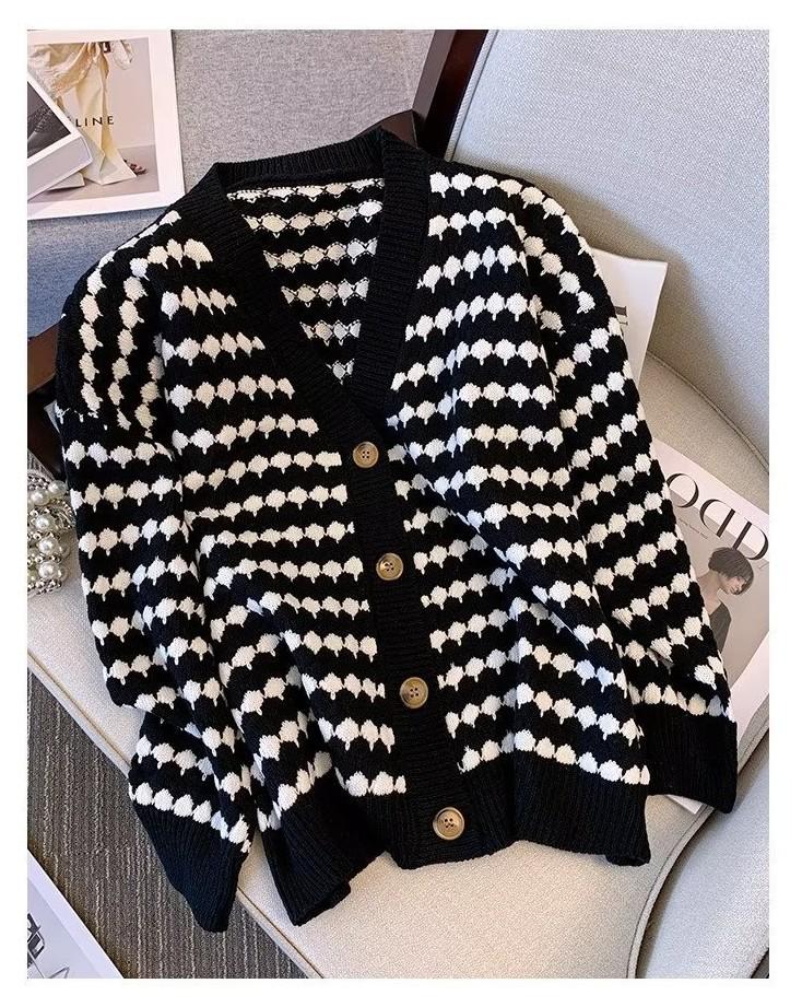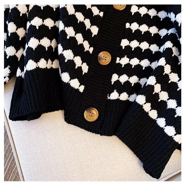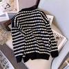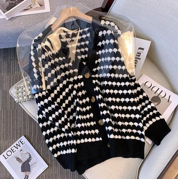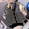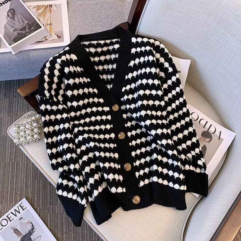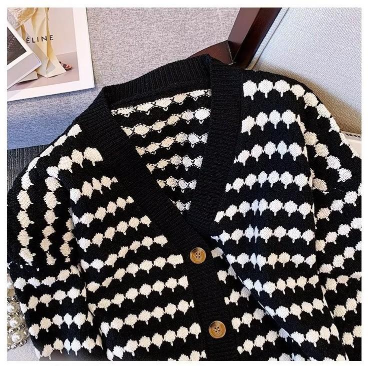 Casaco Feminino de Outono e Inverno Novo Elegante Exterior Equitação Suéter de Malha Listrado Contraste Cor Base Suéter Cardigã Feminino com Decote em V